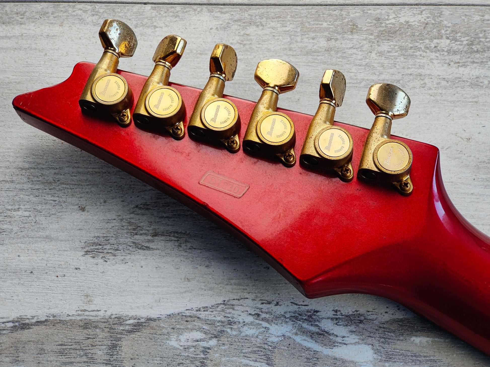 Weighs 3.8kg's. This one's in very clean condition as pictured (especially for a pointy 80's guitar) with only basic cosmetic wear and tear from general use. Received a full professional setup and service prior to listing, the frets are shiny and smooth with plenty of life left and the neck is straight with a fully functional truss.