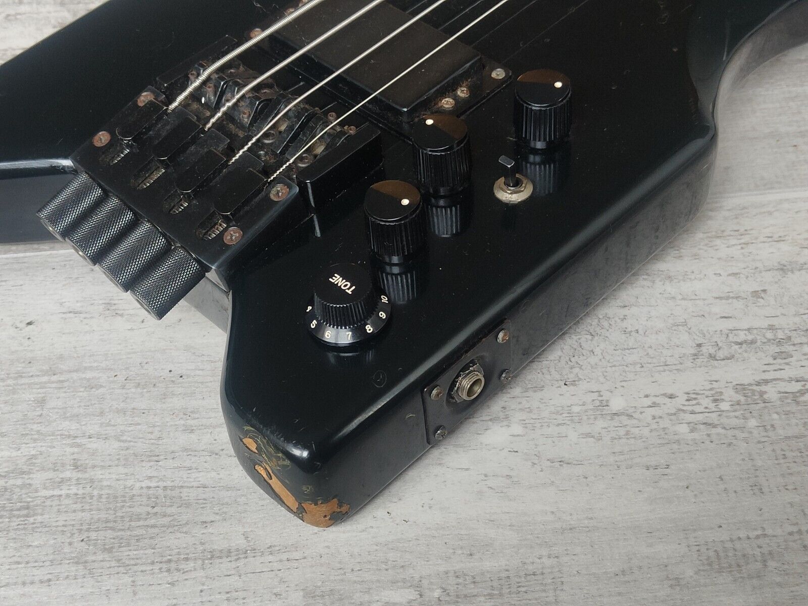 Japanese made in the late 1980's, the Interceptor bass took inspiration from many of the other headless models made during the same time. A very geometric compact body with a contoured leg cutout for comfortable seated playing, bolt on painted maple neck with a 24 fret rosewood fingerboard, locking nut (so it uses regular single-ball bass strings), it weighs 2.9kg's. Features two passive bass humbuckers along with a toggle to activate the factory boost circuit for an added thump.