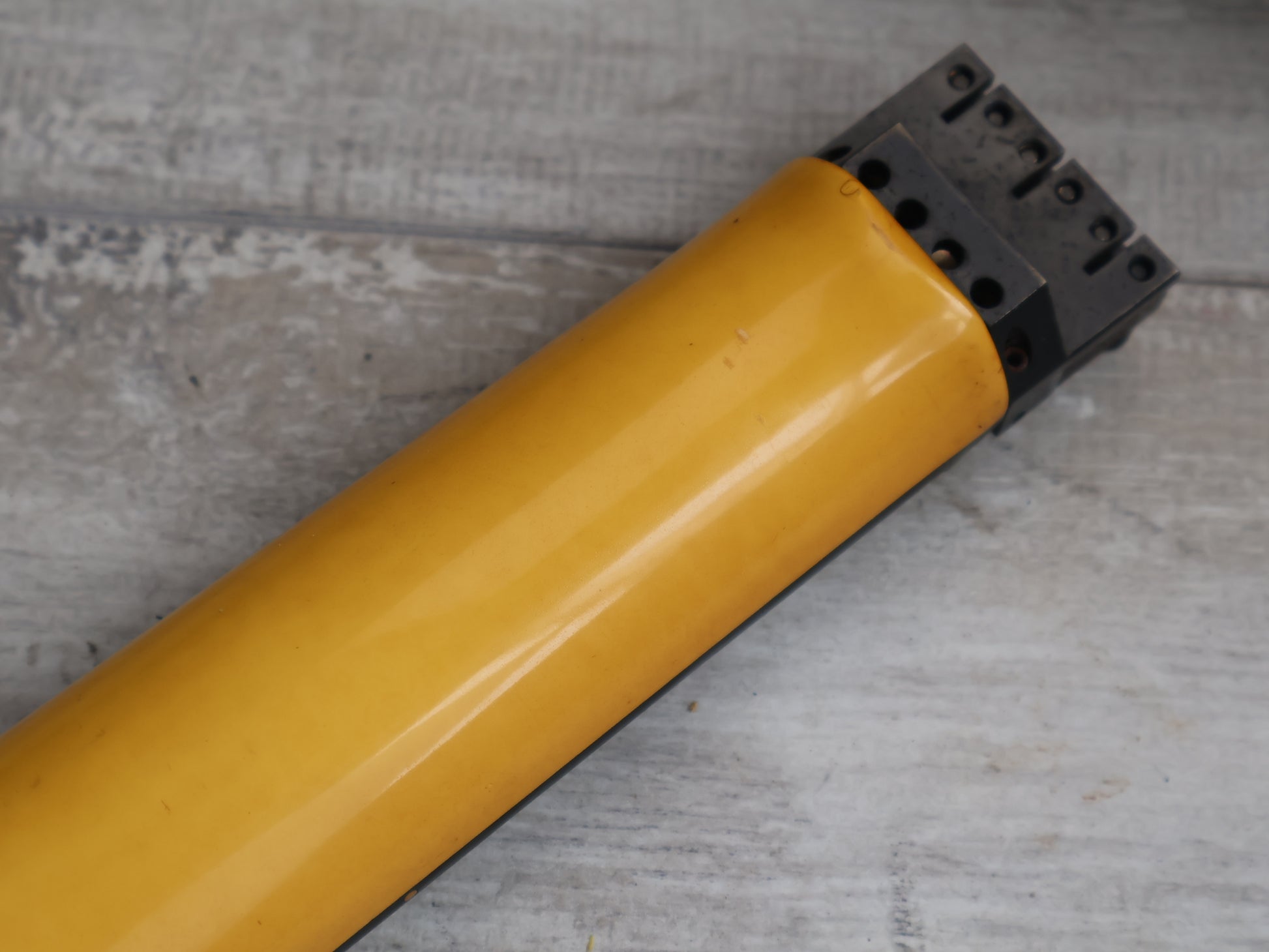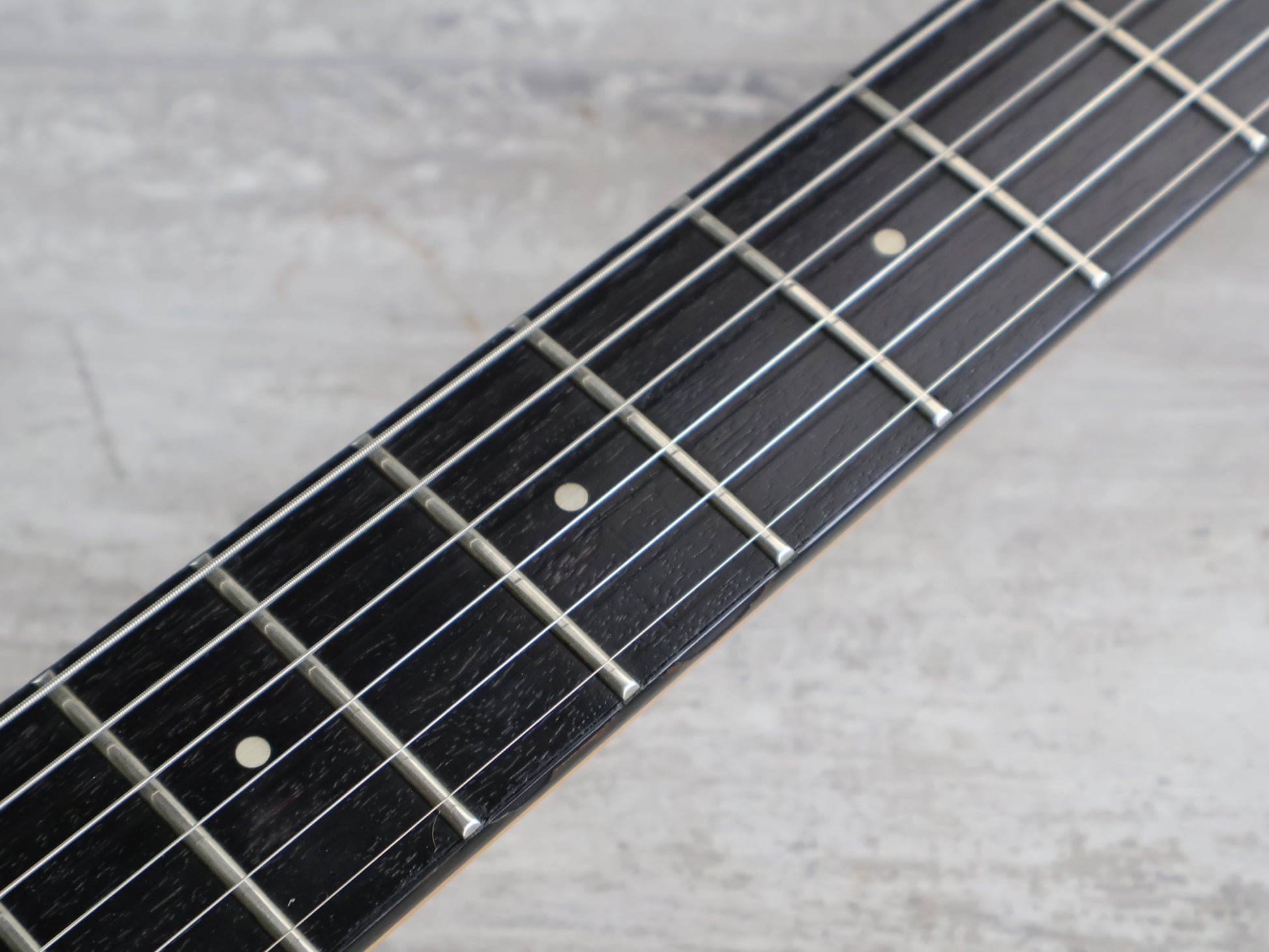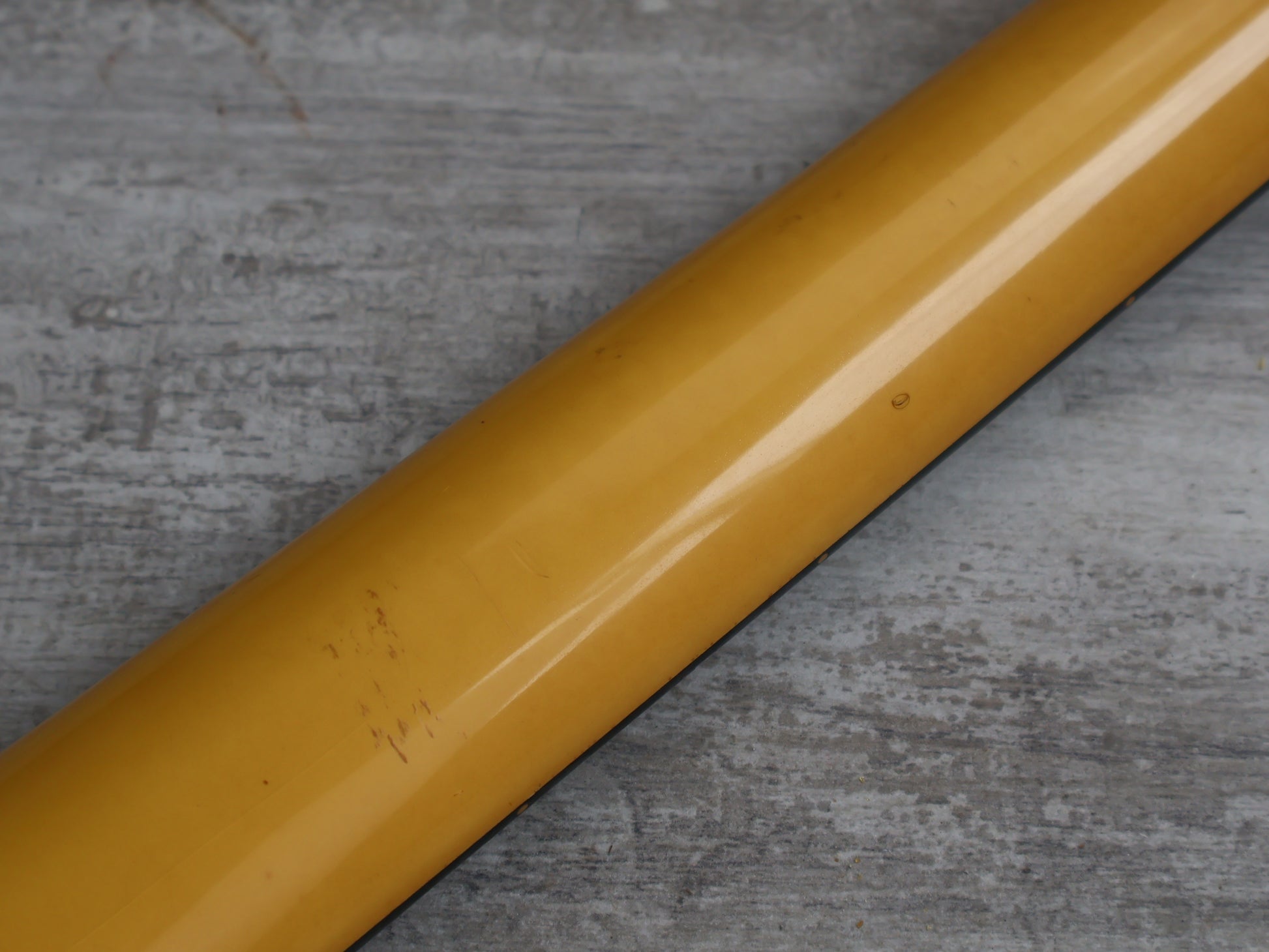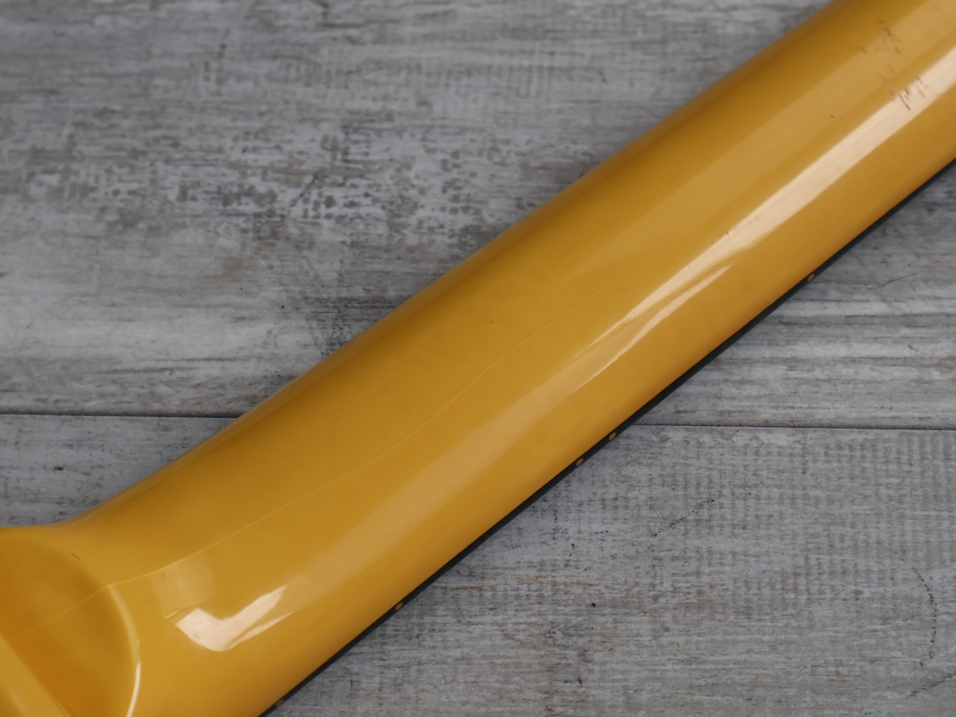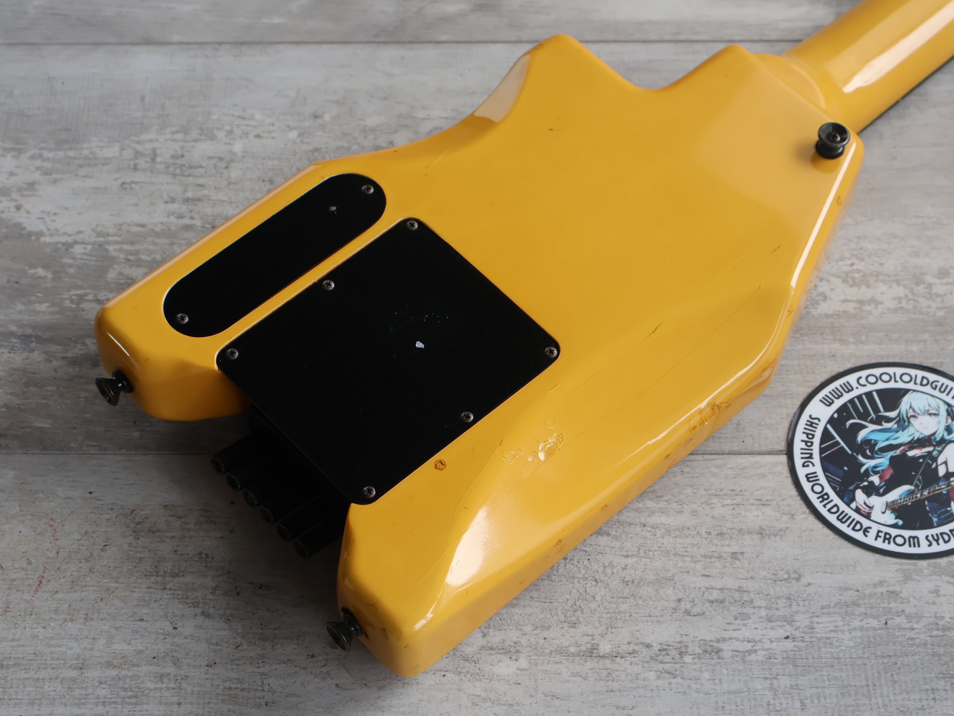 Given a full setup and service prior to listing, the neck is straight and the truss works perfectly, the frets are shiny and smooth with life left. The finish was likely originally white and has faded to a yellow tinge over the years, there's plenty of cracks in the paint but no structural damage or repairs.