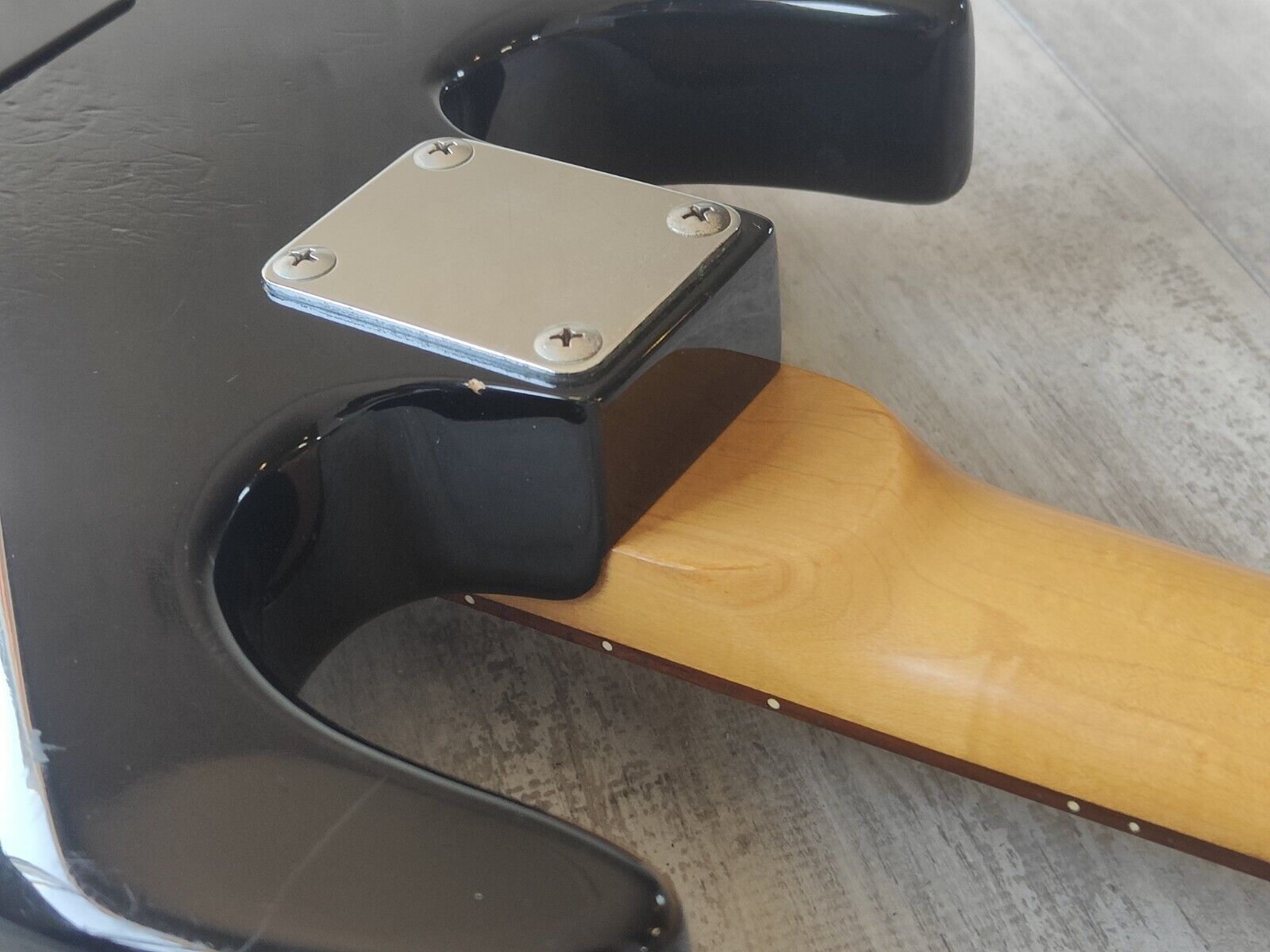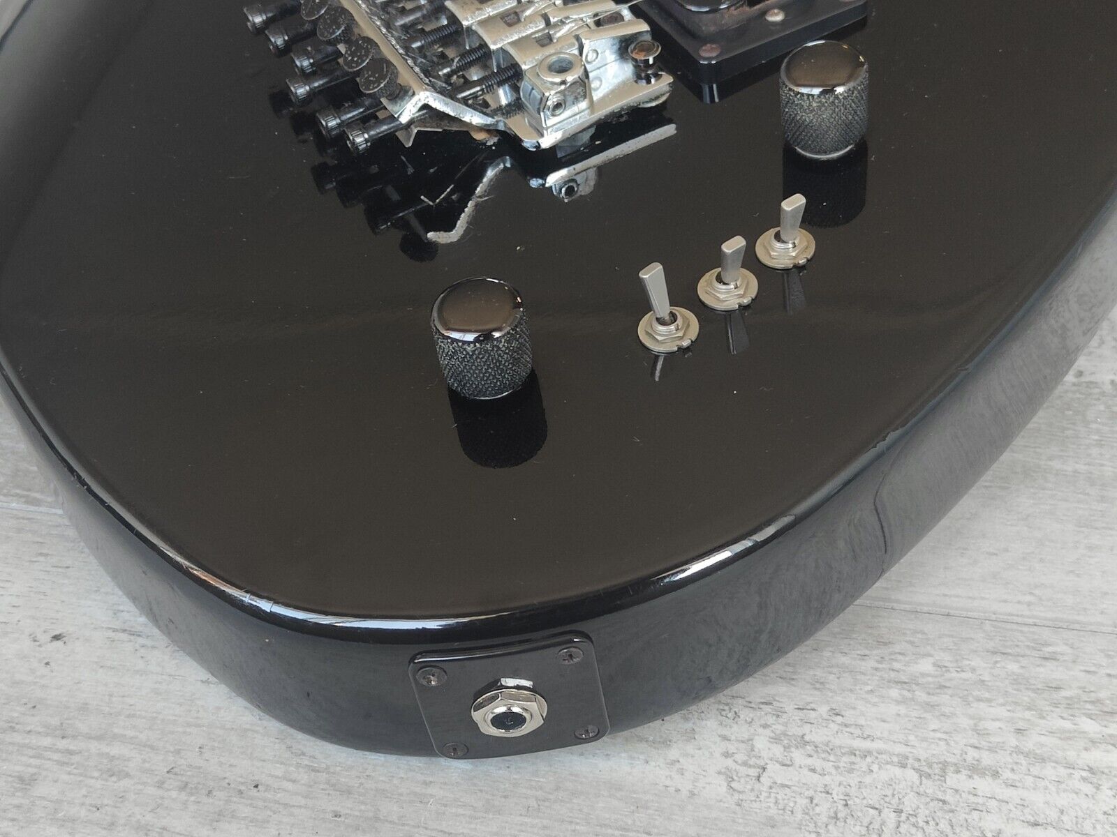 Part of the NJ series of Japanese made guitars from the 1980's, this is a BC Rich ST-III model in gloss black with a matching headstock. Maple neck with a 22 fret rosewood fingerboard, it weighs 3.6kg's. Loaded with the original BC Rich HSS pickups controlled by on/off toggles and a master volume/tone control. R stamped tuners and a licensed Floyd Rose tremolo system keep it tuned to perfection.