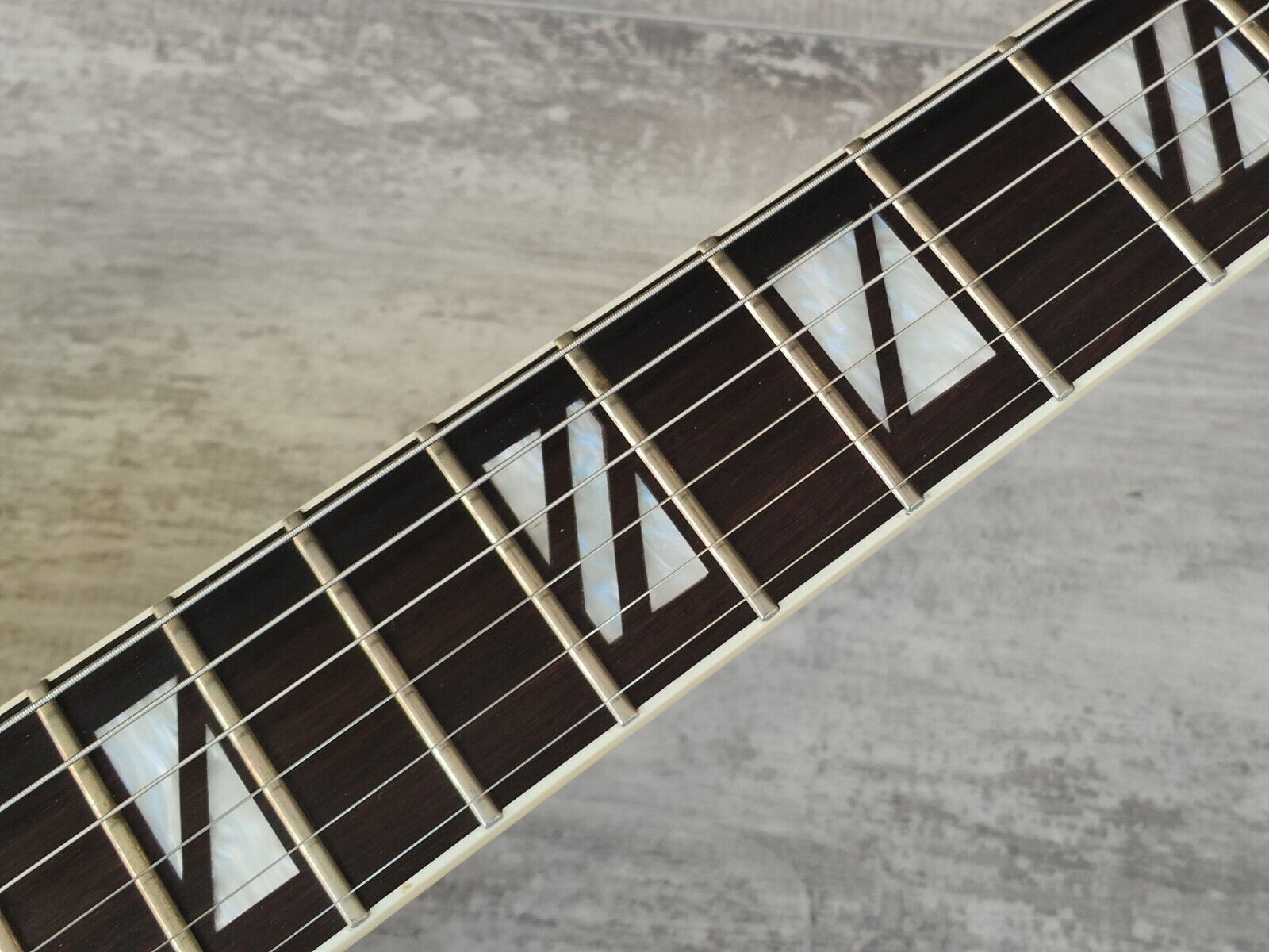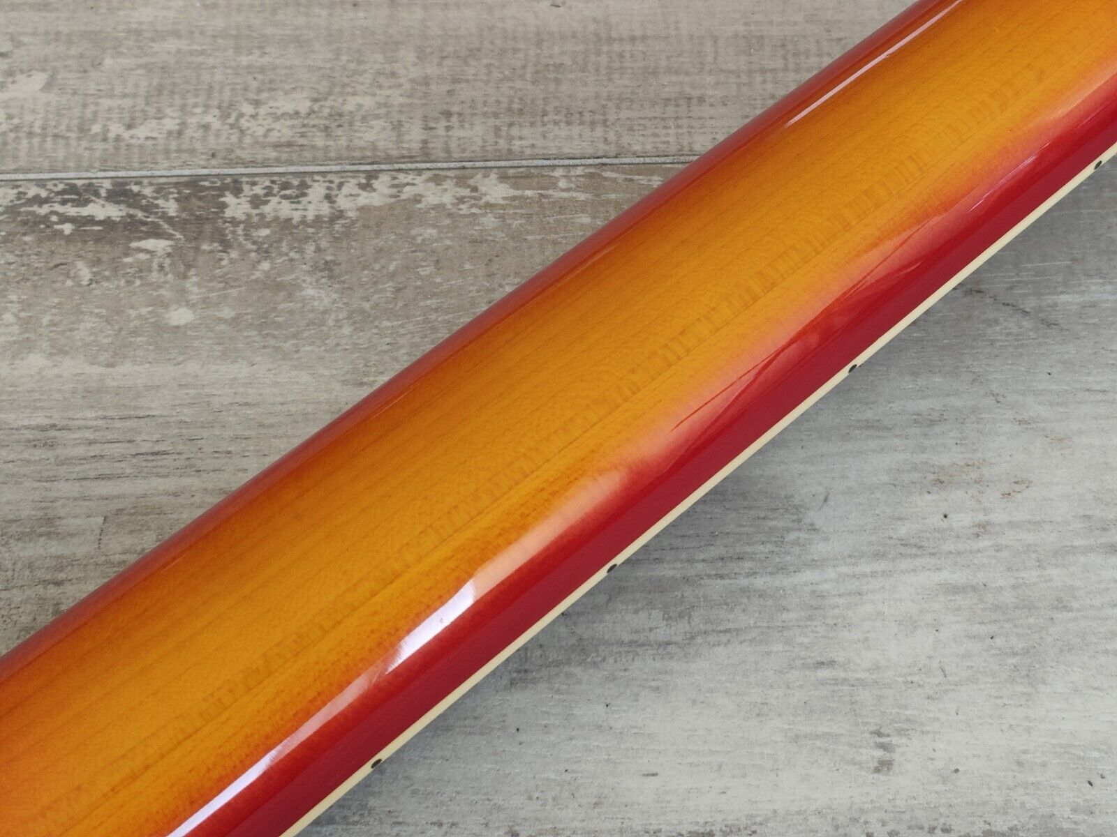 Japanese made Burny guitars are held in high regard in the guitar community and it's very easy to see why. Made in very limited numbers in 1986, this RSC-80 was Burny's Cherry Sunburst replica of the Gibson Les Paul Supreme. Laminate figuring with a solid maple top on a mahogany body with a three-piece maple neck and a rosewood fingerboard with split block inlays, it weighs 4.1kg's. This one has aftermarket wiring harness and some generic Zebra humbuckers, aftermarket cavity covers, bridge, tailpiece and Gotoh tuners. The pickup routes have been slightly enlarged by the previous owner and there's a small gap between the current ring and the body as pictured.