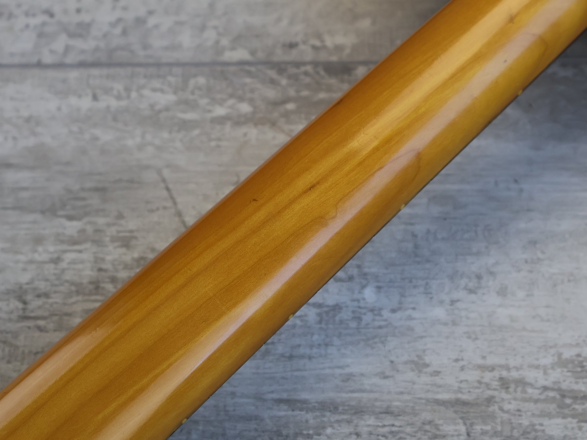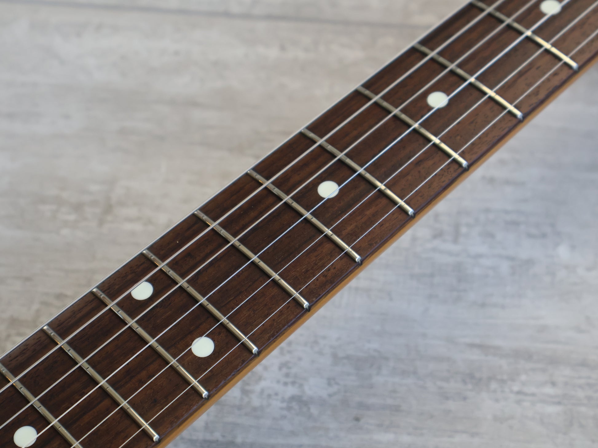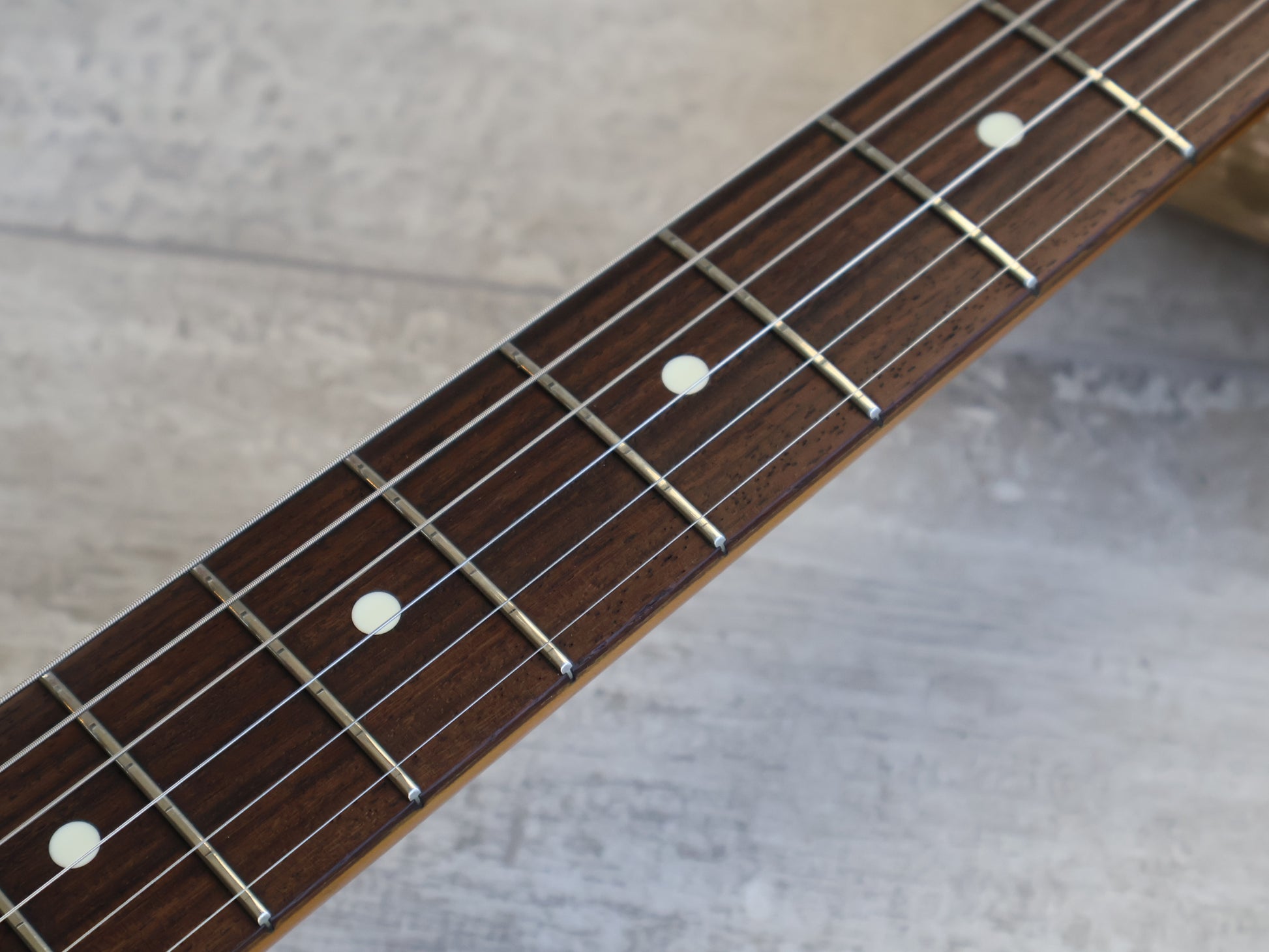 Given a basic setup and service prior to listing including a fret polish, fretboard oil and truss adjustment, there's some light wear to the frets but they still play smooth and the straight neck plays well. The body has been heavily relic'd over the years but has no structural issues, just plenty of cosmetic wear as pictured.