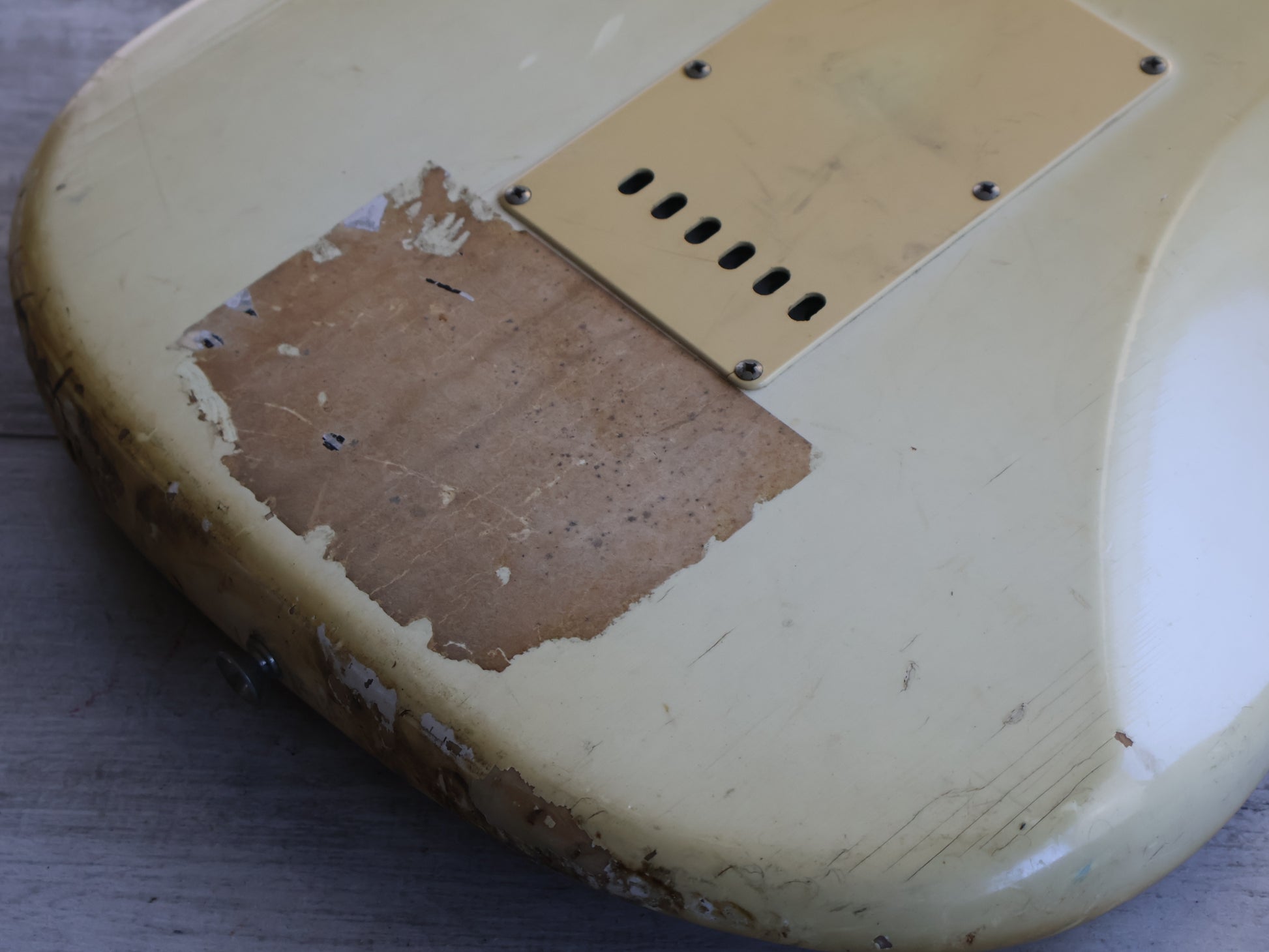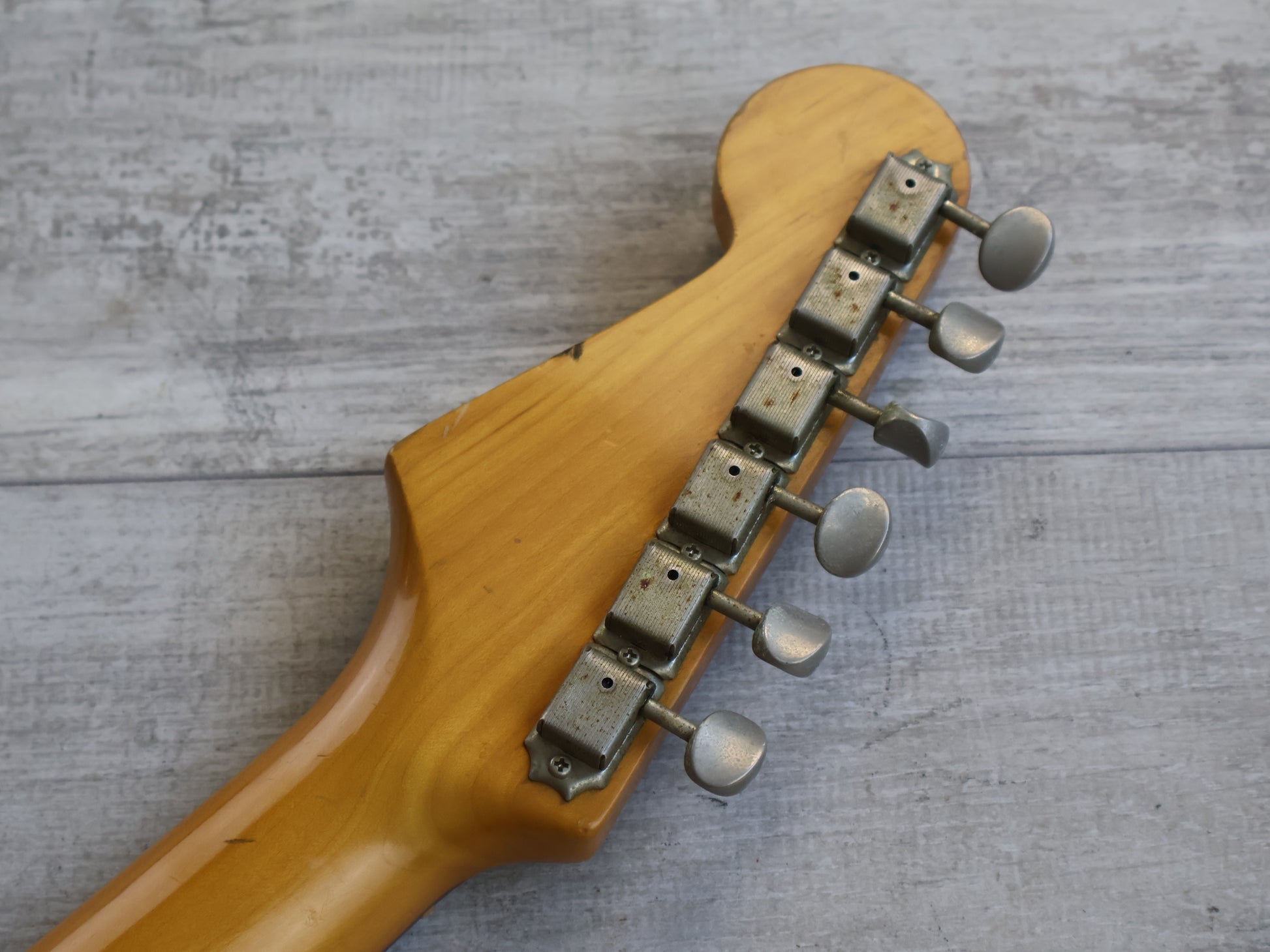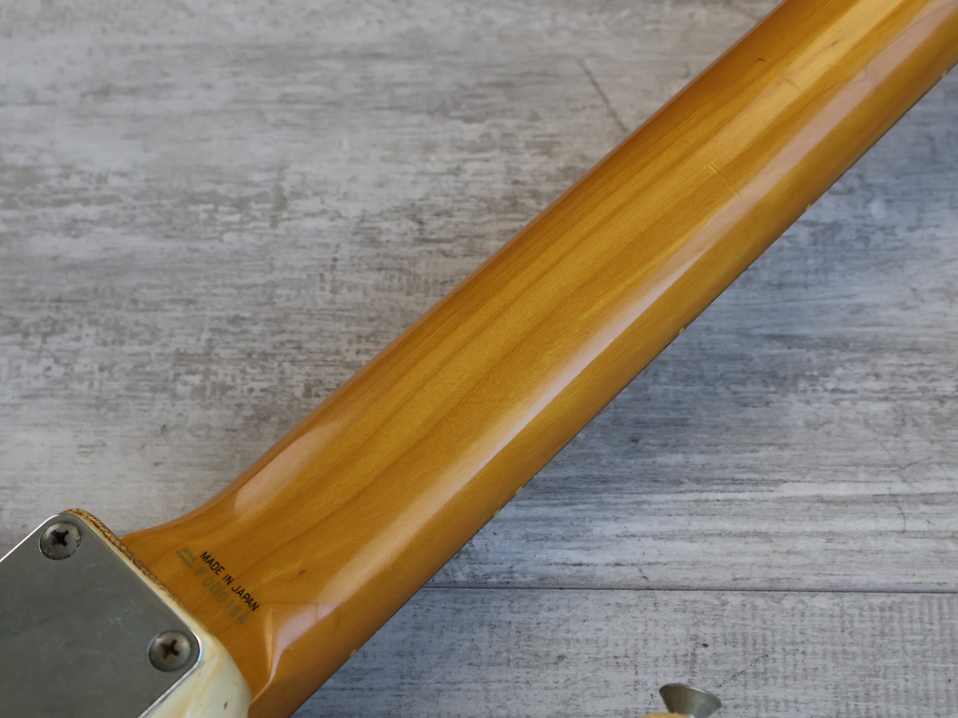 Made by the Fujigen factory in 1986, the ST62-55 was a '62 reissue model featuring a basswood body with a heavily worn and faded Vintage White finish bolted to a maple neck shaped with the classic slim C neck profile (7.25" radius, 43mm nut, 648mm scale length). Weighing 3.4kg's, it's loaded with the original hardware with an unbranded replacement neck pickup and 5-way switch.