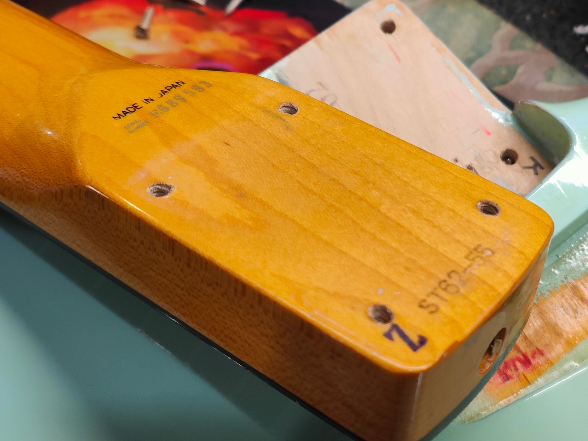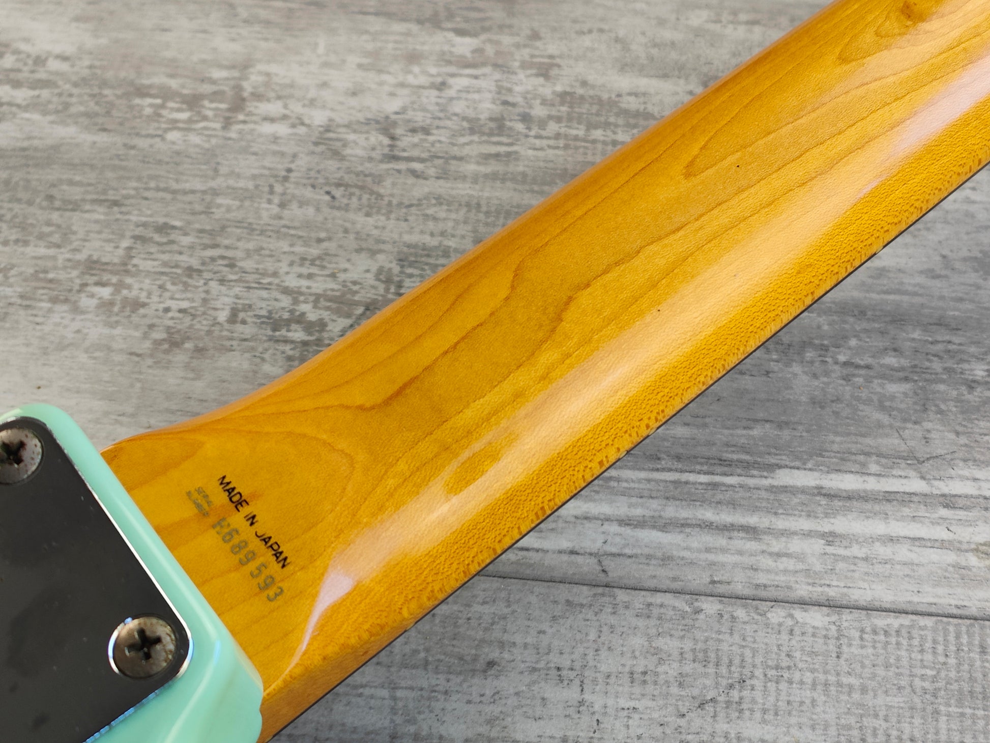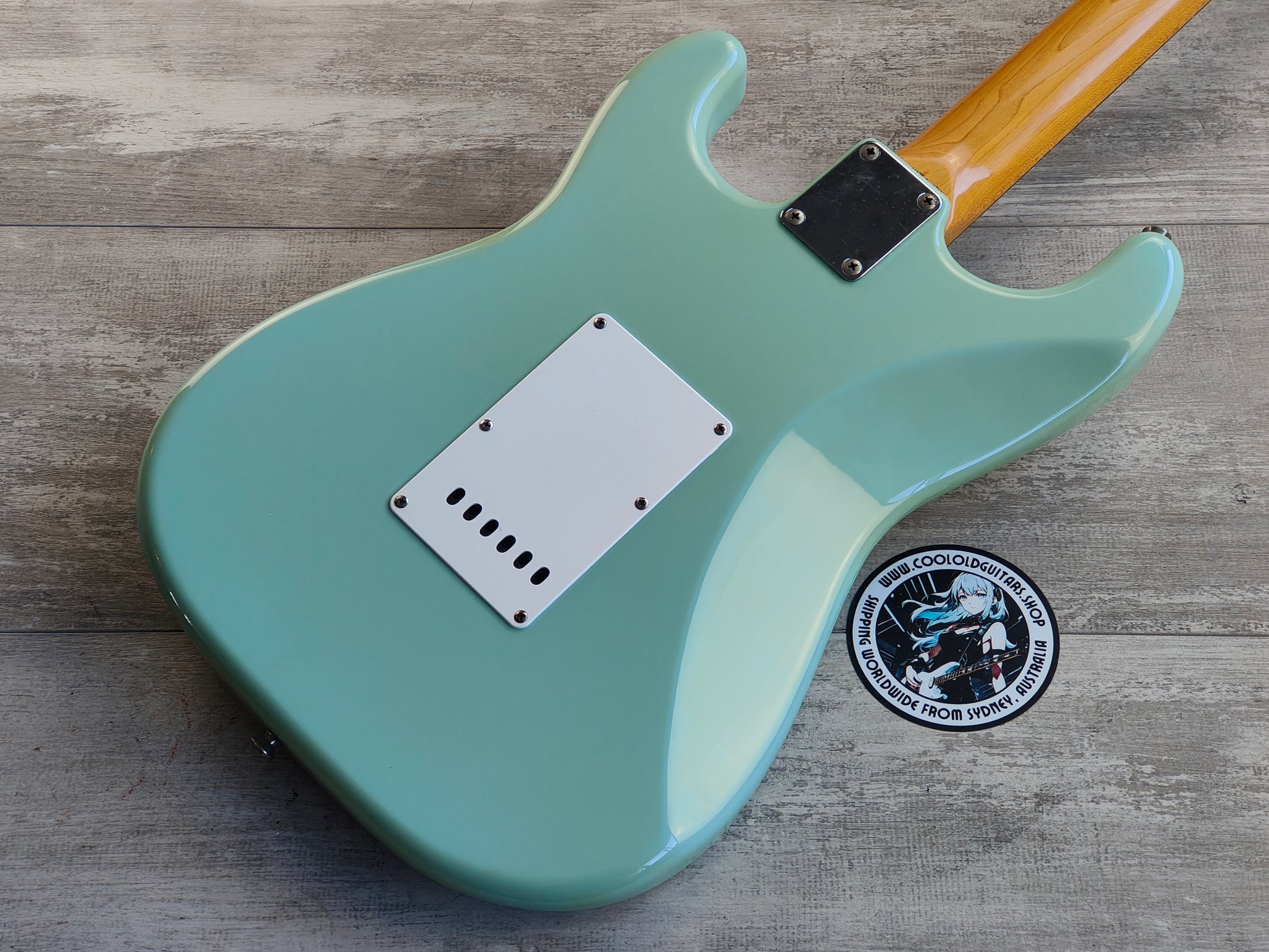 Made by the Fujigen factory as part of the fabled "Fender Japan E Series", this was an Order Made model ST62 that was made specifically to a customer's specs in 1986. Solid alder body with what looks to be a Sonic Blue finish that's faded to something closer to Daphne Blue (with a hint of Seafoam) bolted to a '62 profile maple neck and slab rosewood fingerboard (42mm nut width, 7.25" radius), it weighs 3.8kg's. Loaded with a set of Fender US Vintage single coils with Japanese pots and wiring along with the original Fender bridge with stamped saddles and vintage style tuners.