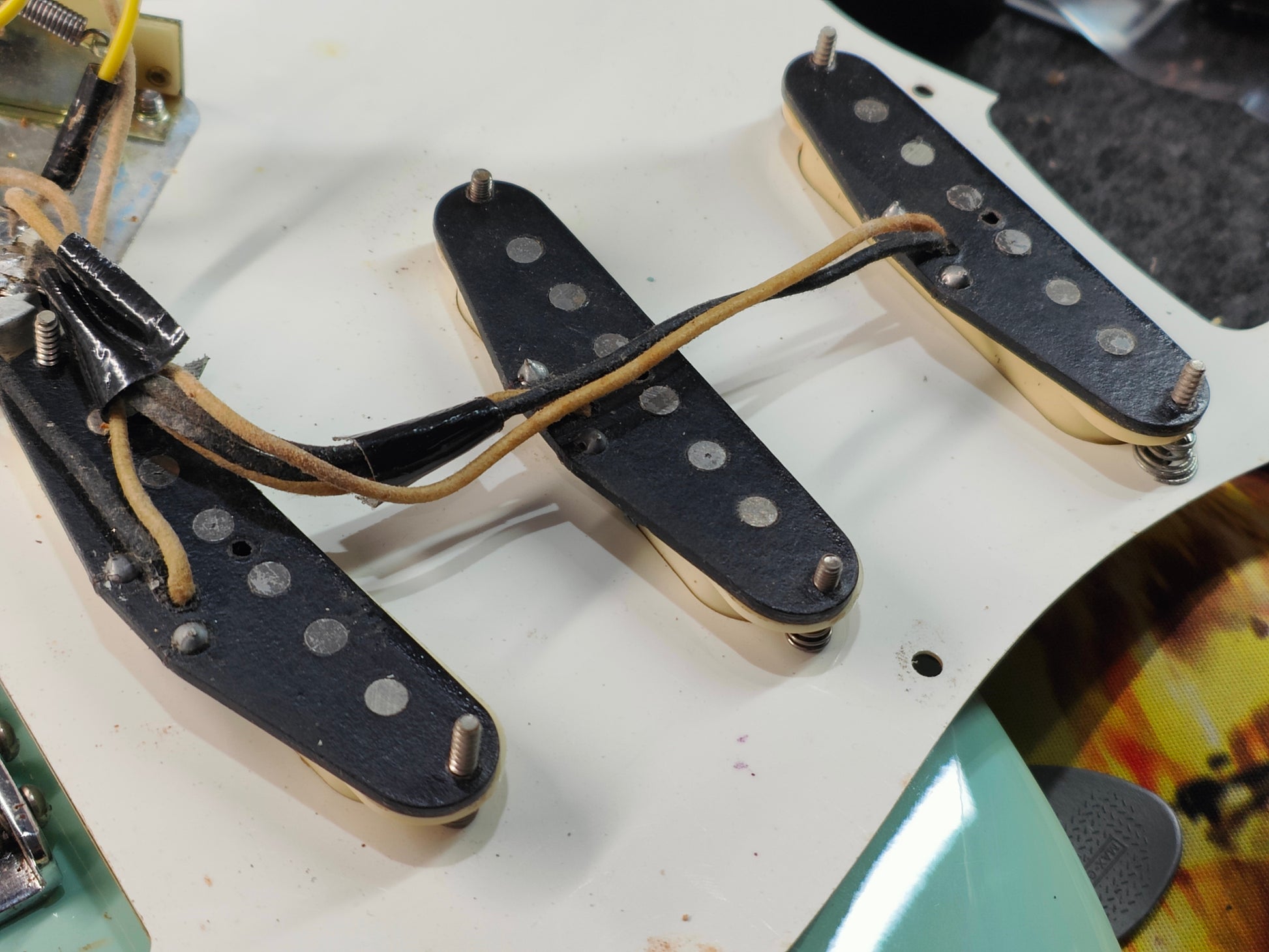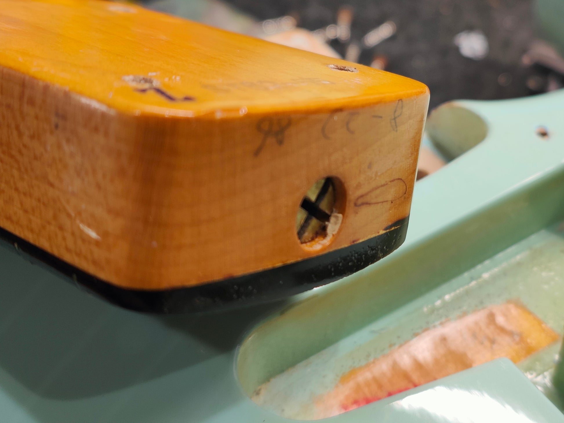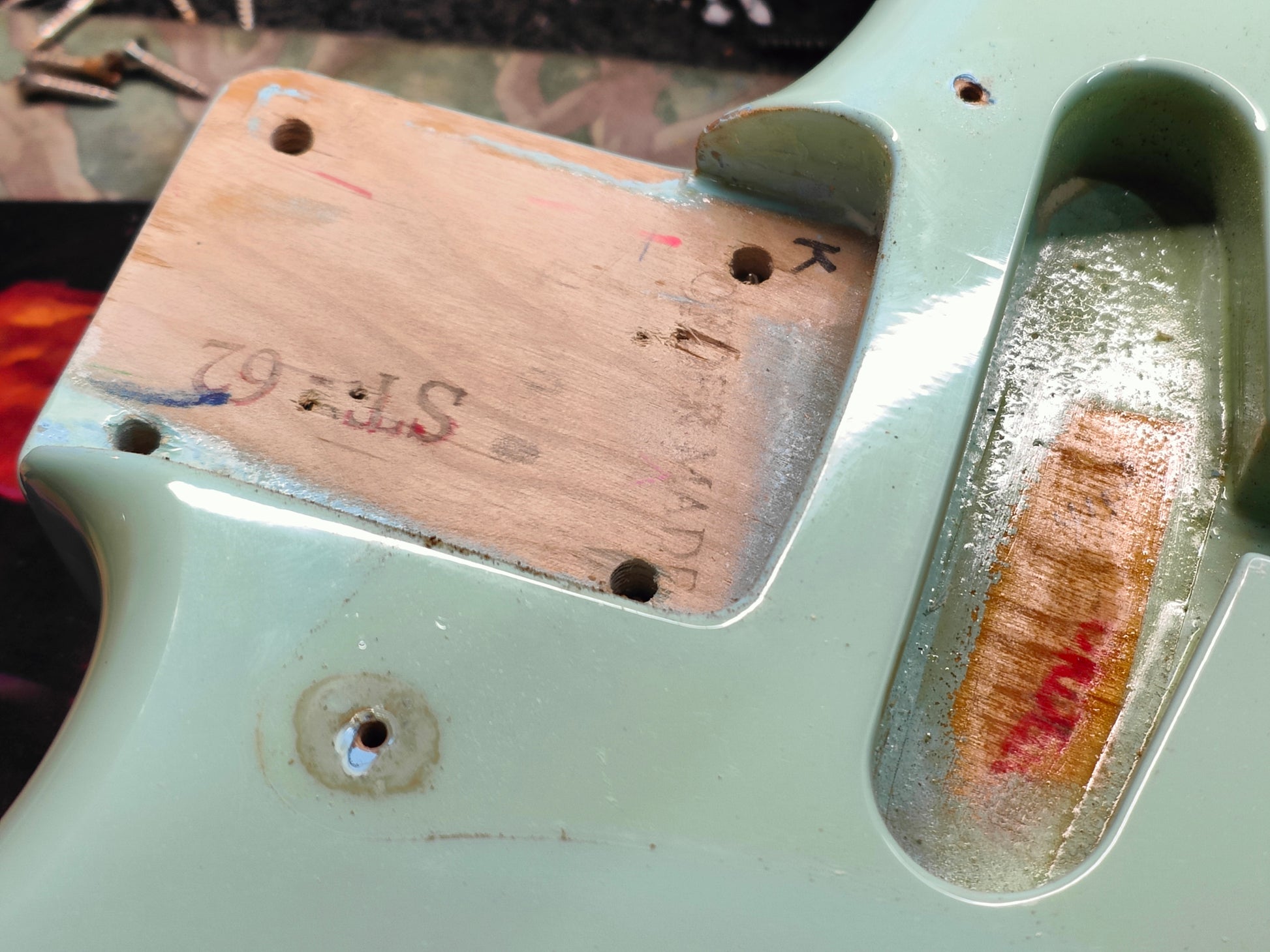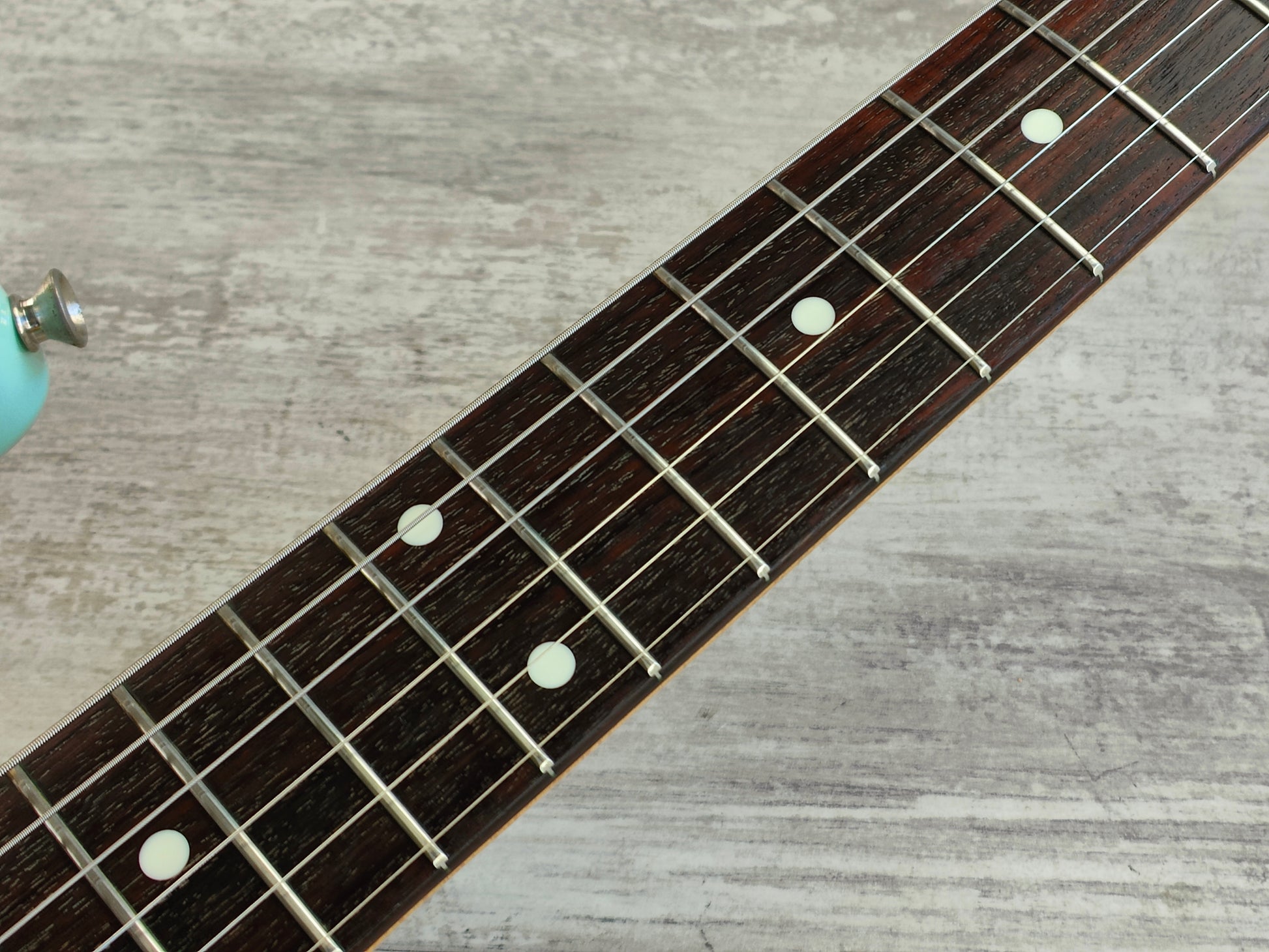 Made by the Fujigen factory as part of the fabled "Fender Japan E Series", this was an Order Made model ST62 that was made specifically to a customer's specs in 1986. Solid alder body with what looks to be a Sonic Blue finish that's faded to something closer to Daphne Blue (with a hint of Seafoam) bolted to a '62 profile maple neck and slab rosewood fingerboard (42mm nut width, 7.25" radius), it weighs 3.8kg's. Loaded with a set of Fender US Vintage single coils with Japanese pots and wiring along with the original Fender bridge with stamped saddles and vintage style tuners.