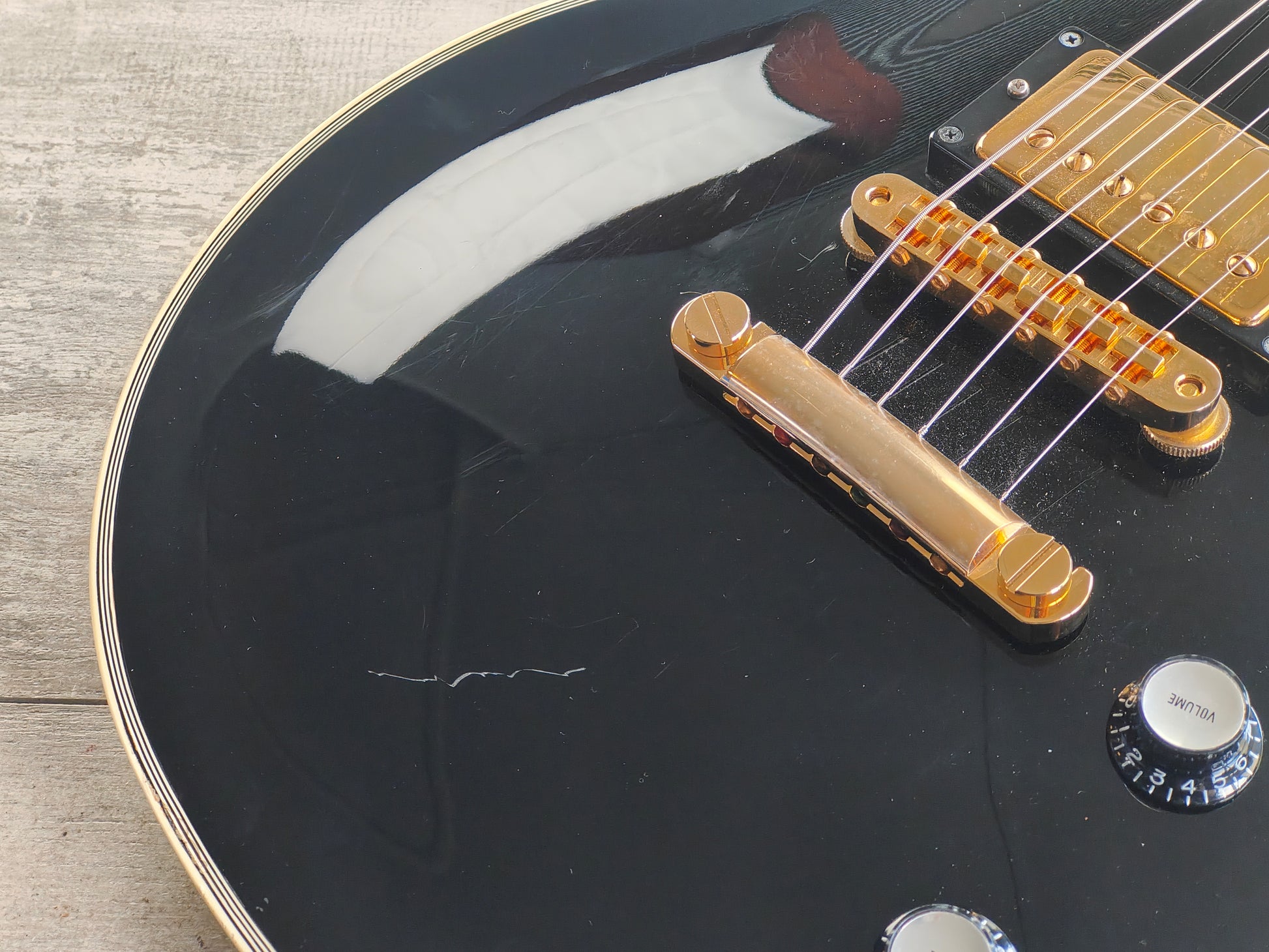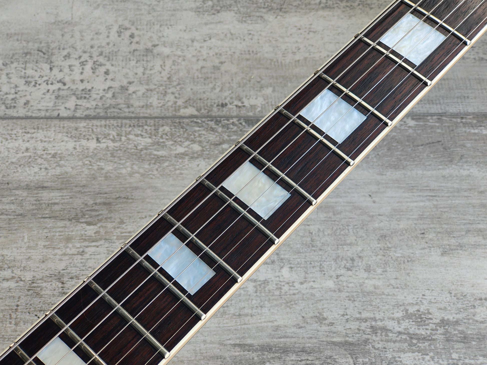 Made by the Fujigen factory in late 1986, this is the Greco EGC68-50 '68 reissue Les Paul Custom. Mahogany back with a lightly carved maple top, slim 60's profile, set mahogany neck and a 22 fret rosewood fingerboard, it weighs a nice solid 4.3kg's.