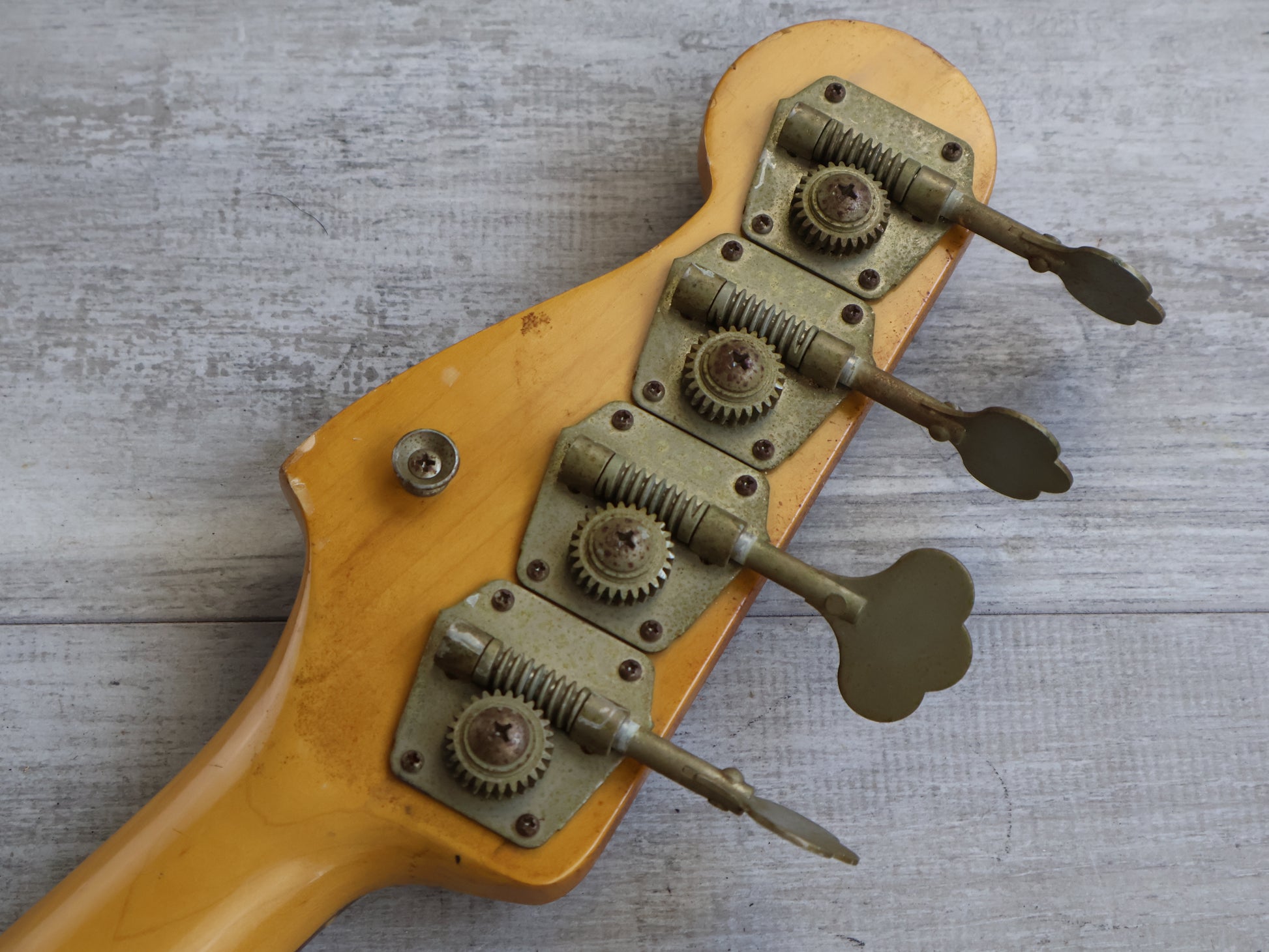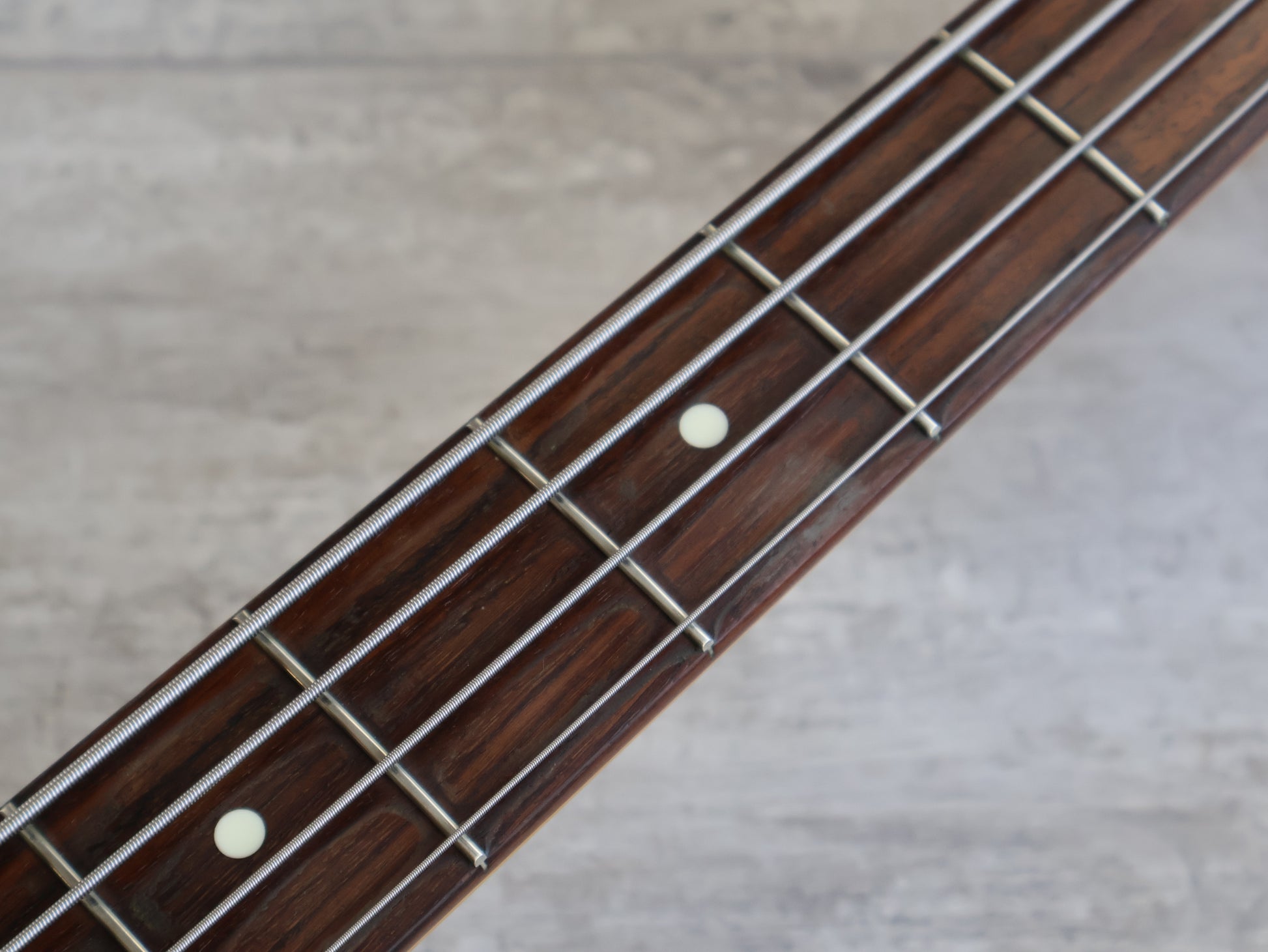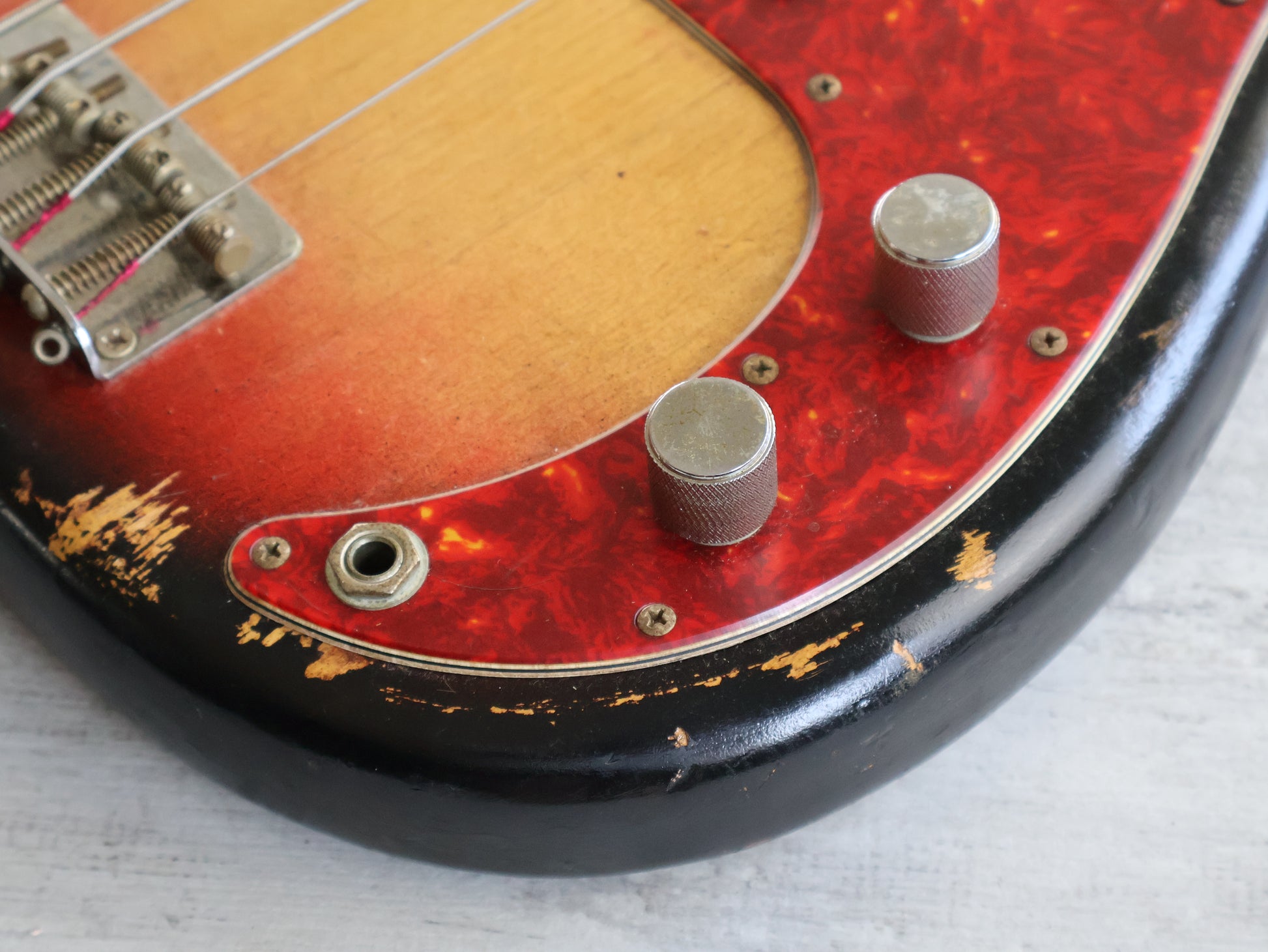 Loaded with Basslines pickups and full sized pots with cloth wiring and a PIO tone capacitor along with reverse machine heads and spiral saddles, it appears have had a nitro overspray that's relic'd heavily over time as pictured. Plenty of signs of play wear, neck is straight and the truss works as it should, the frets were polished and the guitar was restrung prior to listing.