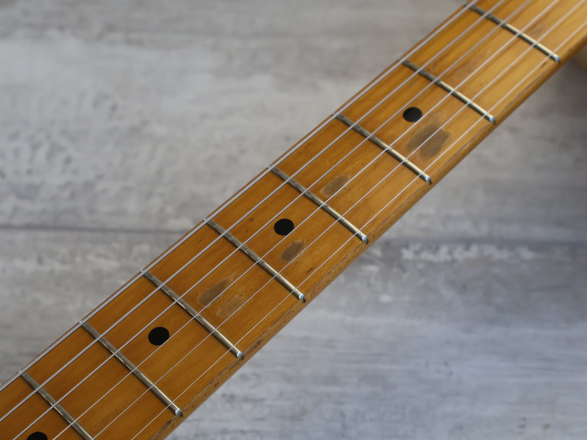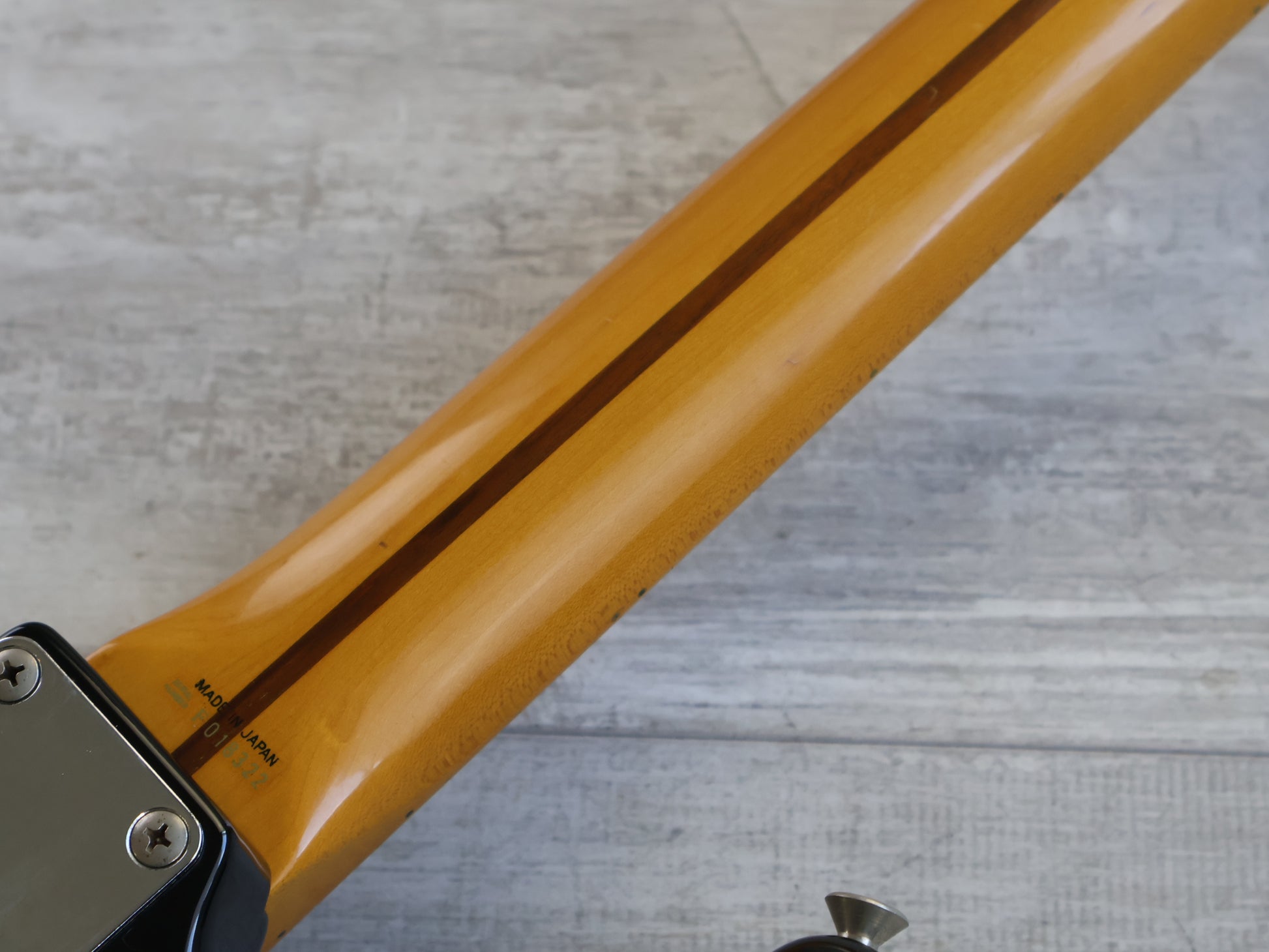 Made by the Fujigen factory in 1987, the ST54 was made by Fender Japan as an affordable replica of the famous 1954 Stratocaster. With a basswood body wearing a gloss black finish bolted to a maple neck with a nice '54 V profile and a 7.25" radius, it weighs 3.9kg's. Loaded with Fender Japan original ceramic pickups and a 5-way selector along with Fender stamped saddles and vintage style tuners, this one has a replacement black pickguard and a brand new bone nut otherwise it appears all original.