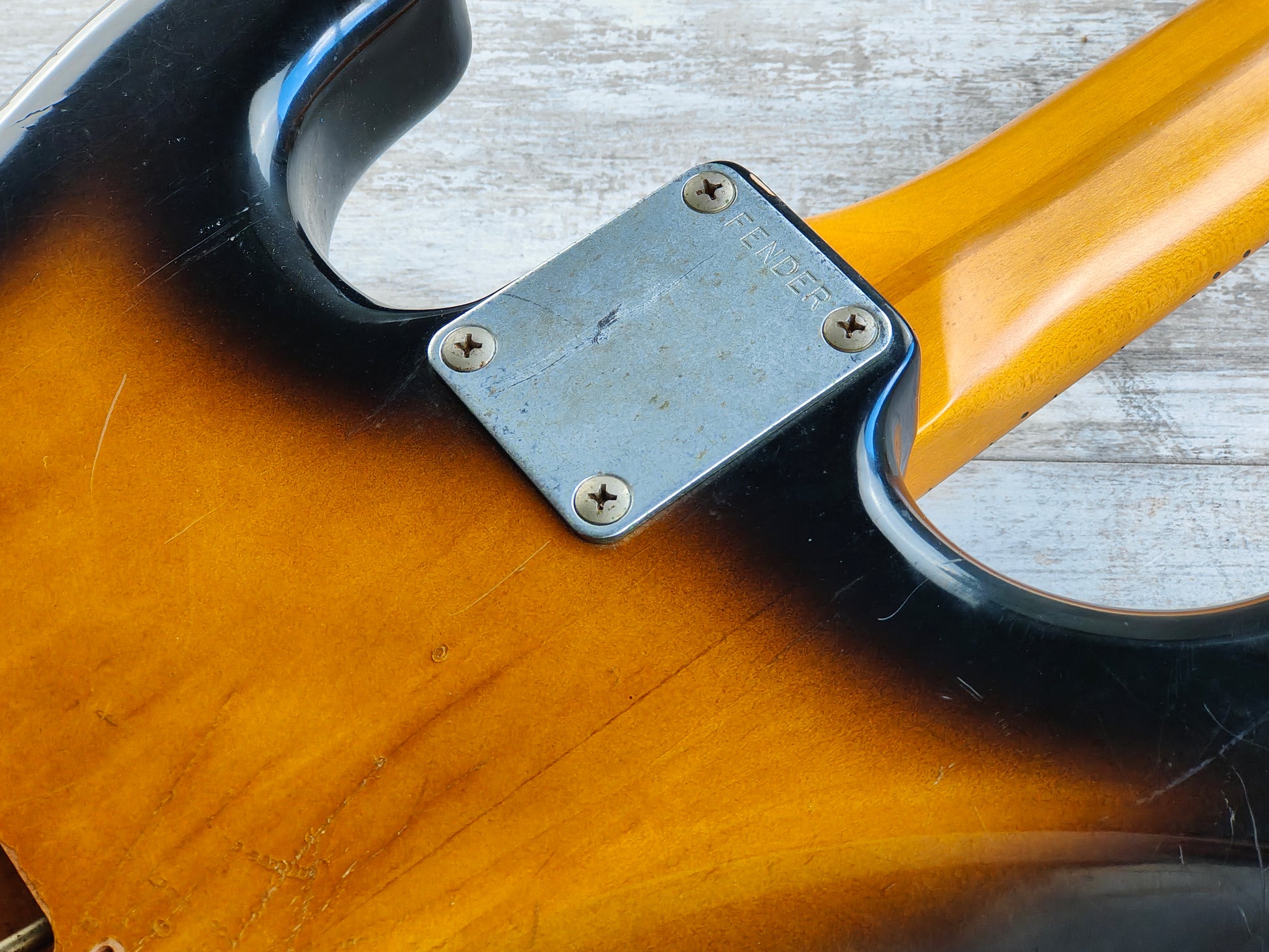 Basswood body with a brown sunburst finish bolted to a maple neck shaped with the classic '57 slim C neck profile (7.25" radius, 43mm nut, 648mm scale length), it weighs 3.4kg's. Looks to be close to all original under the pickguard with three Fender Japan alnico single coils.