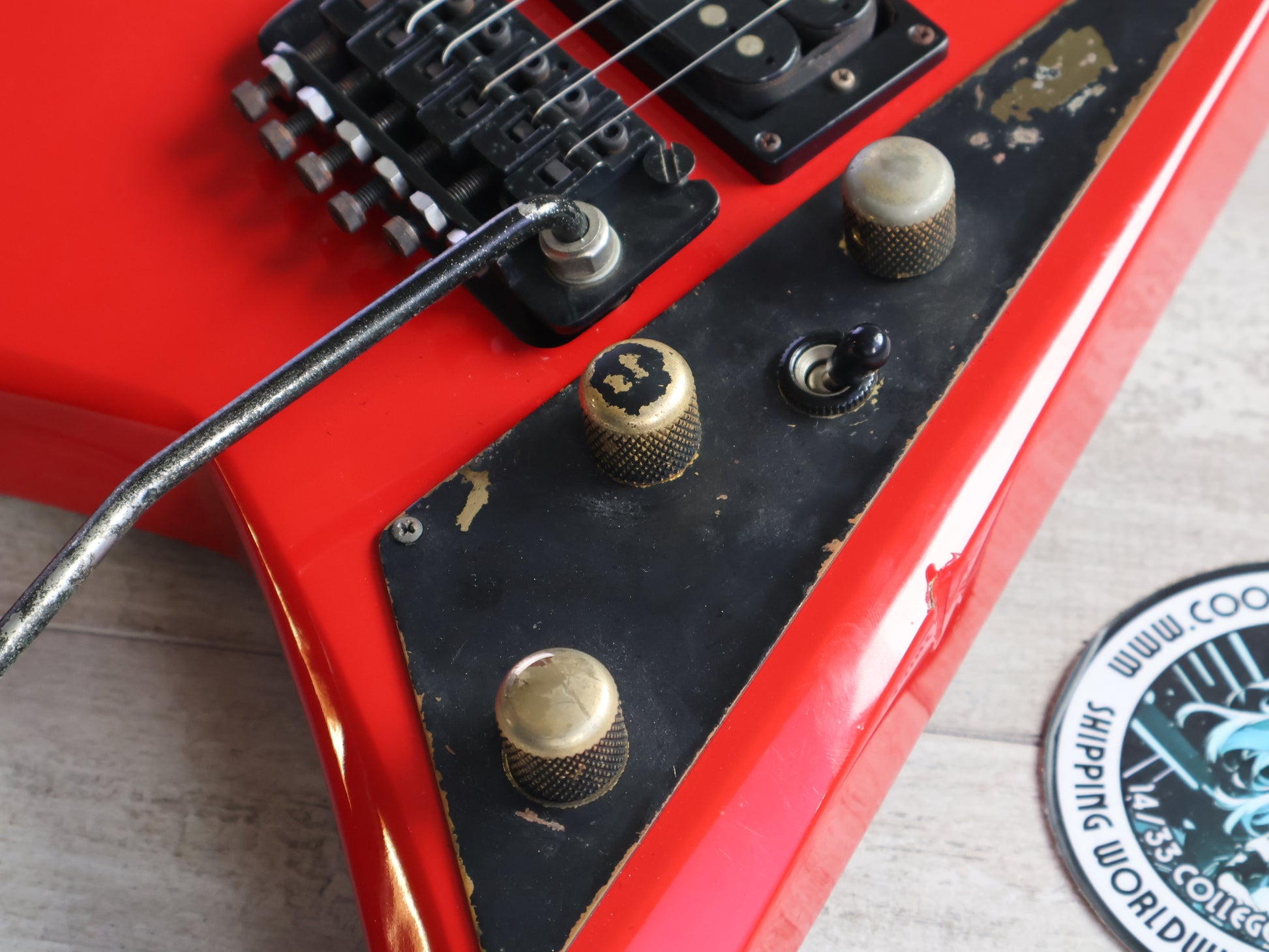 Loaded with the original humbuckers controlled by two volume controls and a master tone knob along with a Floyd Rose tremolo system.