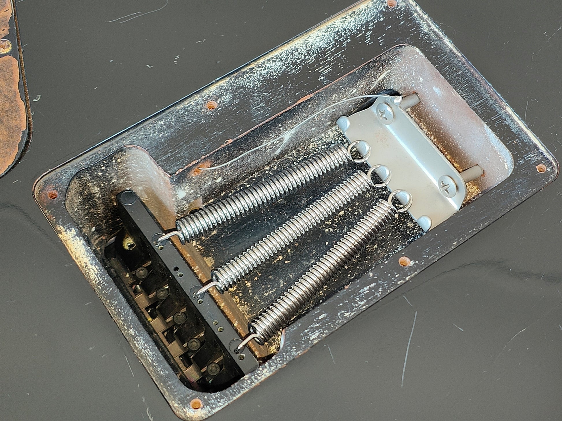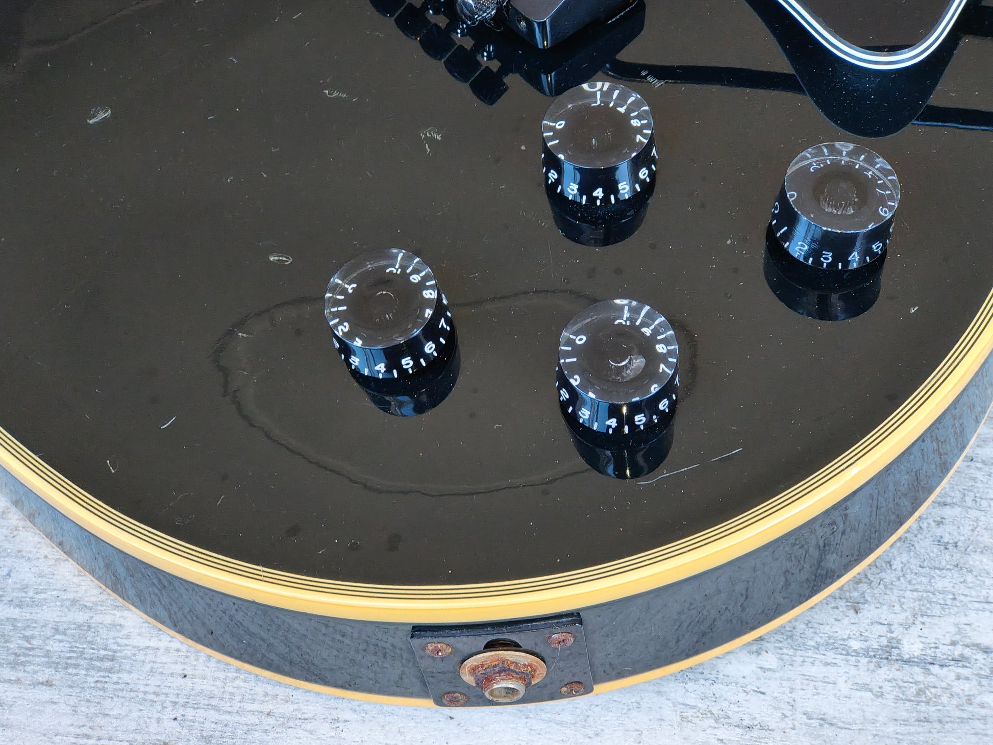 Loaded with the original trio of Japanese humbuckers and the original Greco stamped tuners, the Kahler saddles appear to have been replaced.