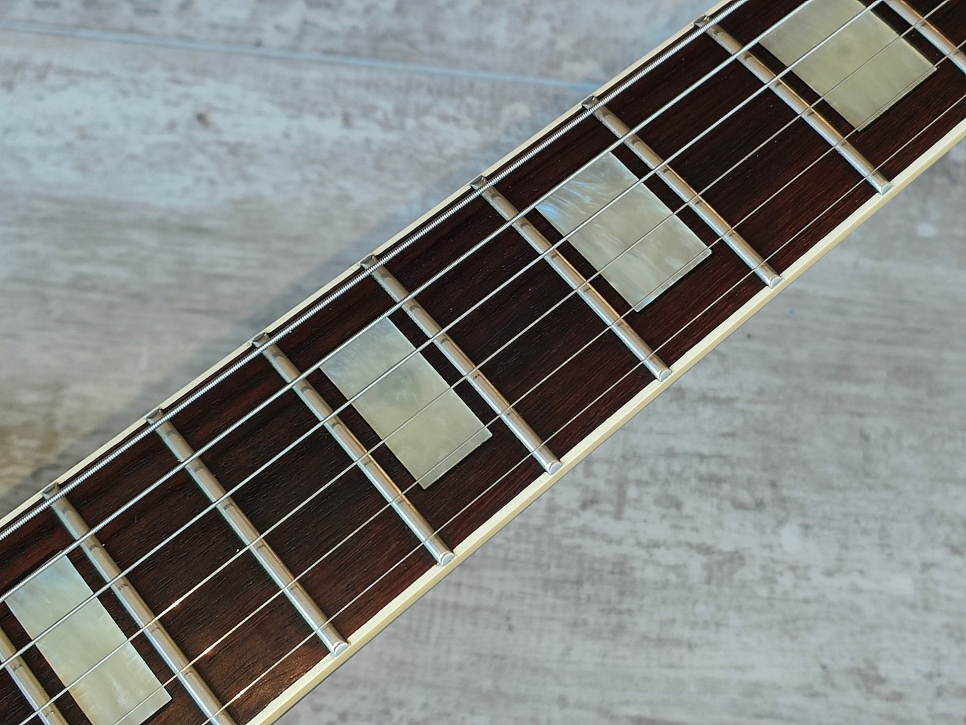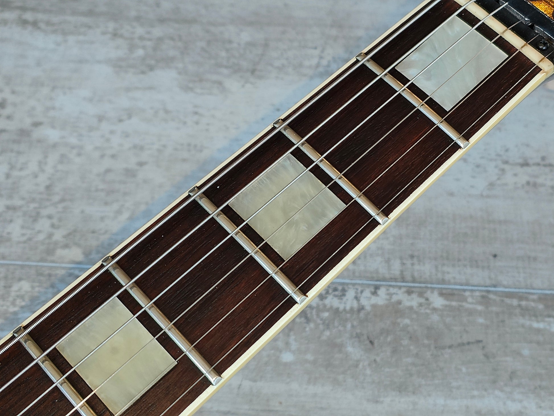 Made by the Fujigen factory in 1987, this looks to be a custom order non-catalog model from Greco with a Kahler tremolo factory loaded into an EGC57-60 ( with no signs of a tune-o-matic ever being installed). Mahogany body with a carved maple top, set neck construction with a slim 60's style profile and a 22 fret rosewood fingerboard, weighs 4.2kg's.