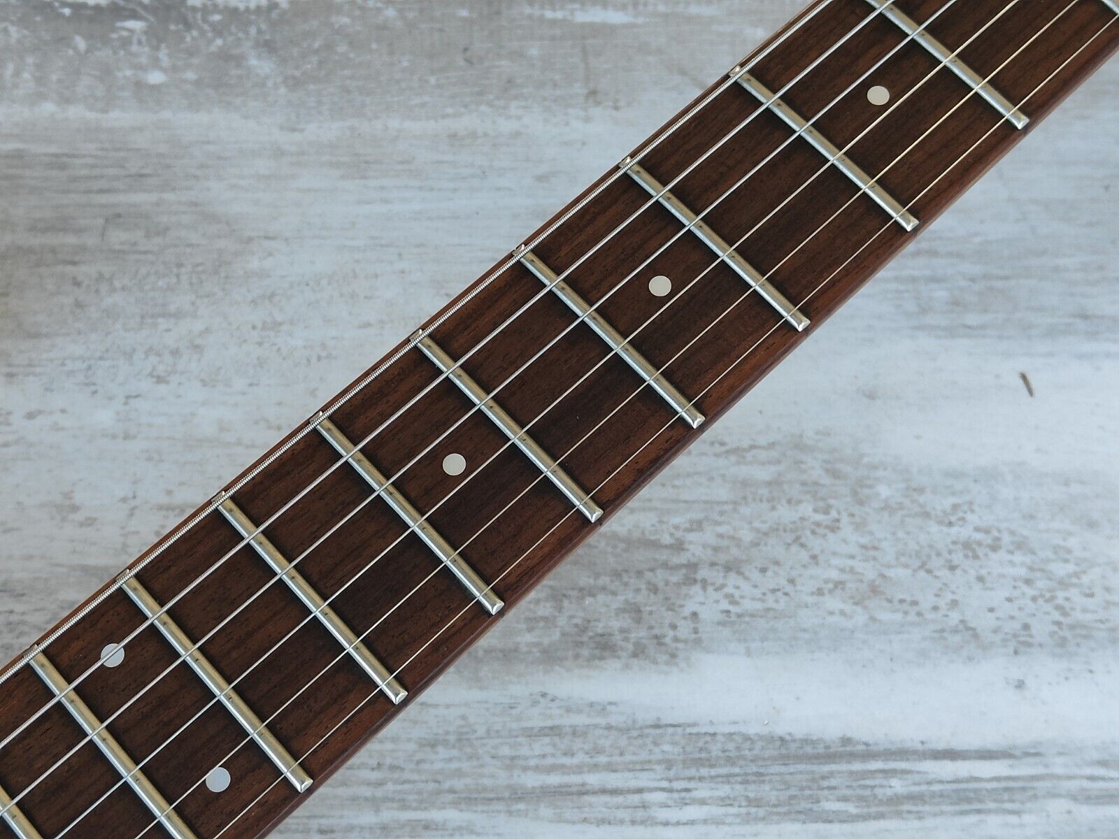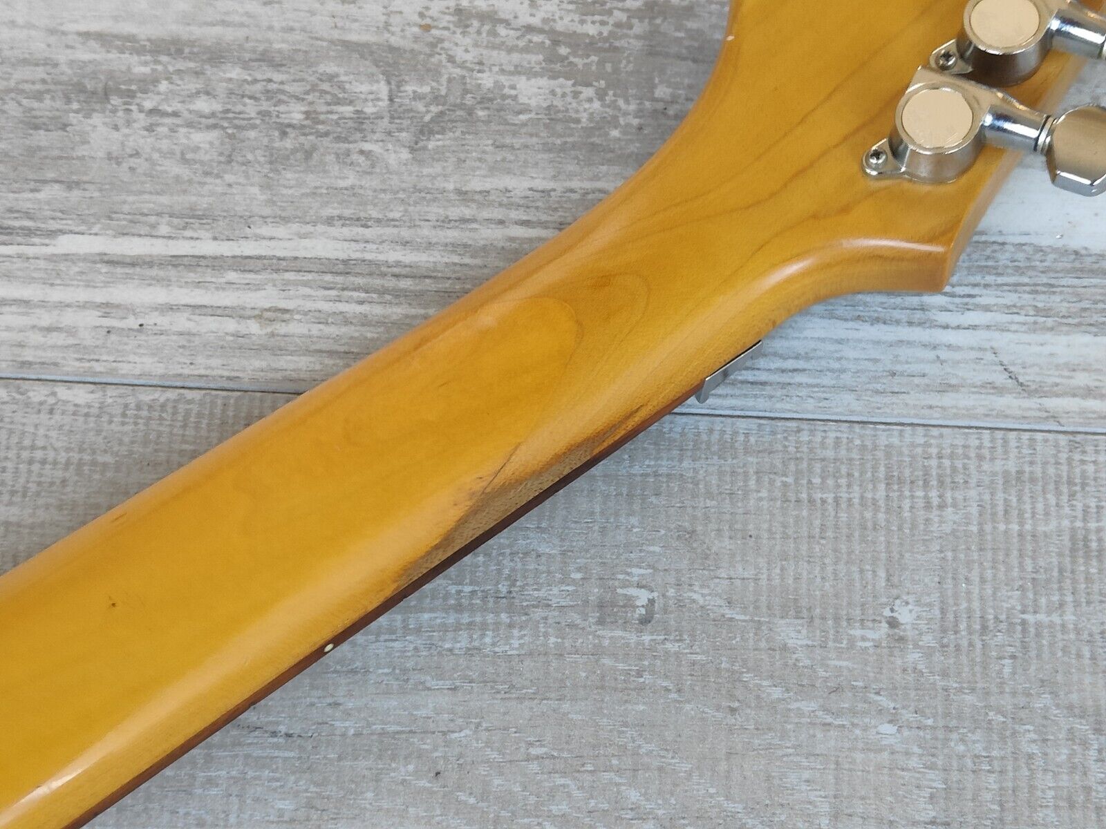 Japanese made in the late 1980's, the Road Warrior STD-2 was Aria Pro II's take on the Ibanez Roadstar/RG series. Contoured double cutaway body with a bolt on maple neck and a 22 fret rosewood fingerboard (648mm scale length), it weighs 3.7kg's. Loaded with the original MMK humbuckers and a factory Floyd Rose ACT3-S tremolo system, it received a professional relic job prior to coming to us with some tasteful wear patterns and some checking to the finish.