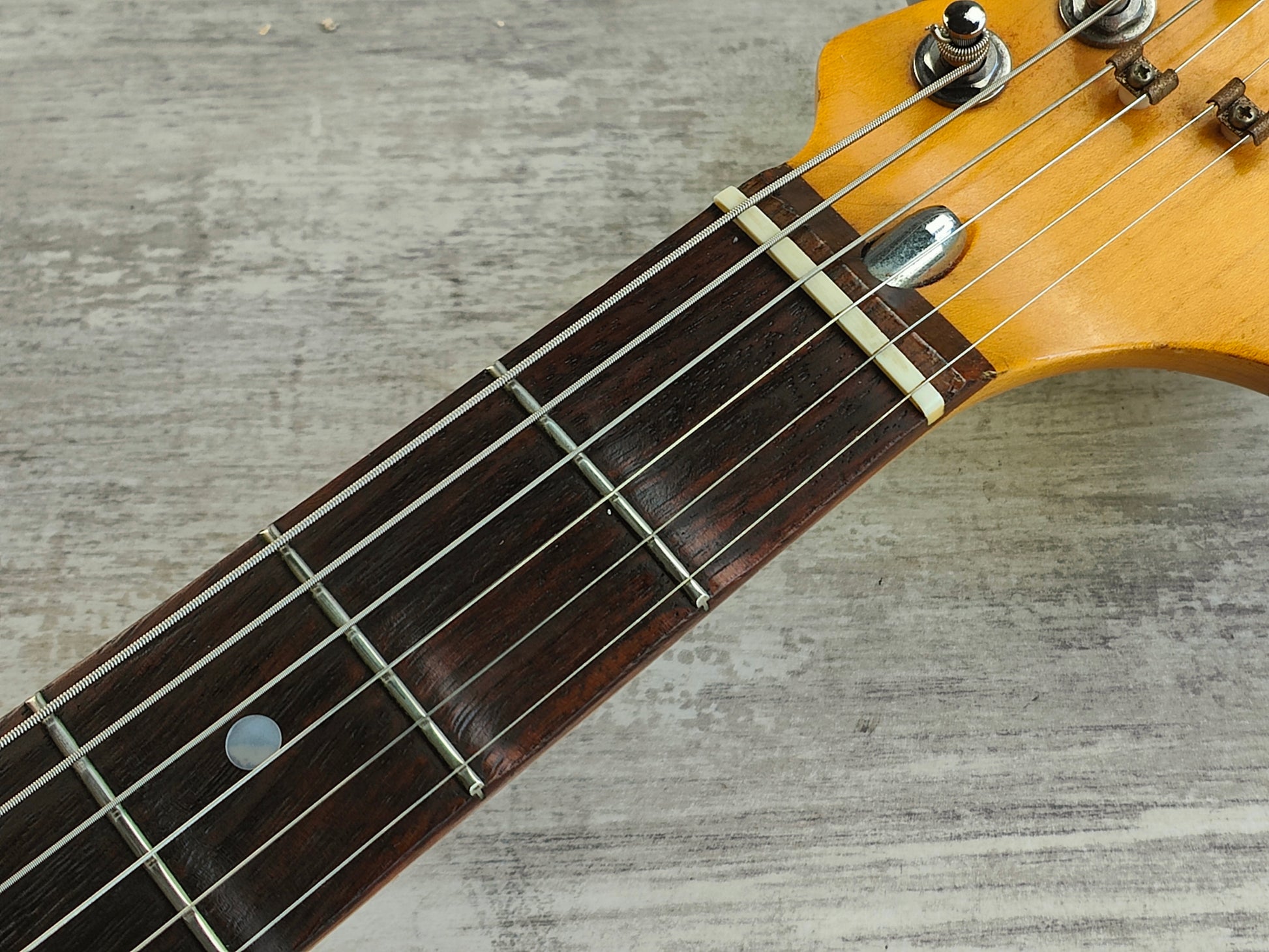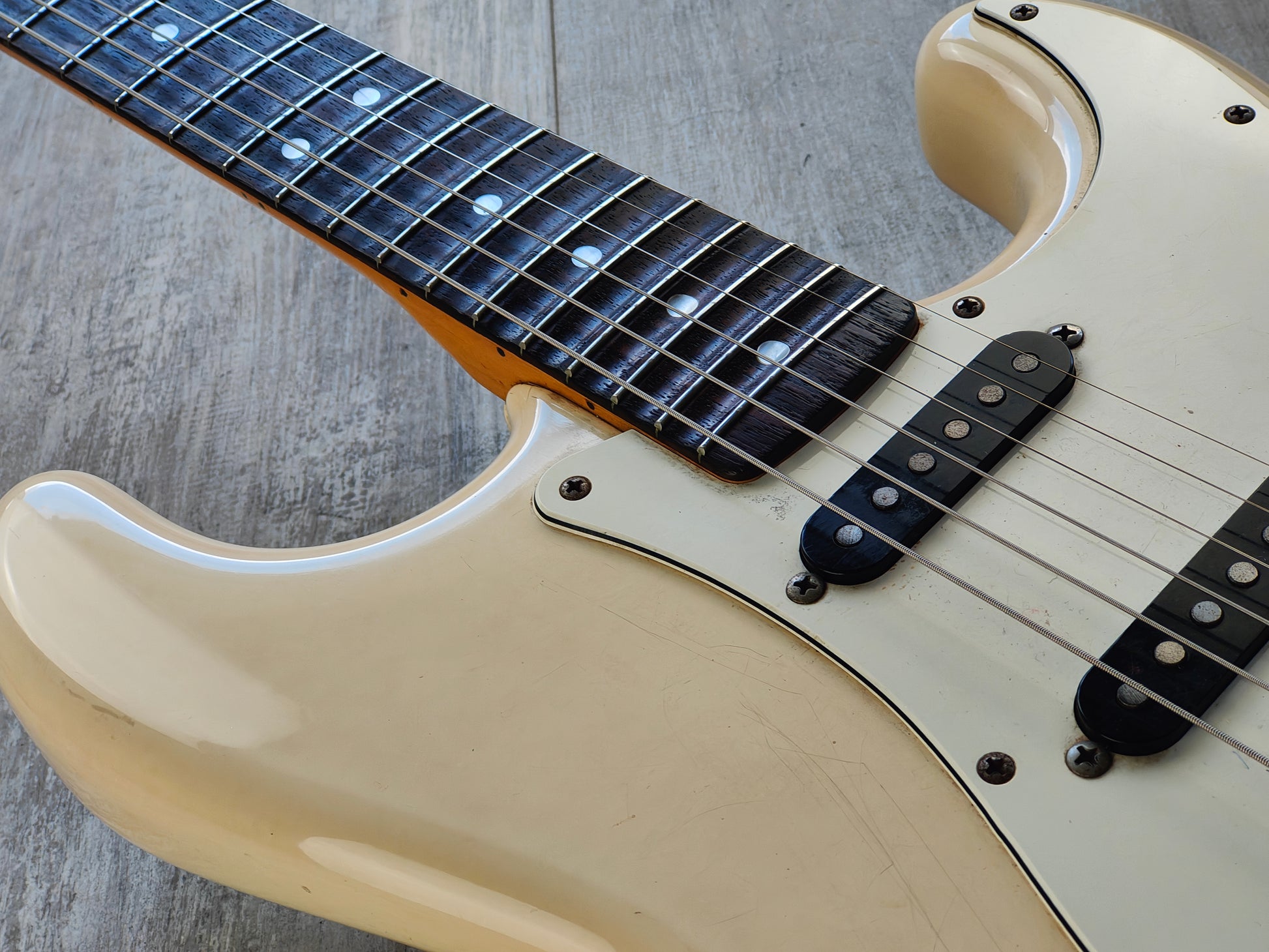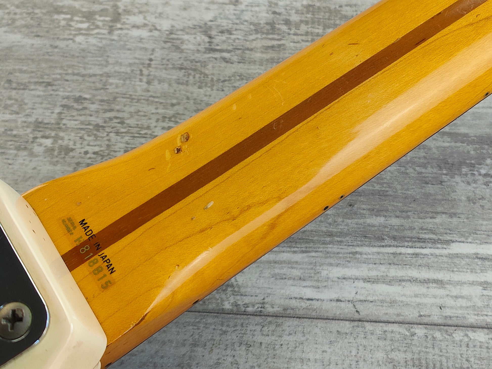 Part of the famous "E Series" of guitars made by the Fujigen factory in the mid to late 1980's, this is a rare "unofficial" Richie Blackmore model in Olympic White. This one dates to 1988 (based on the pot codes) and is built with a basswood body bolted to a maple neck and a factory "Blackmore" style scalloped rosewood fingerboard. 7.25" radius with a nice slim C profile neck, weighs 3.7kg's.