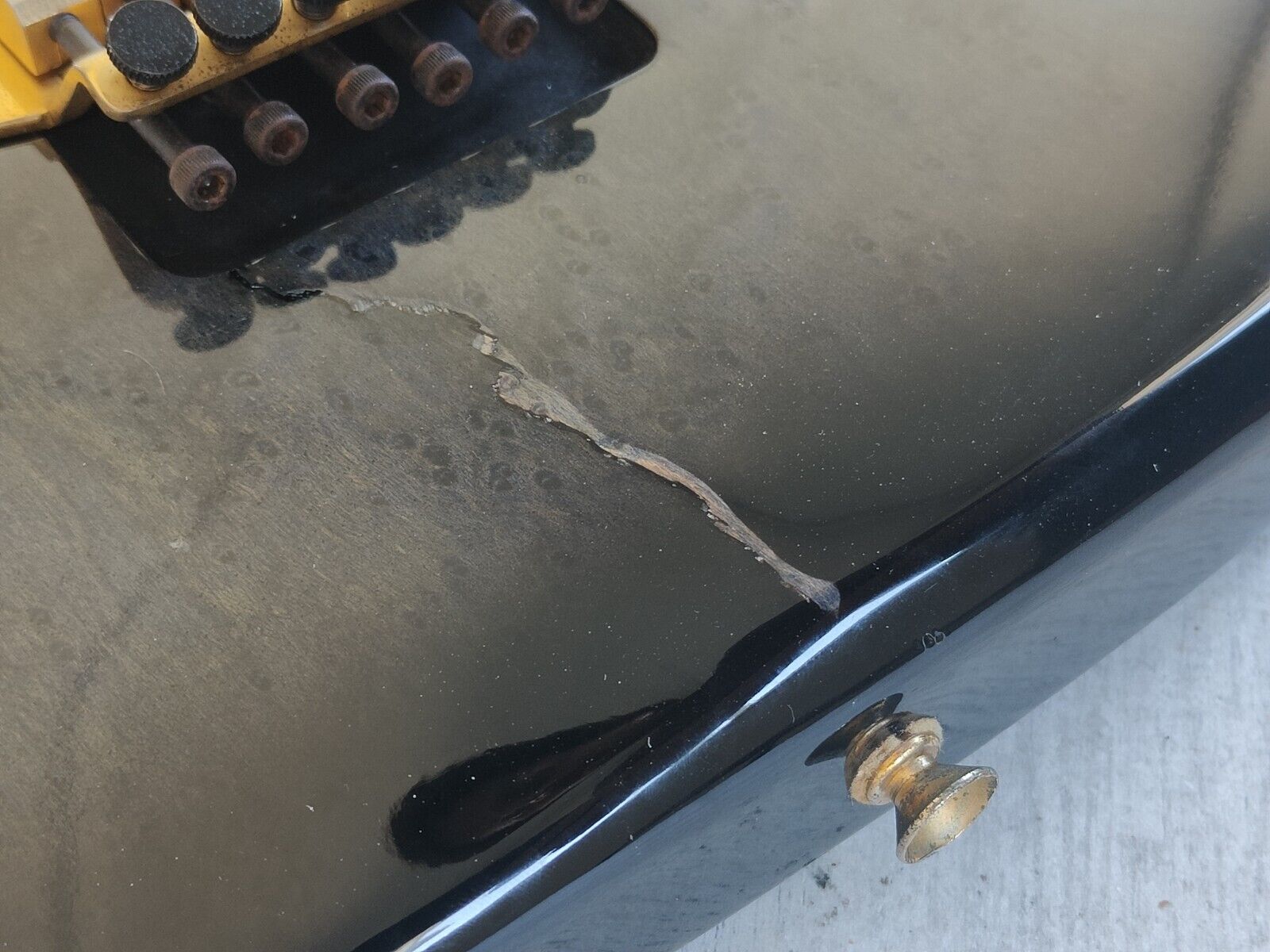 Very good condition for it's age with the only exception being the crack to the laminate on the top (very common if you're familiar with Fender laminate models) that was professionally epoxied and filled prior to listing so it's rock solid and purely cosmetic, smooth to the touch. The guitar was given a full setup and service with a fretboard oil, fret polish and truss adjustment, the neck is straight and the frets have plenty of life with some mild pitting from years of basic use.