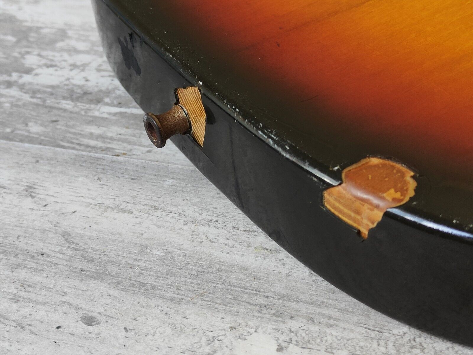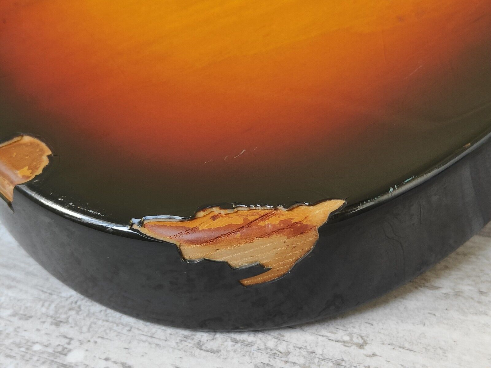 Heavily used condition with plenty of signs of wear and tear as pictured including a bent tone knob, scratchy switch, fret pitting, fretboard wear, cracked pickup ring and some paint chips. The neck is straight and the truss adjusts well so you can enjoy it as it sits or put some work in to make it an absolute beast.