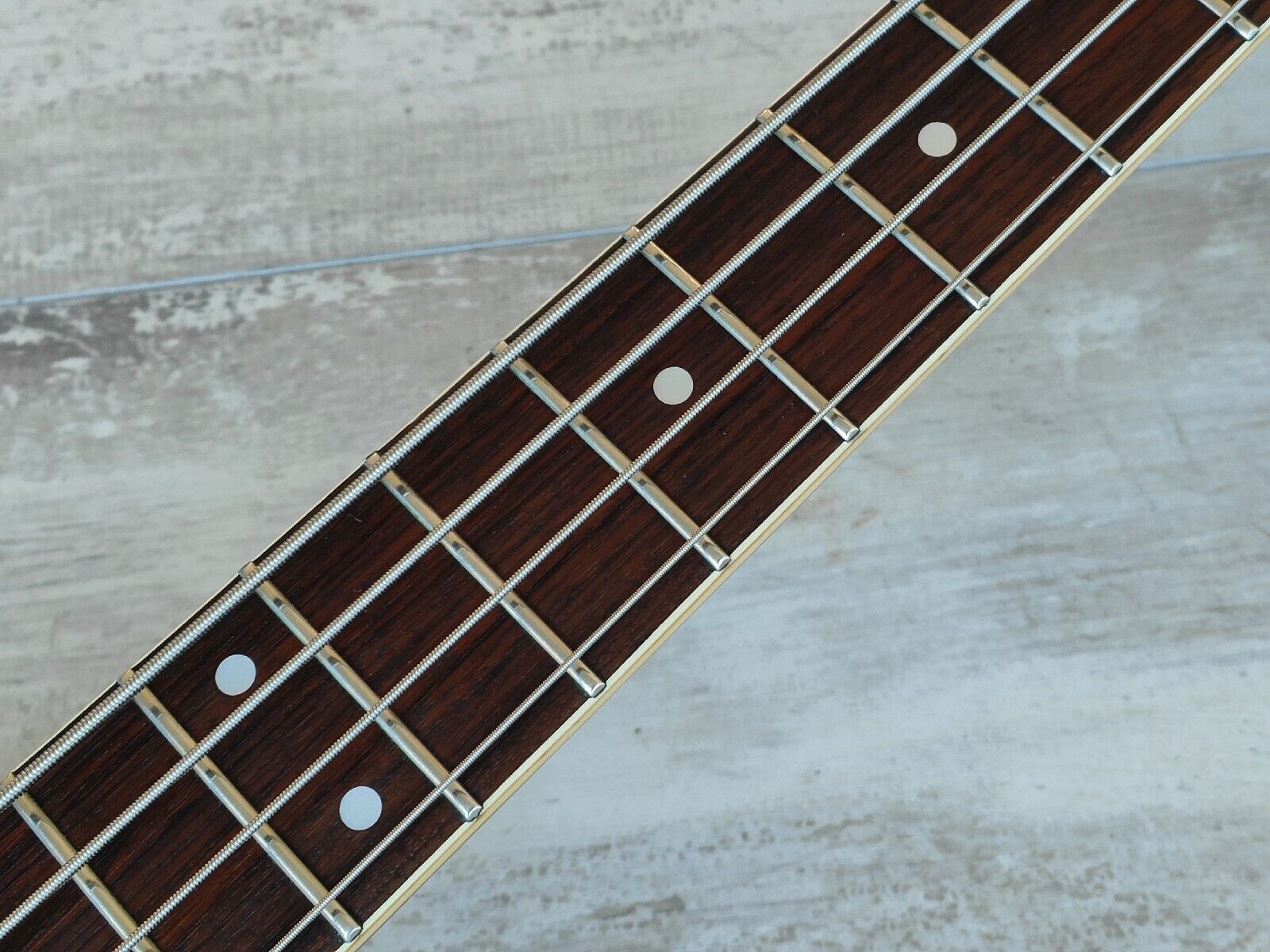 This one has been modified to replace the original three-point bridge system with a Badass Bass II bridge that's mounted on a piece of rosewood to raise the action to a playable level. Given a full setup and service prior to listing, plays well with a straight neck and adjustable truss.