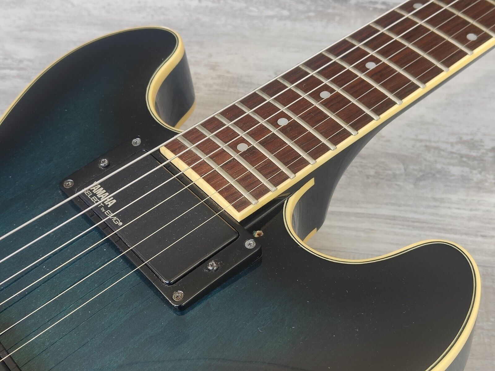 Japanese made in the late 1980's, these SAS models were smaller bodied semi-hollow designed that are similar in size to a Gibson ES-339. Maple body with a birch centre block, slim profile mahogany neck with a 22 fret rosewood fingerboard (628mm scale, 44mm nut width), it weighs 3.2kg's. Looks to be all original (missing pickguard) with a TSG 1G bridge, YSEH1 humbuckers (made by EMG) with master volume/tone knobs and a coil split push pull and Yamaha branded tuners.