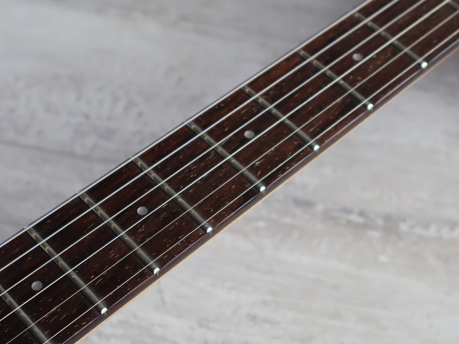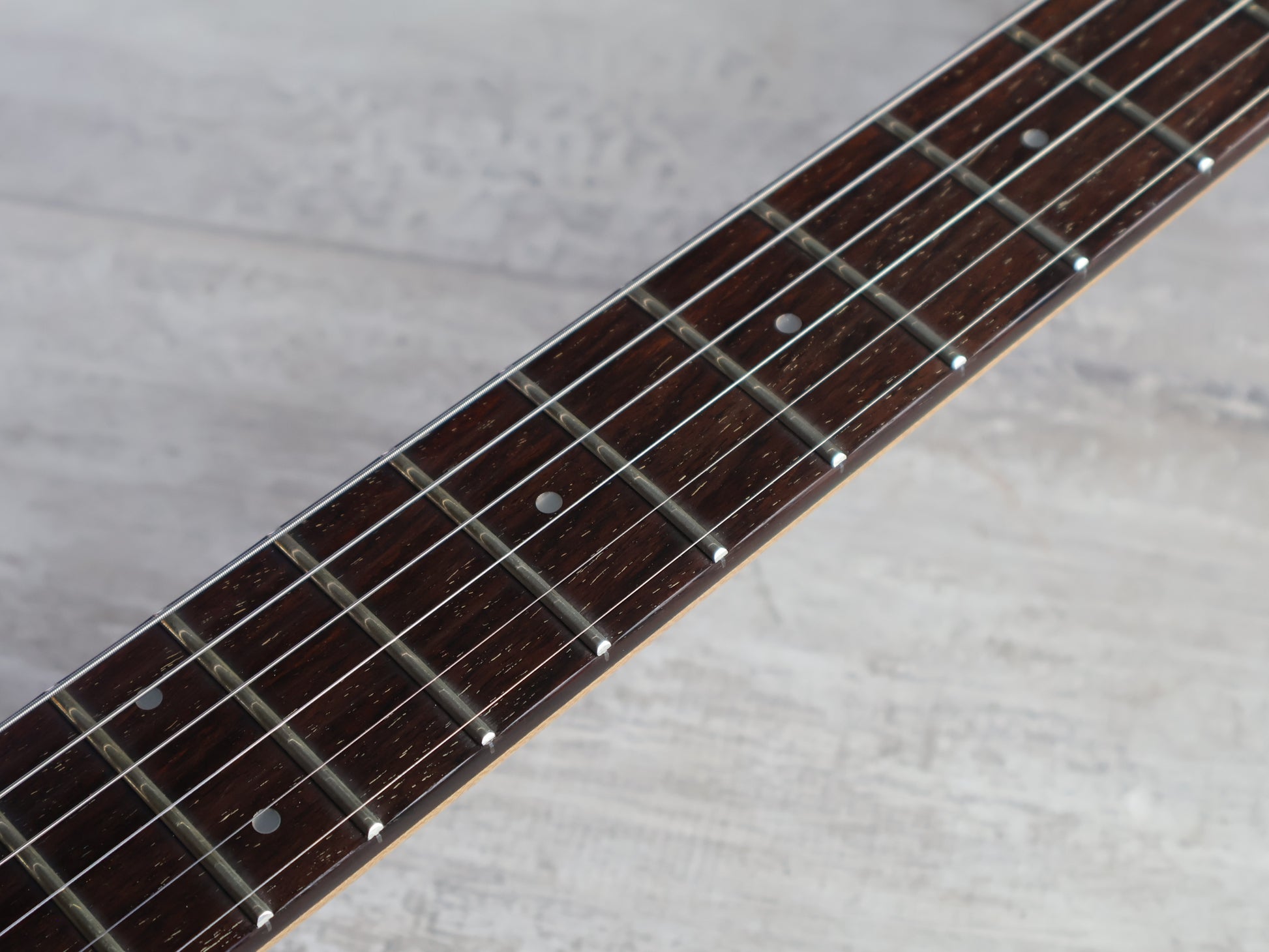 Made by the Tokai factory in 1989 and likely sold to the USA market, "The Warrior" was Aria Pro II's heavy duty superstrat designed to feel stronger and bulkier than the Ibanez RG style guitars gaining popularity at the time. Solid ash body with a 22 fret rosewood fingerboard on a rock maple neck (648mm scale length), it weighs a hefty 4.5kg's.