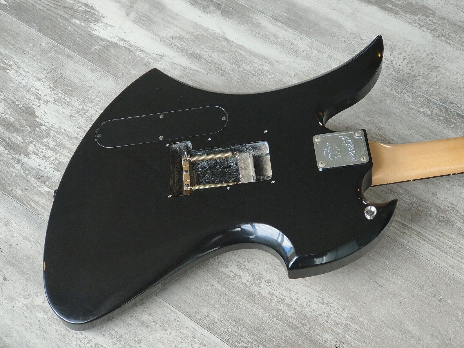 From the BC Rich NJ (Nagoya, Japan) catalog, this is a 1989 Mockingbird model. Canadian maple neck with a rosewood fingerboard (24 frets, 628mm scale length), alder body, licenced Floyd Rose locking tremolo system, in-house Dimarzio style pickups, weighs 3.9kg's.
