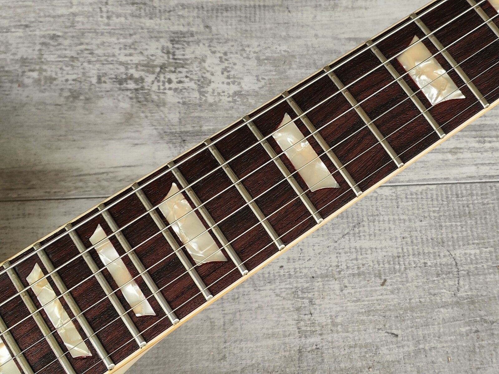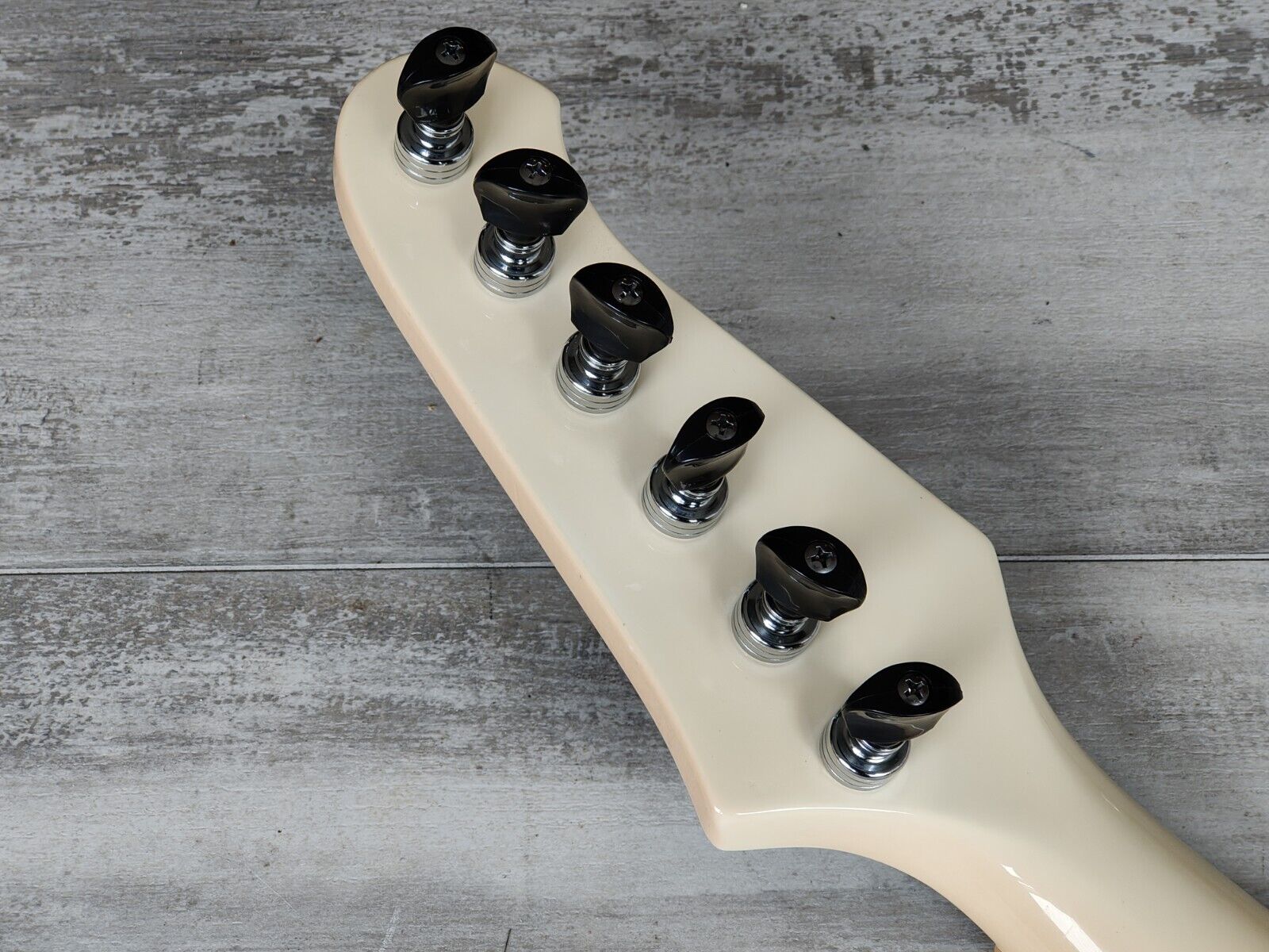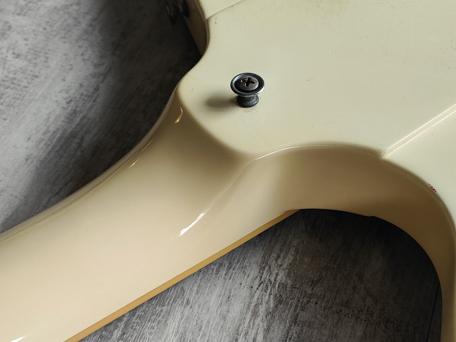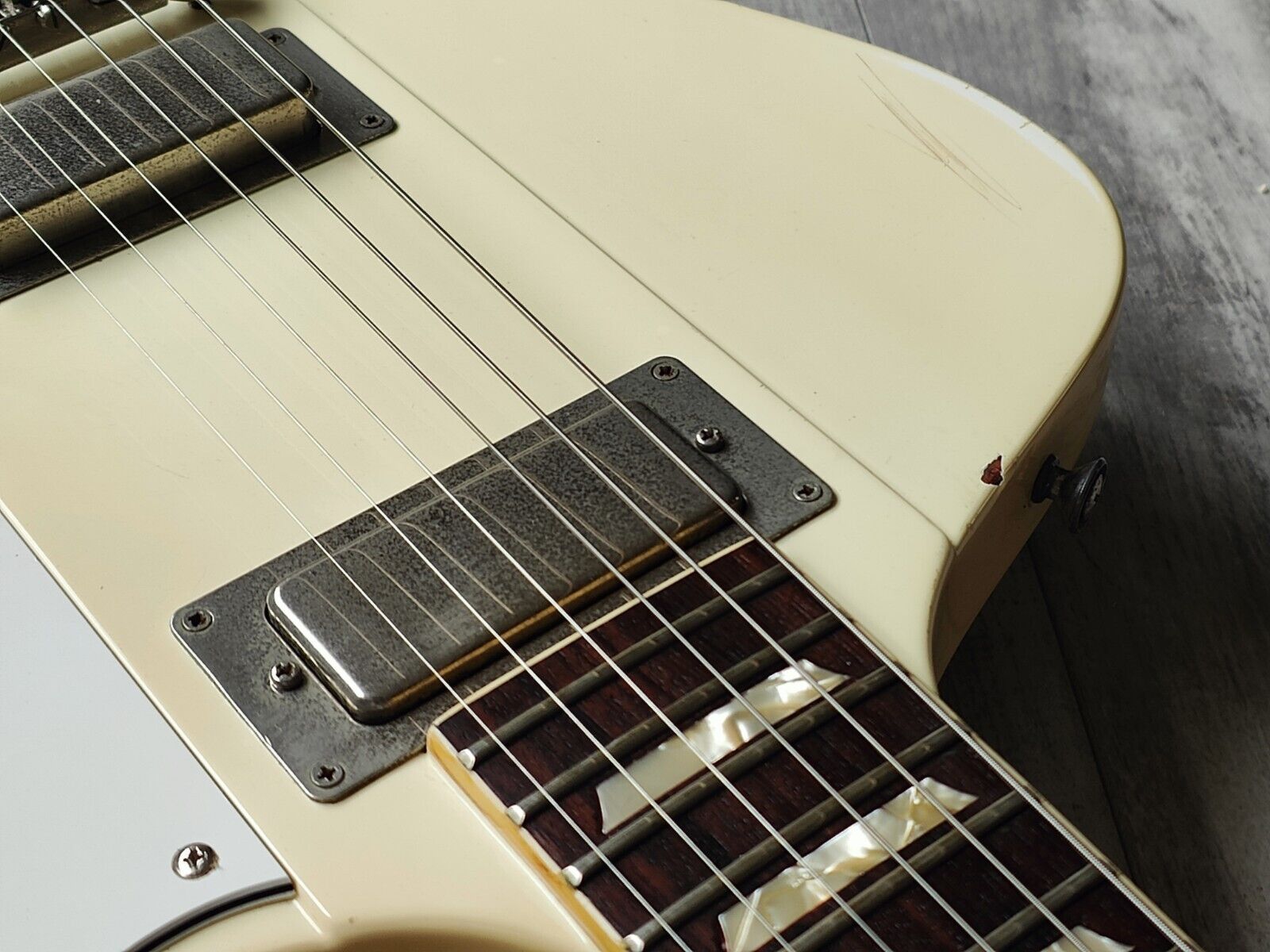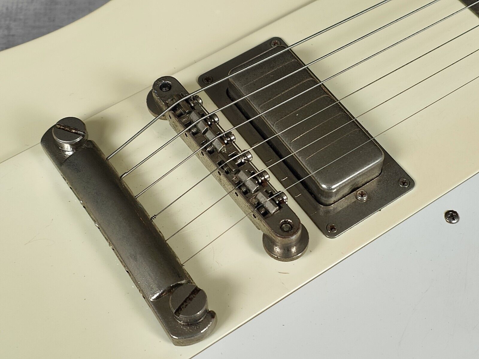 Made in Japan in early 1989, this is a non-catalog version of the Burny RFB-80 reverse Firebird model wearing a vintage white finish (instead of the usual brown sunburst shown in the catalog). Slim mahogany body with a slim 60's mahogany set-neck construction and a 22 fret bound rosewood fingerboard (12" radius, 628mm scale length), it weighs 3.8kg's. Loaded with a pair of Fernandes mini-humbuckers along with all the original pots and wiring, this one's been loaded with a new set of Banjo style tuners but otherwise appears close to all original.
