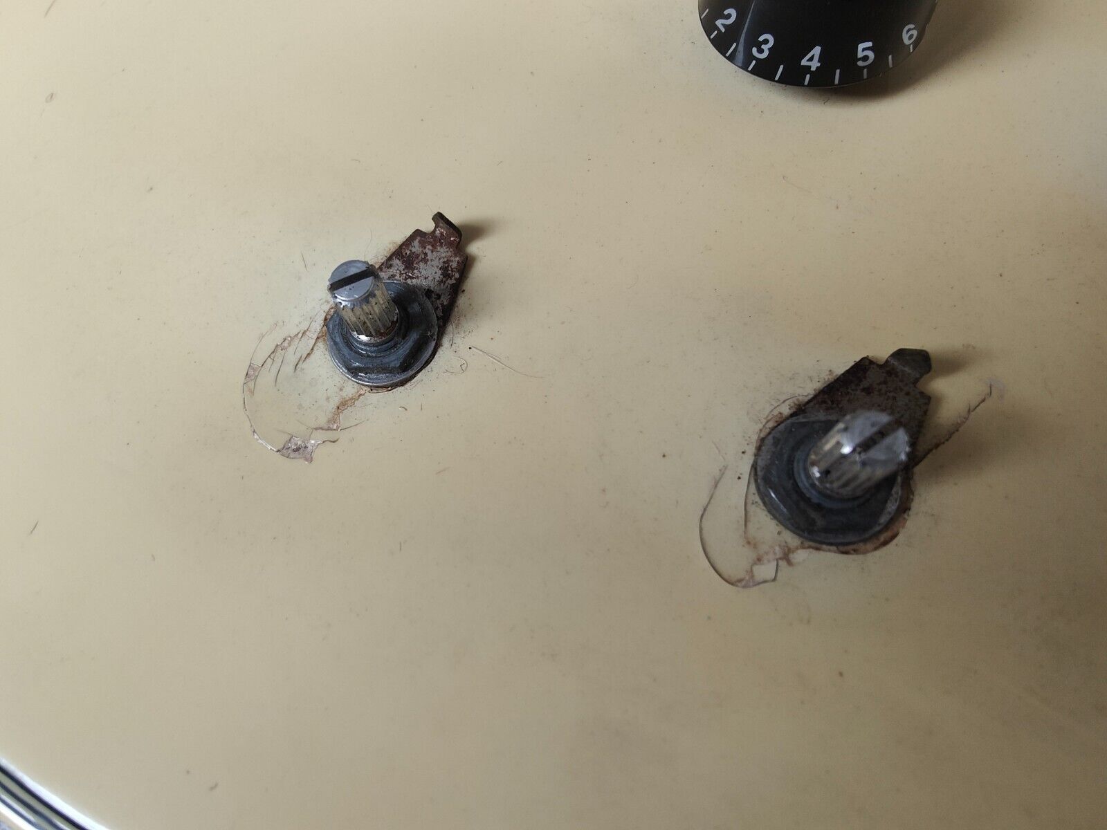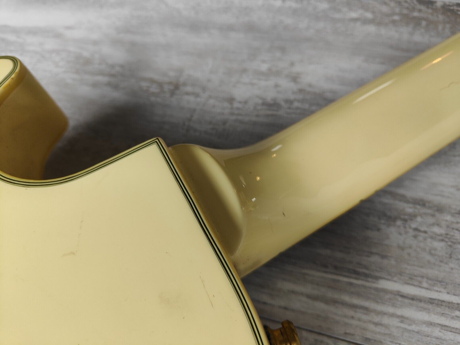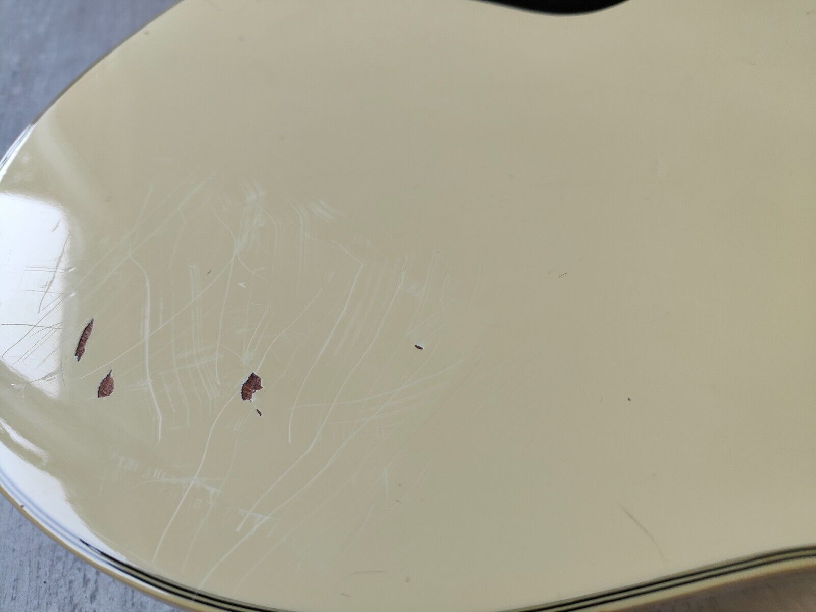 Good vintage condition as pictured with honest signs of wear and tear but no notable breaks or repairs with the exception of some light damage under the two knobs as pictured. Looks to be mostly finish damage and slight shipping, structurally stable. Frets have some light wear and pitting but still play smooth, fret edge binding is still intact. Truss is adjustable and works as it should.