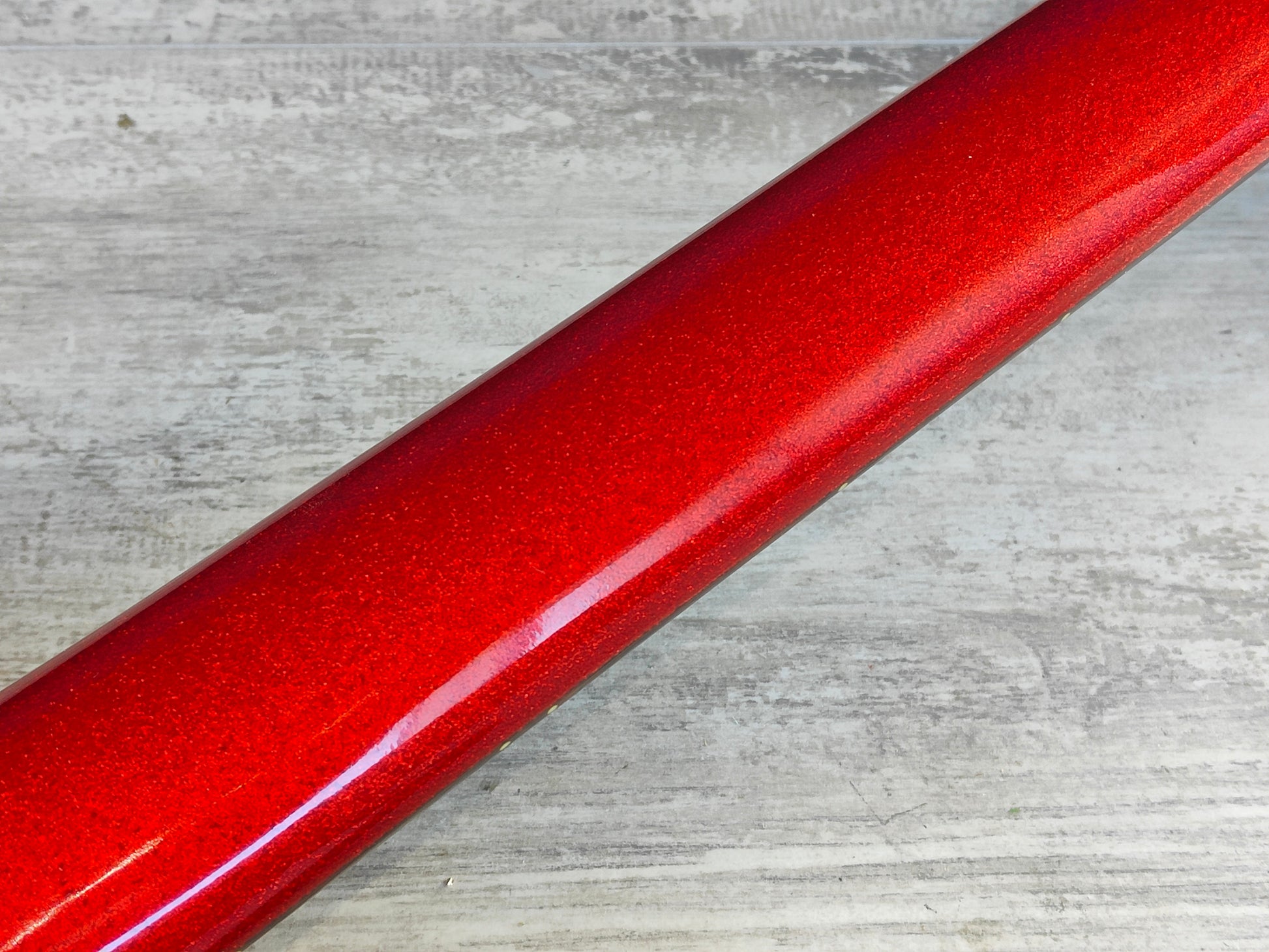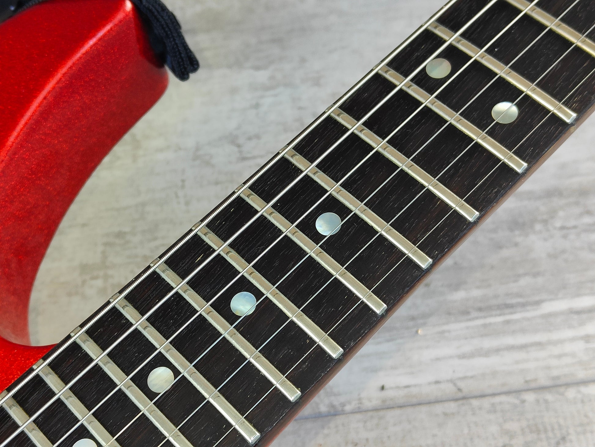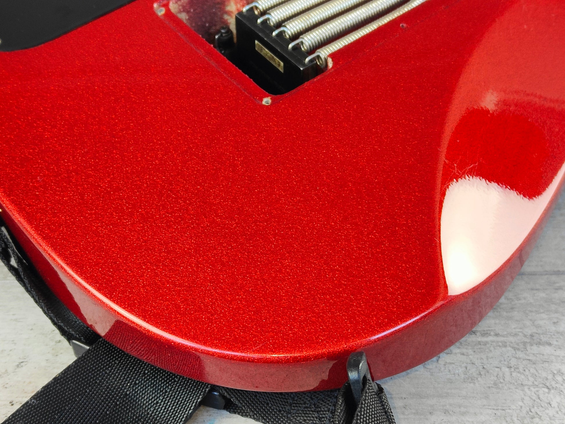 One of the highest end models available in Charvel Jackson's 1989 Japanese catalog, the Model 5A is a simple shredder's dream. Neckthrough construction wearing a bright metallic red flake finish, it features a maple neck with poplar wings and a 24 fret rosewood fingerboard (12-16" compound radius, 648mm scale length, 43mm nut width) and weighs 3.7kg's.