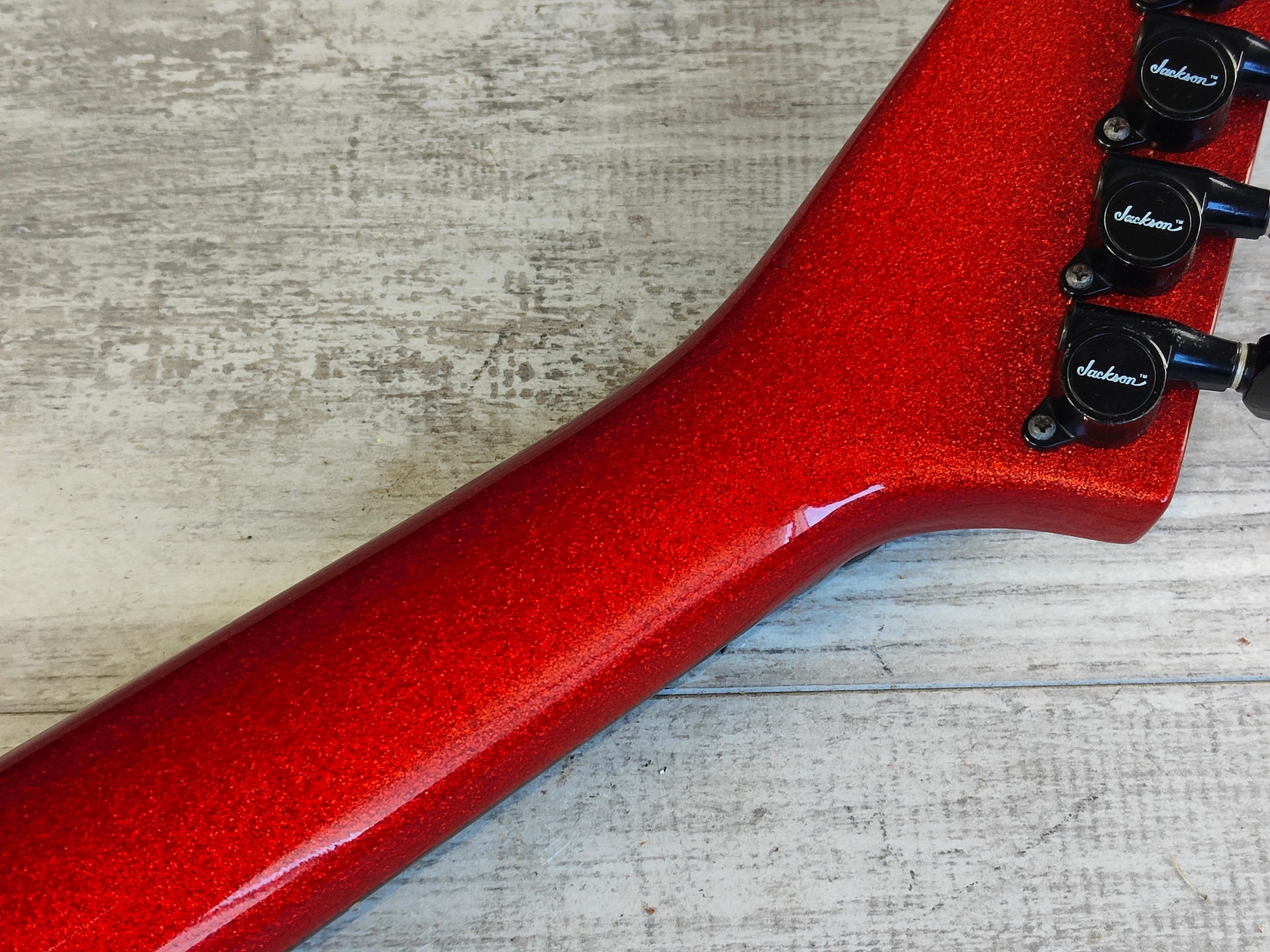 The previous owner swapped in a Bareknuckle Brute Force humbucker along with a Dimarzio volume pot and Dimarzio Clip Lok strap. The original Jackson branded tuners, locking nut and Jackson branded licensed Floyd Rose all work perfectly.