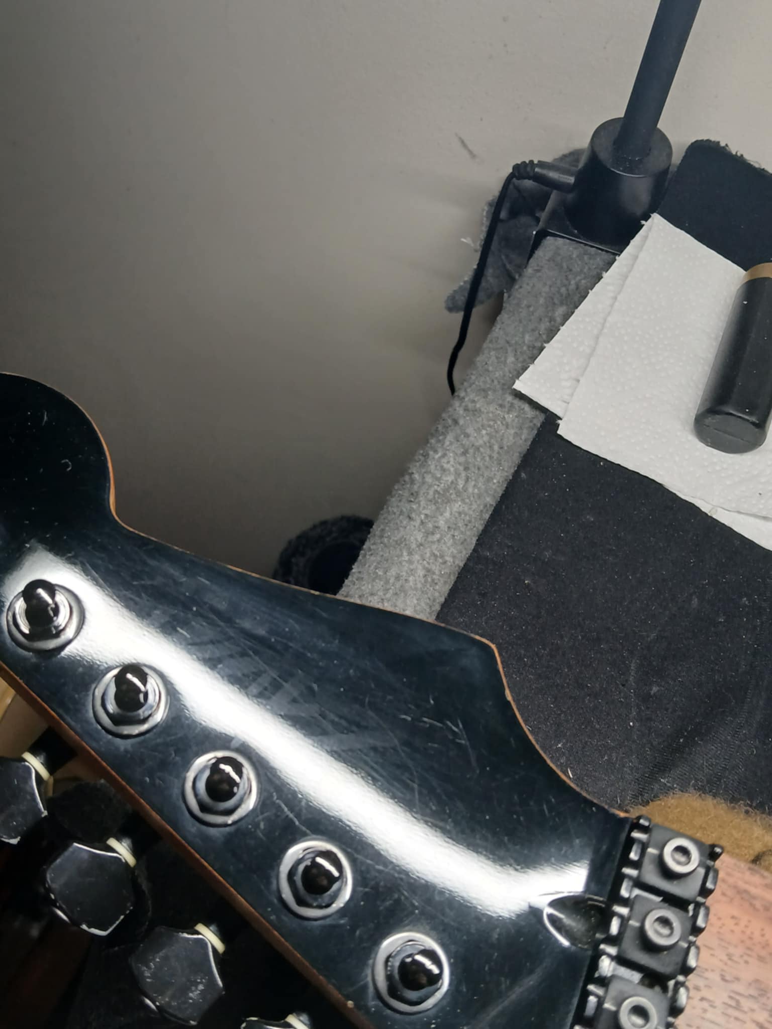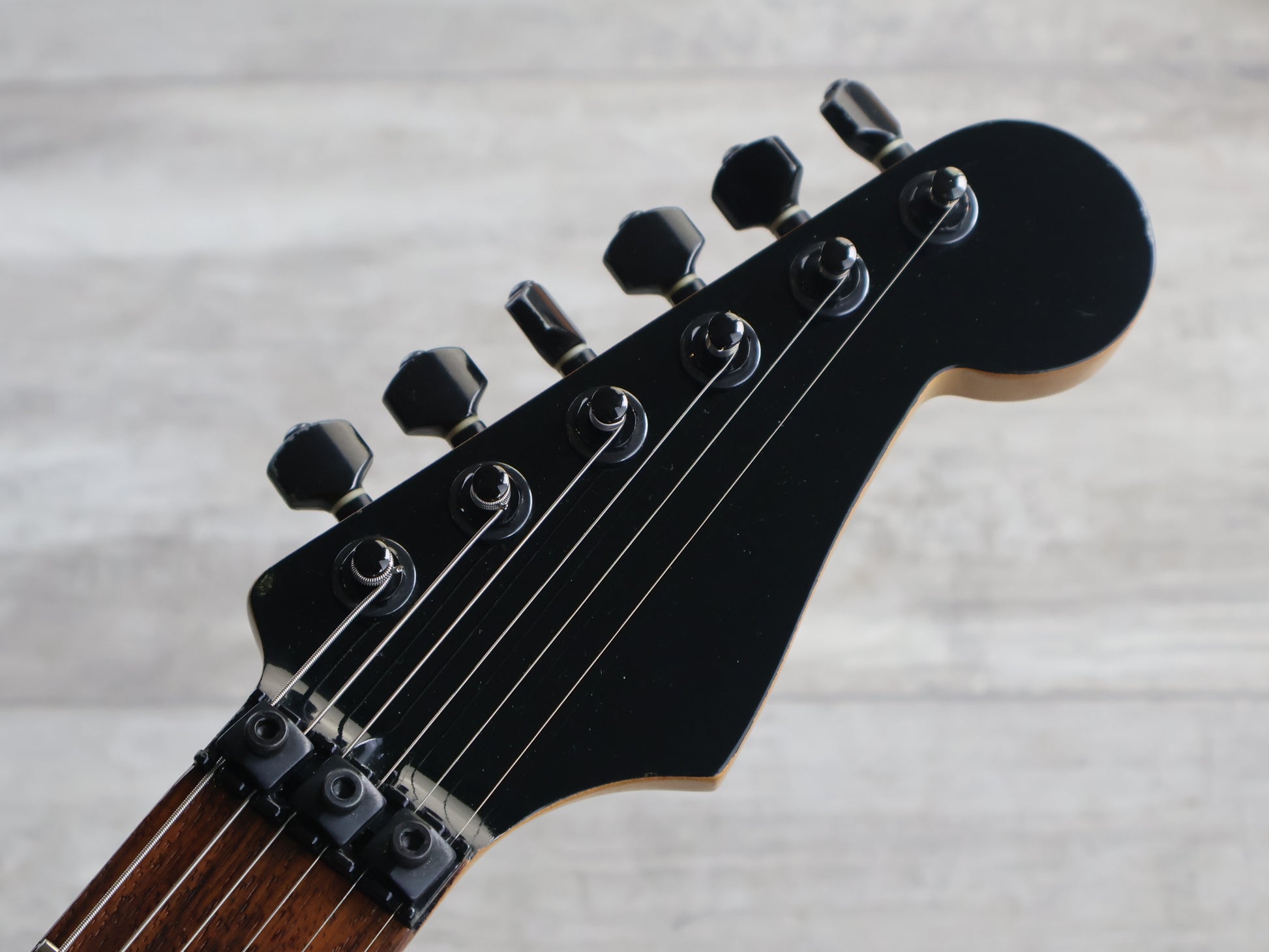 Made in Japan in the late 80's, the original "HM Strat" series were an iconic series of "Heavy Metal" Stratocasters that were so popular that they were reissued in recent years. Originally wearing a "Flash Pink" finish, this one was refinished by a previous owner in a metallic dark blue (although the original finish is still visible underneath and might be able to be recovered).