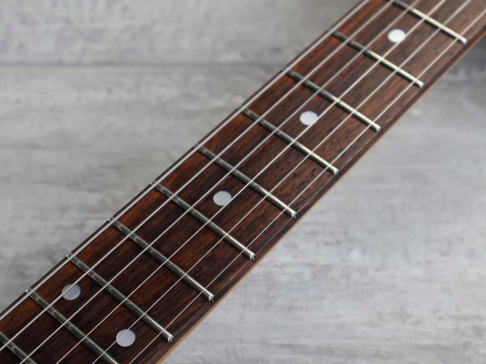 Solid basswood body with a contoured four-bolt cutaway, maple neck with a 24 fret rosewood fingerboard (17" radius, 25" scale length), it weighs 3.6kg's. Loaded with Fender Hot Rod/Dragster HSS pickups, Gotoh tuners and a Kahler Spyder tremolo system, all serviced and working well.