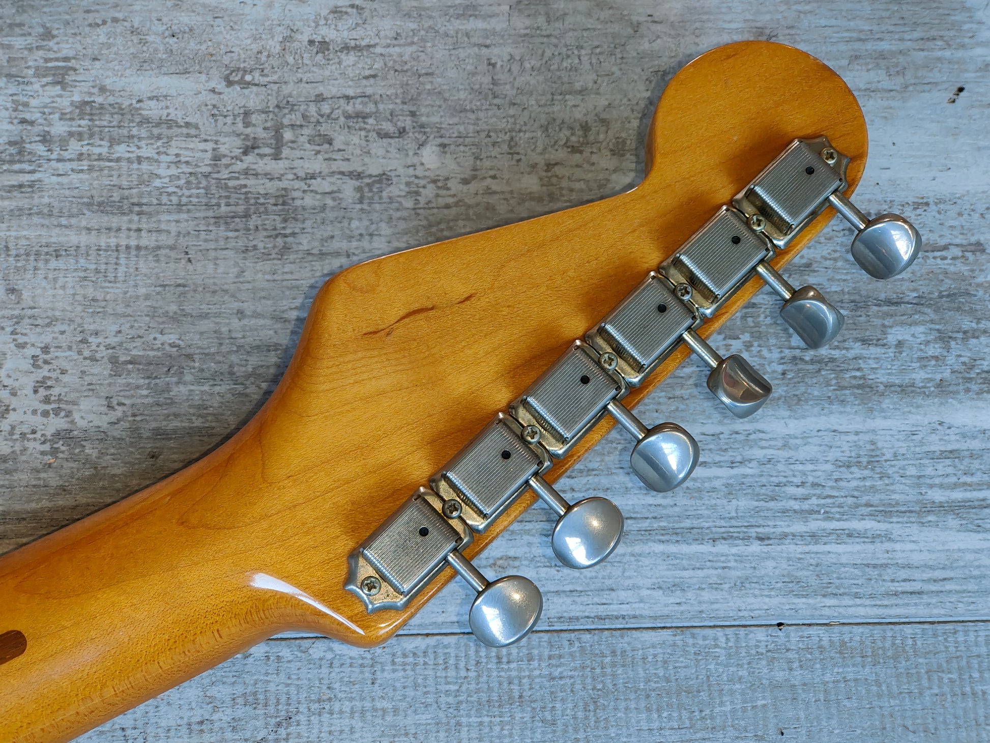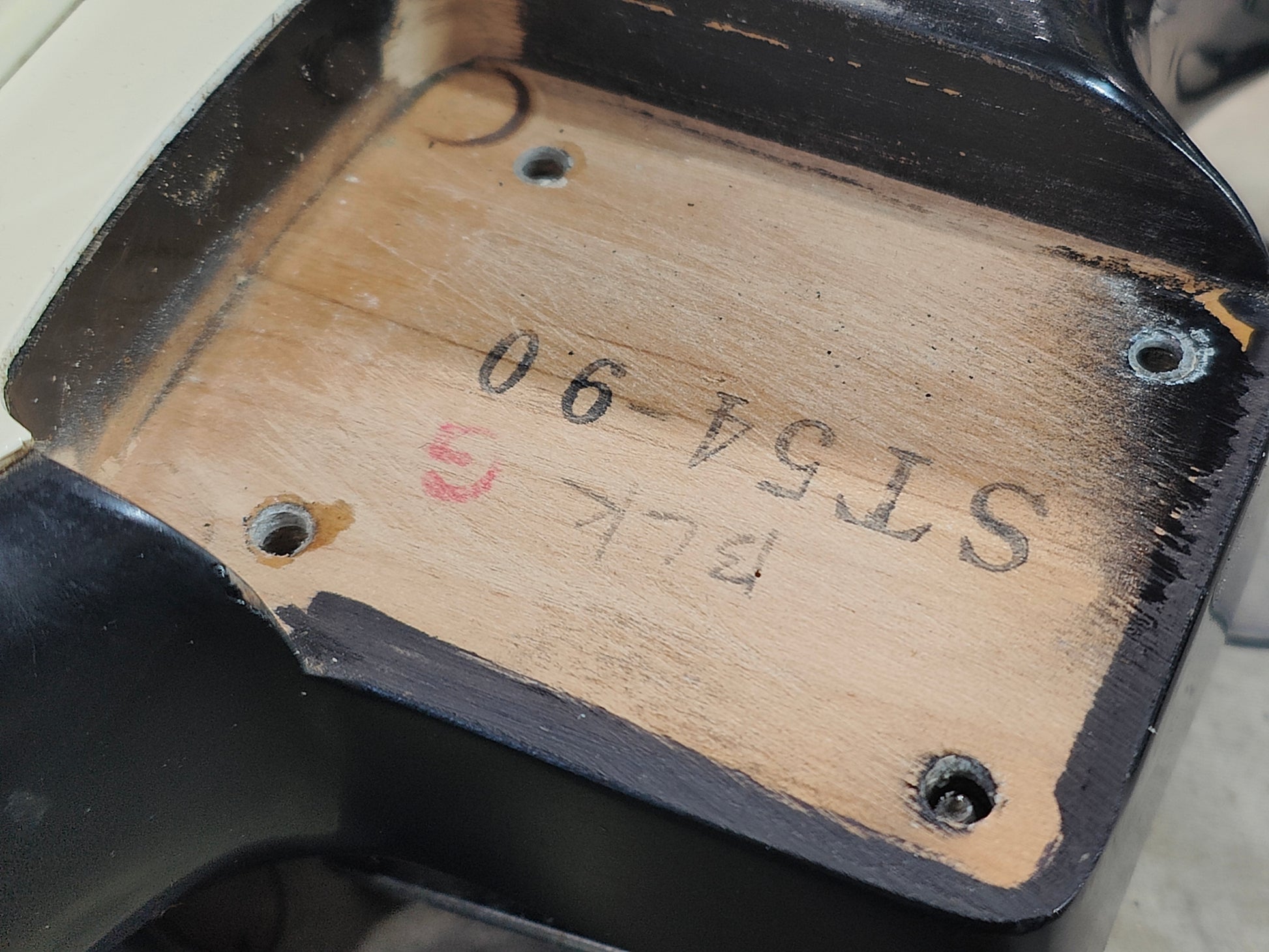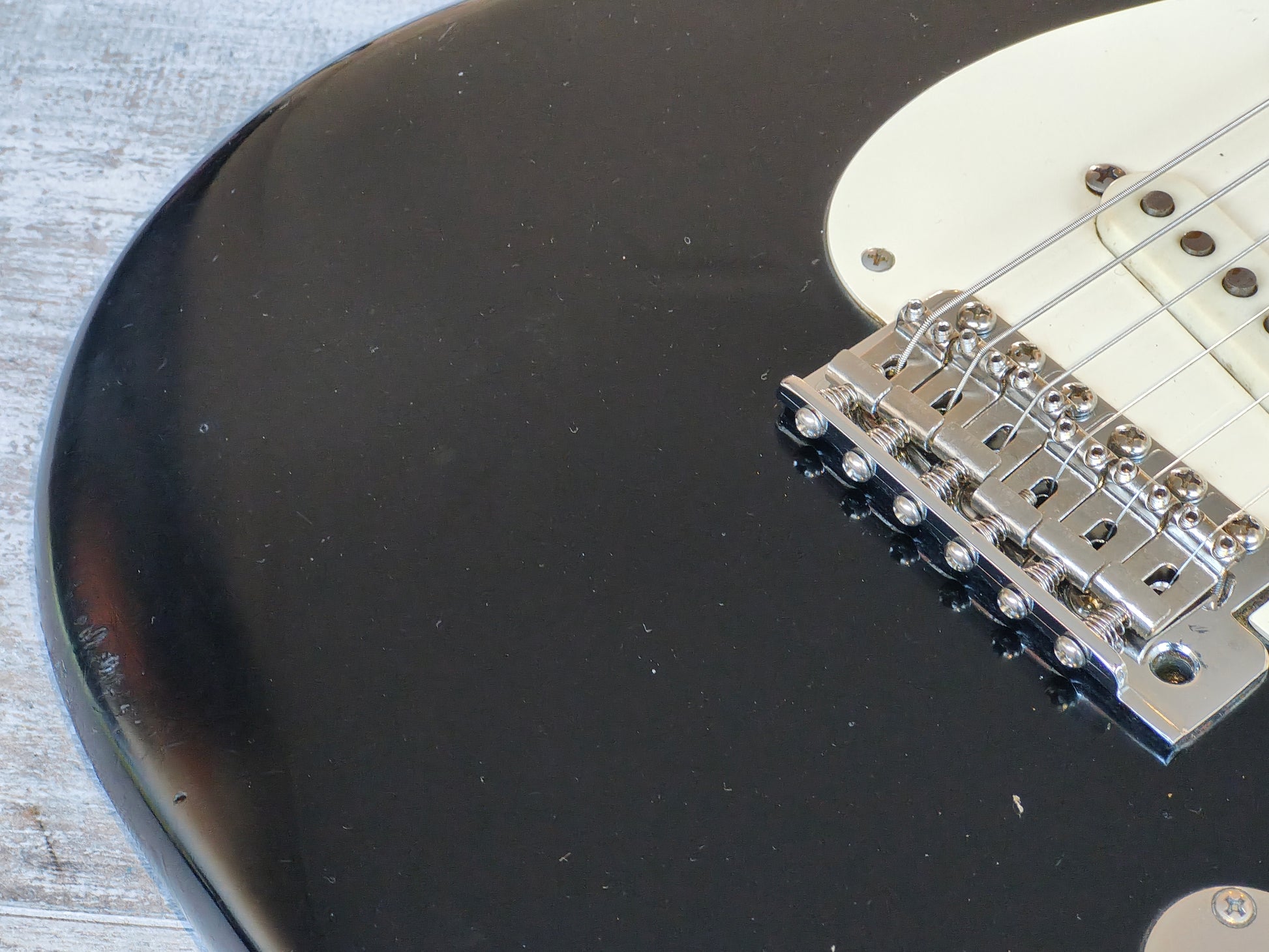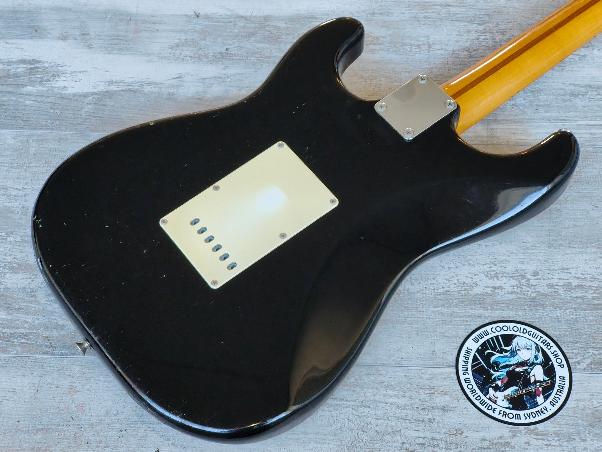 Made by the Fujigen factory in 1989, this is a players grade example of the very high-end ST54-900 '54 reissue model from Fender Japan. Lacquer black finish on an alder body, one-piece maple neck with a soft V '54 profile (43mm nut width, 7.25" radius), it weighs 3.4kg's. Loaded with the original CTS pots, USA 3-way pickup selector and three ST-VINTAGE Fender USA made single coils, this one looks to have an aftermarket bridge/saddles.