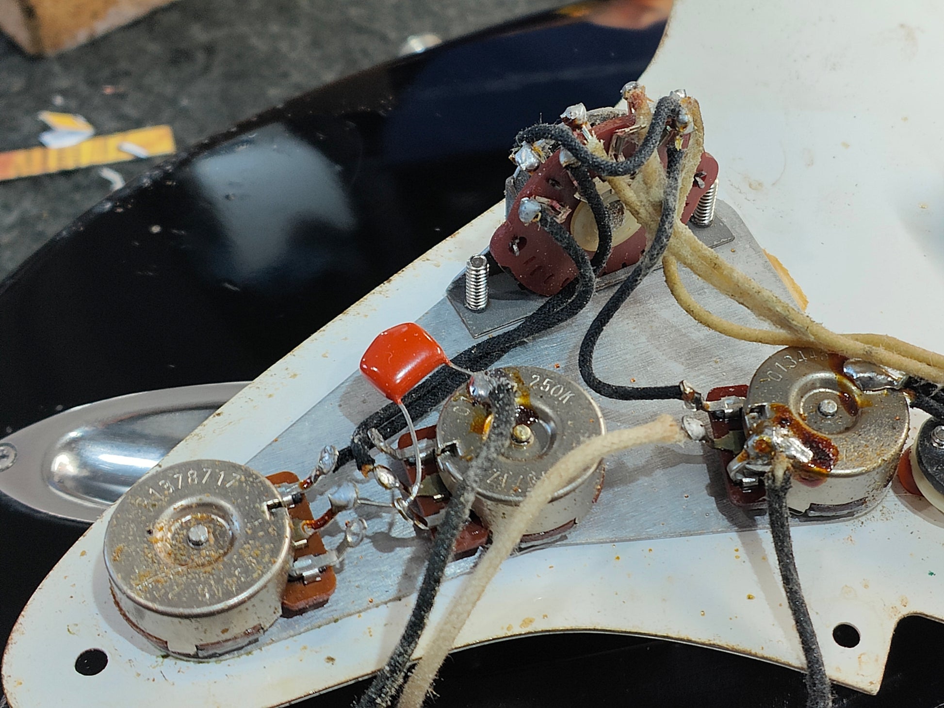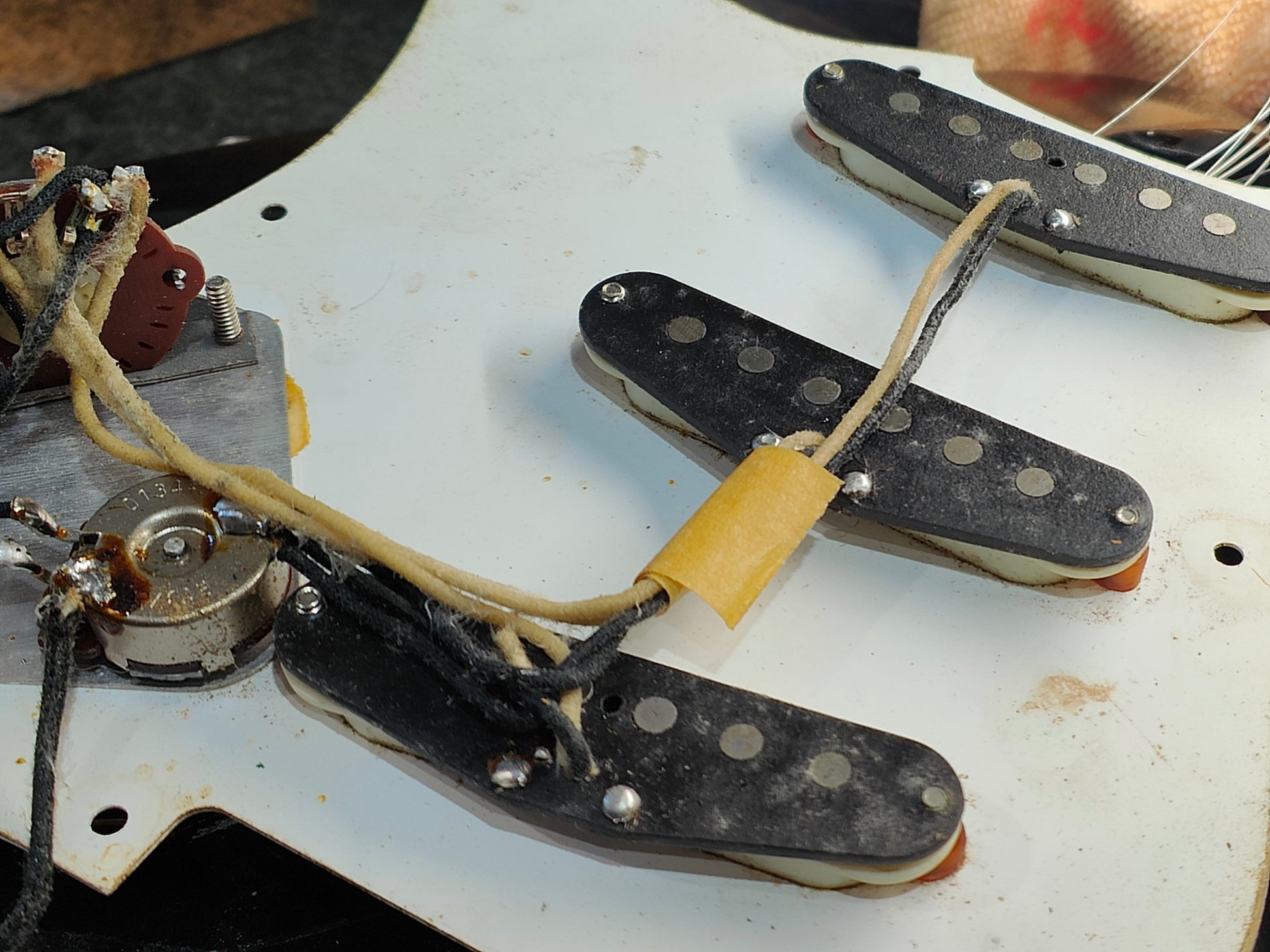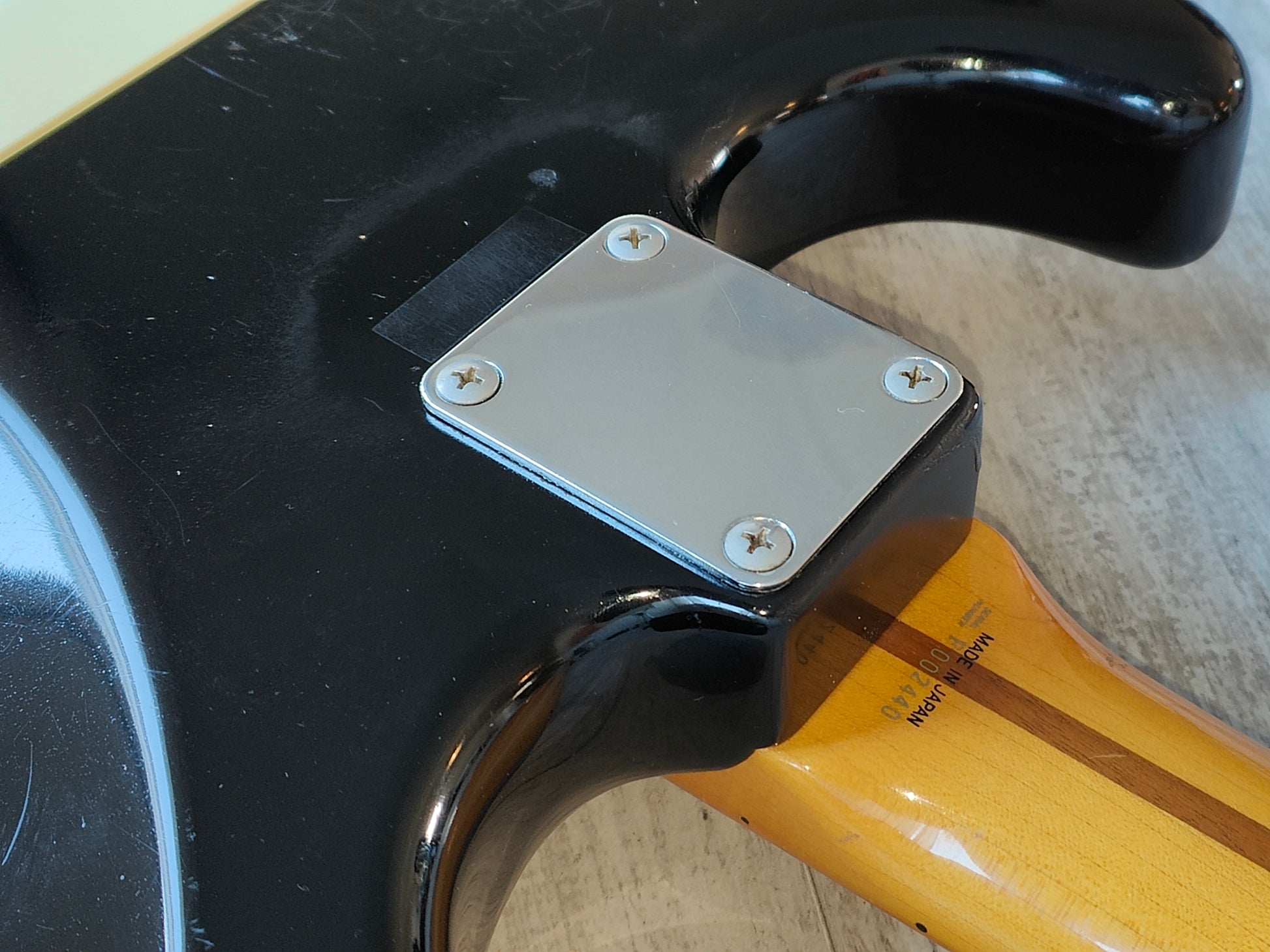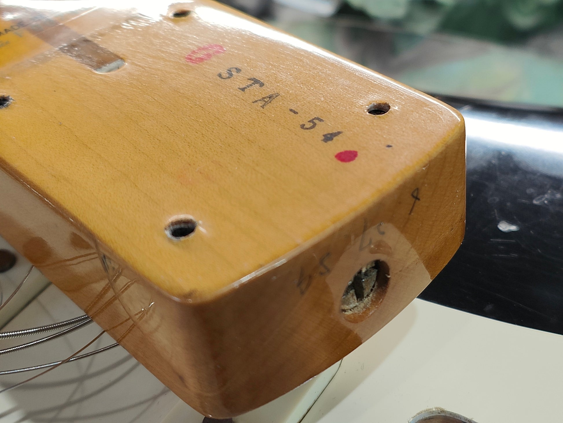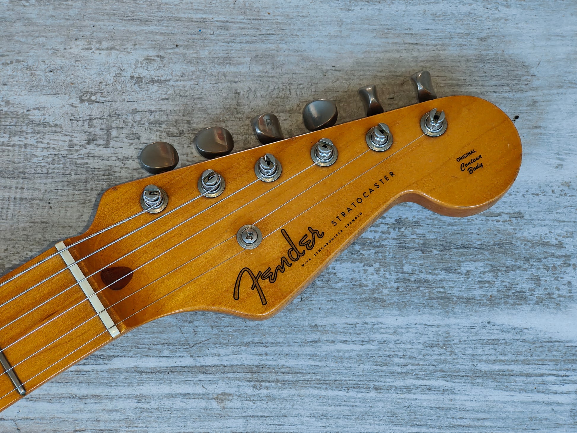 Made by the Fujigen factory in 1989, this is a players grade example of the very high-end ST54-900 '54 reissue model from Fender Japan. Lacquer black finish on an alder body, one-piece maple neck with a soft V '54 profile (43mm nut width, 7.25" radius), it weighs 3.4kg's. Loaded with the original CTS pots, USA 3-way pickup selector and three ST-VINTAGE Fender USA made single coils, this one looks to have an aftermarket bridge/saddles.
