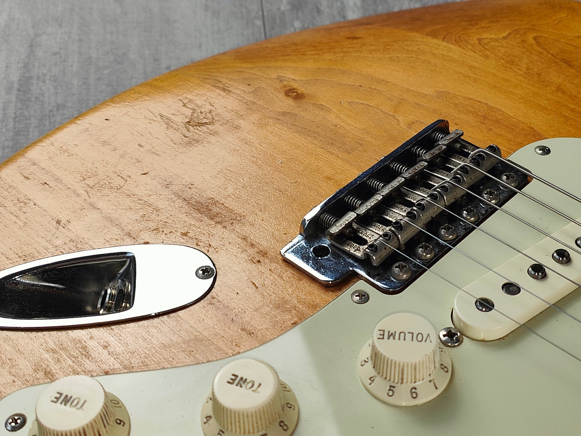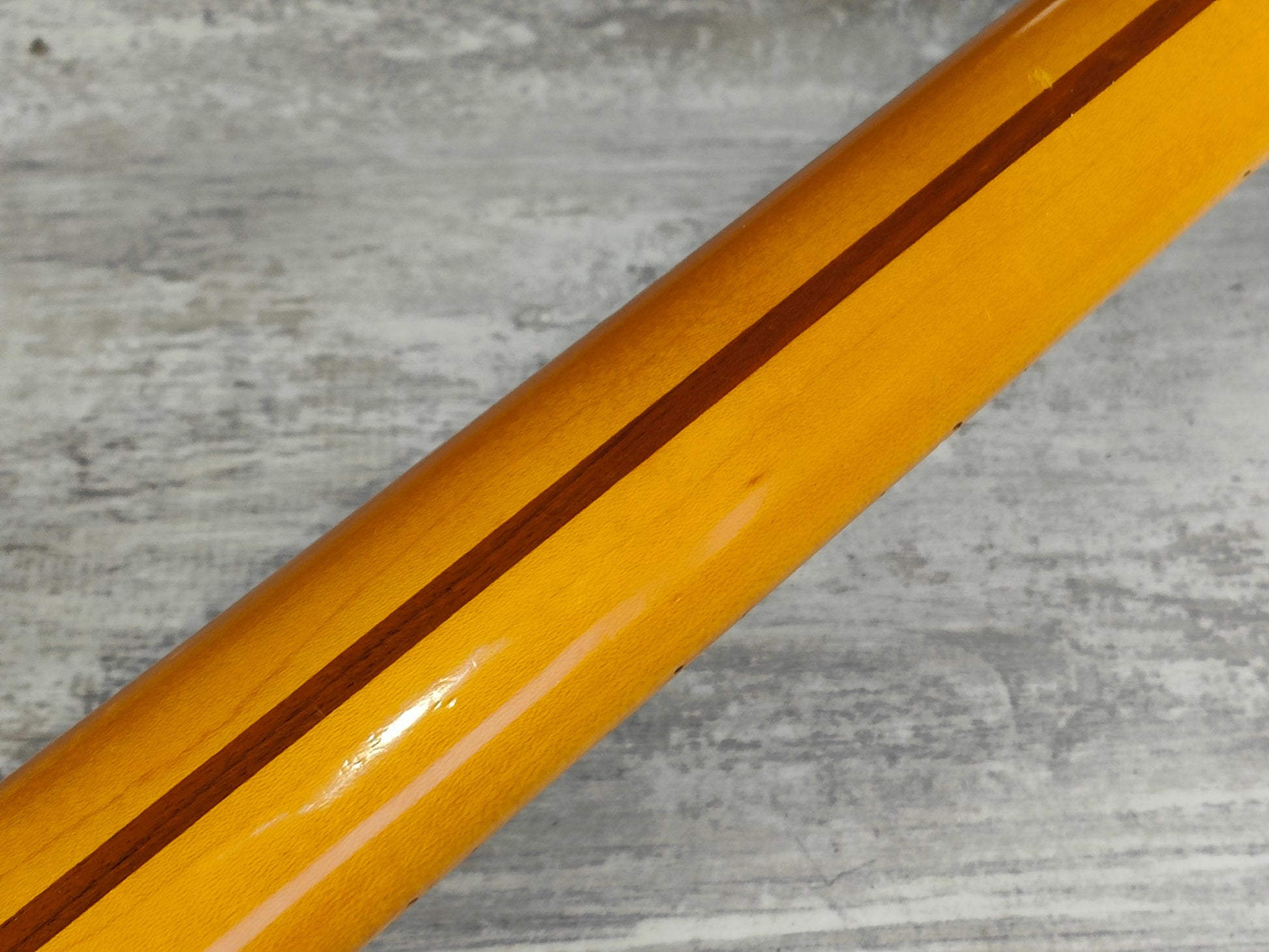 Basswood body (that the previous owner stripped the finish off) with a maple neck shaped with the classic '57 slim C neck profile (7.25" radius, 43mm nut, 648mm scale length), it weighs 3.1kg's. Has a replacement loaded pickguard with what looks to be reasonably high quality alnico single coils and CTS pots. The original tuners and bridge work as they should.