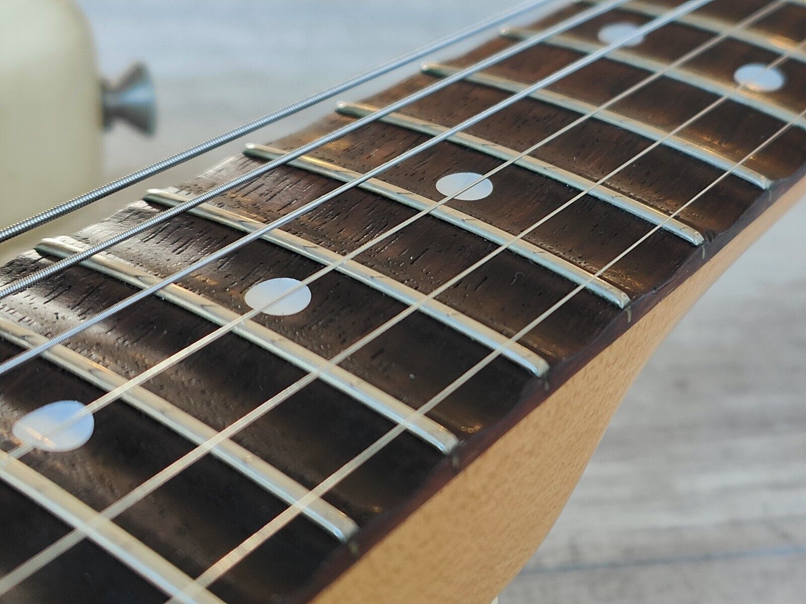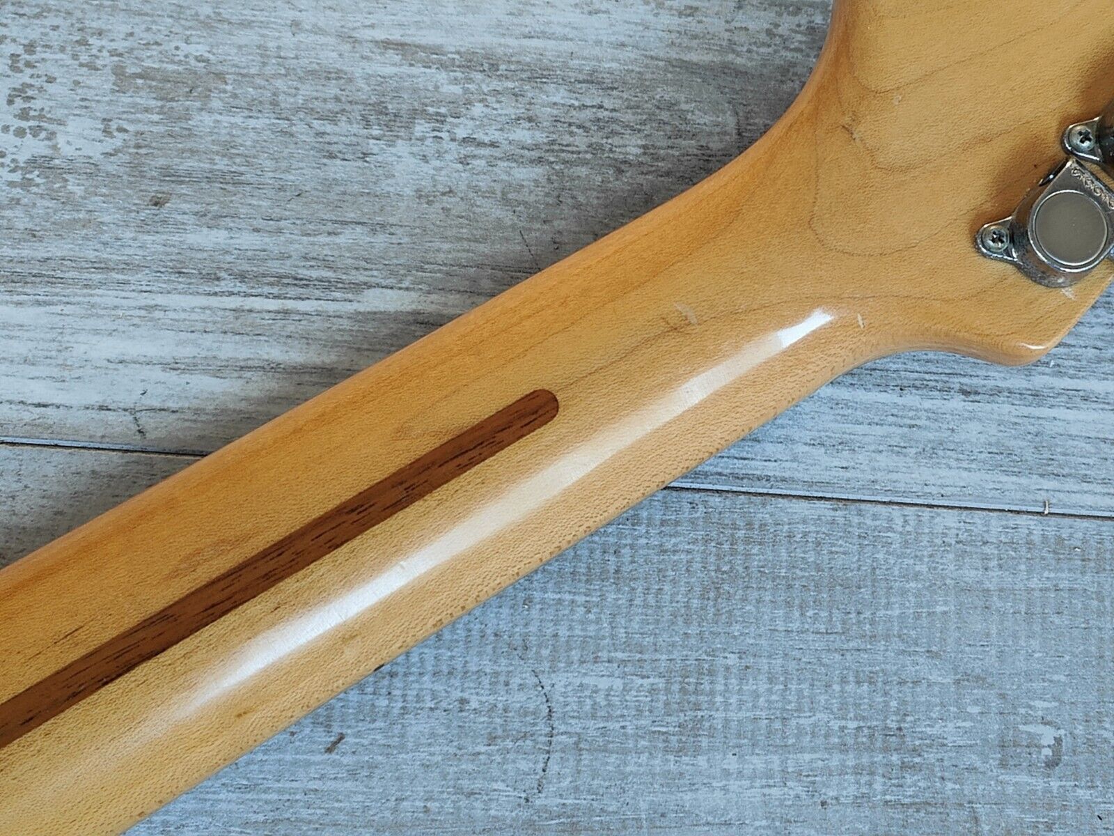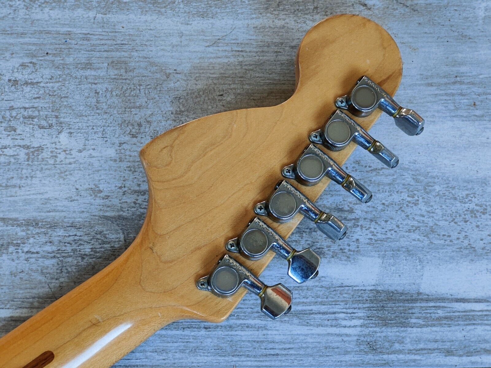 Part of the famous "E Series" of guitars made by the Fujigen factory in the mid to late 1980's, this is a rare "unofficial" Richie Blackmore model in Olympic White. This one dates to 1989 (based on the pot codes) and is built with a basswood body bolted to a maple neck and a factory "Blackmore" style scalloped rosewood fingerboard. 7.25" radius with a nice slim C profile neck, weighs 3.5kg's.