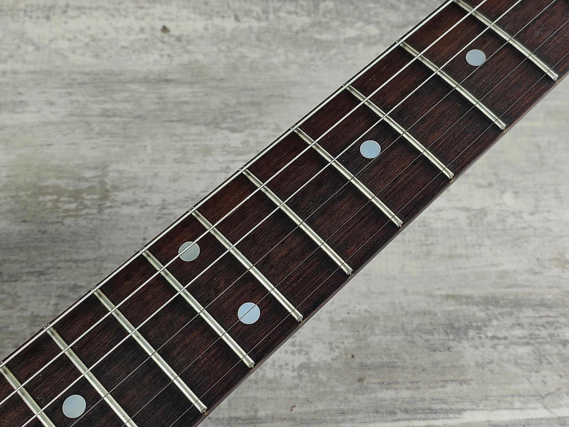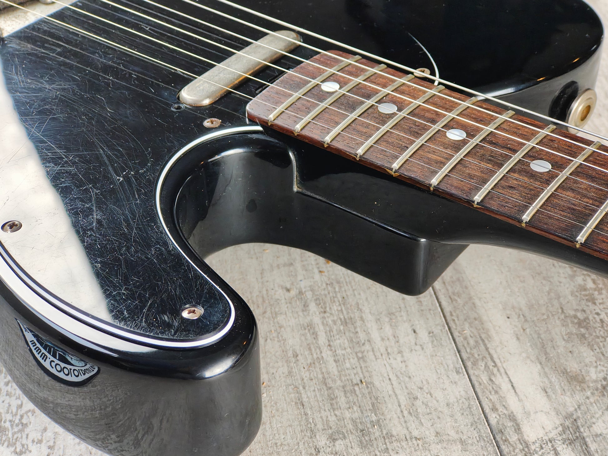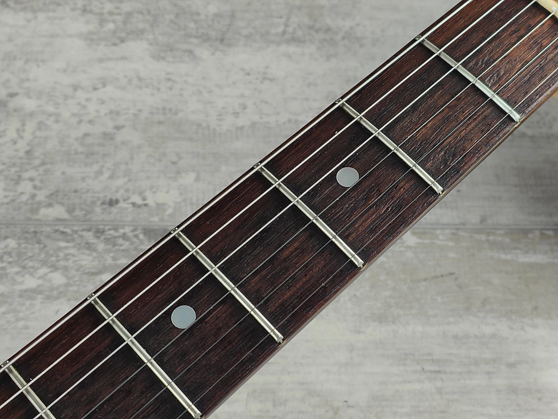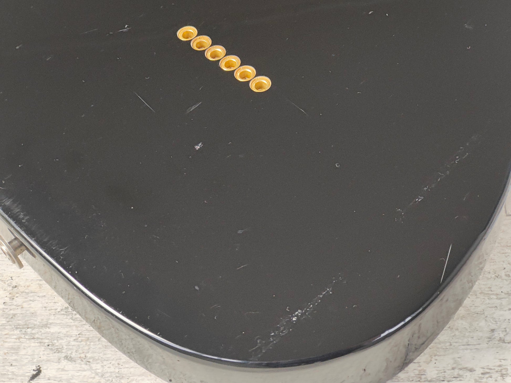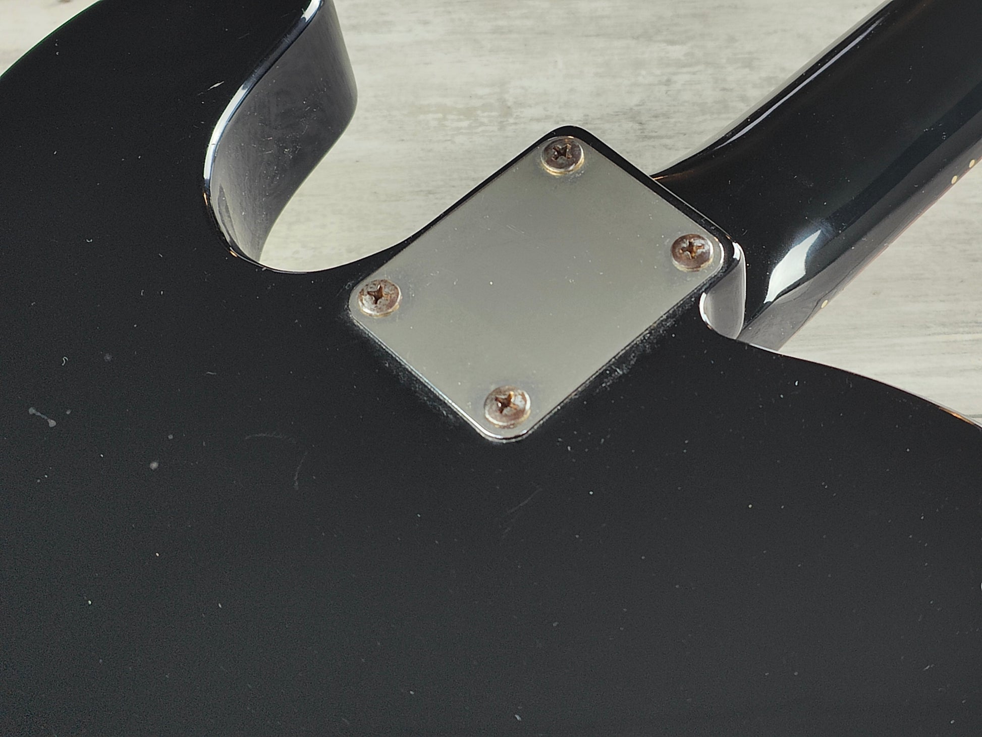 This one's been heavily modified by a previous owner as pictured although it still has the original pickups and pots installed. The replacement parts include Schaller tuners, a 1980's Fender ashtray bridge with brass saddles, a black pickguard and chrome control/neck plates.