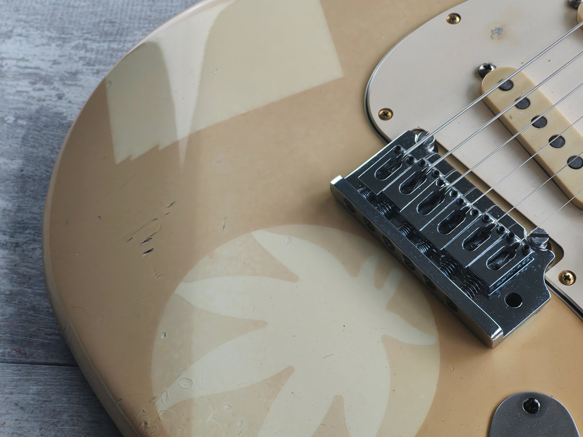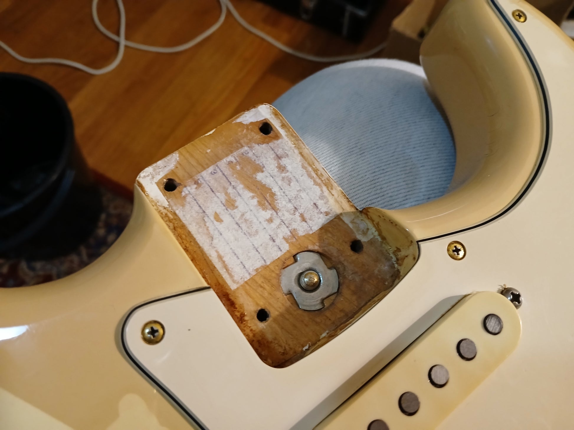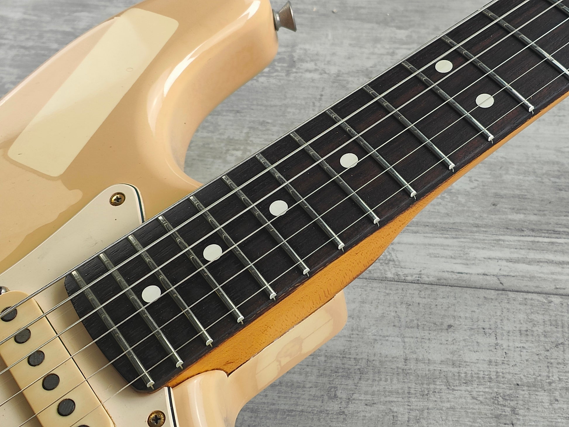 A classic Fender American Standard Stratocaster built in the USA in 1989. Two piece alder body with a glossy aged white urethane finish (with plenty of sticker tan, including some very obvious ones..) bolted to a maple neck with a modern C profile and 22 fret rosewood fingerboard (9.5" radius, 648mm scale length), it weighs 3.6kg's. Looks to be all original as pictured with the exception of a replacement bridge.