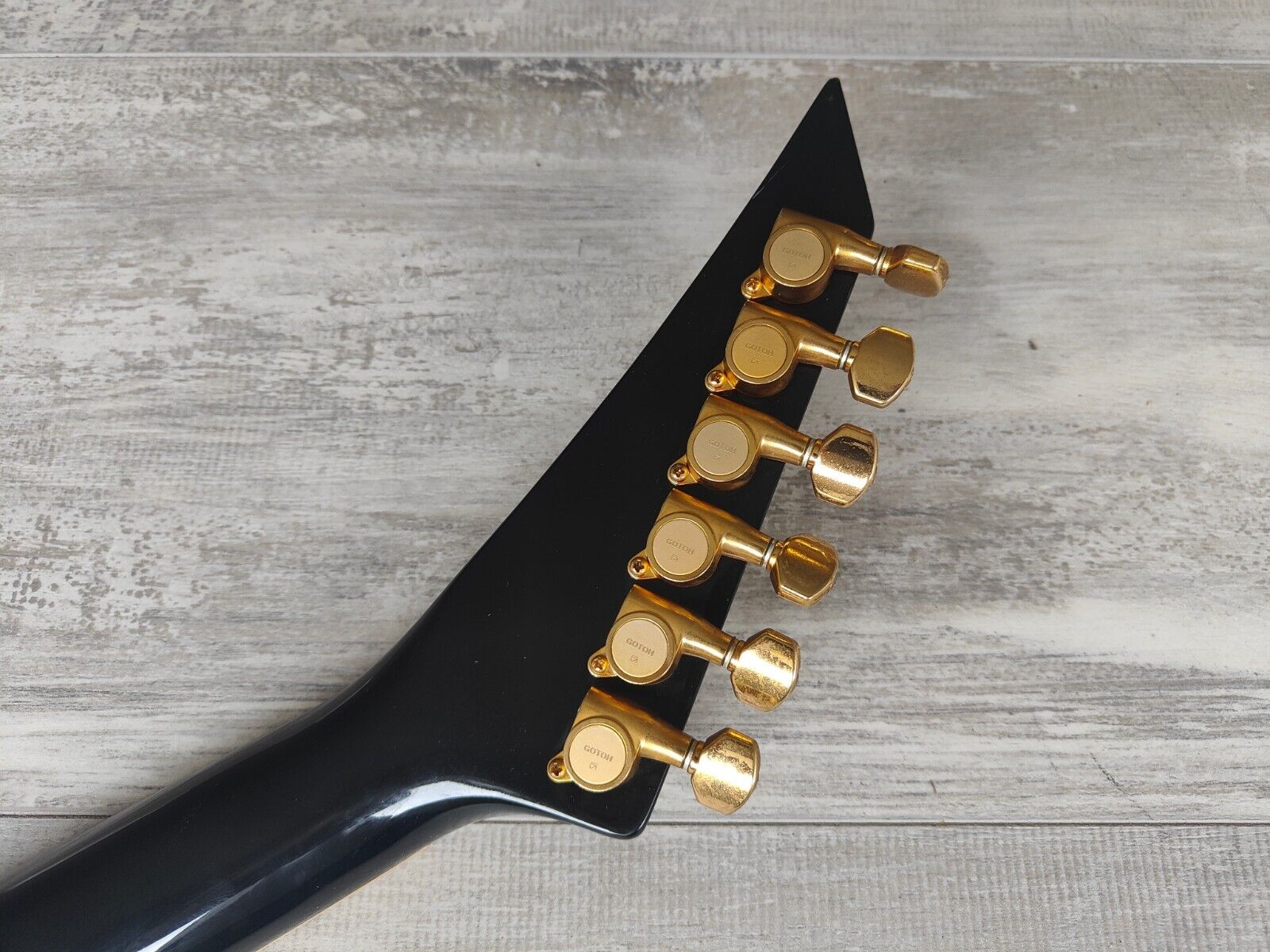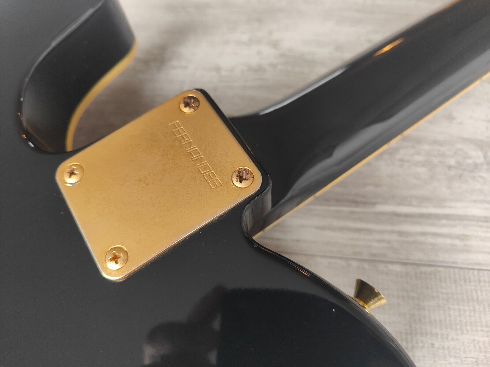 Made by Fernandes in 1989, the TEJ is an ultra-modern variation on the Fender Telecaster design. Glossy black finish on the body with cream binding, Stratocaster style tremolo, pointy headstock, Gotoh tuners and high-output passive HS pickup. 22 frets with a 648mm scale length and 43mm nut width, it weighs 3.6kg’s.