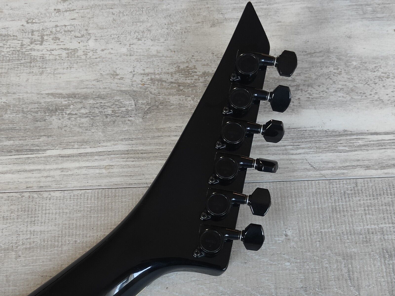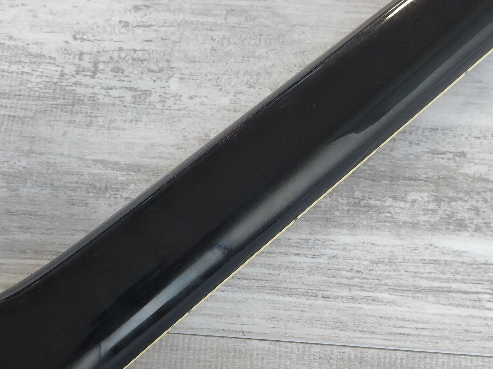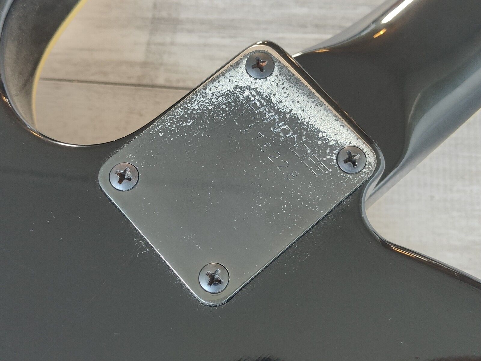Made by Fernandes in 1989, the TEJ is an ultra-modern variation on the Fender Telecaster design. Glossy black finish on the body with cream binding, pointy headstock, Gotoh locking tuners and upgraded EMG active pickups/pots. 22 frets with a 648mm scale length and 43mm nut width, it weighs 3.4kg’s.