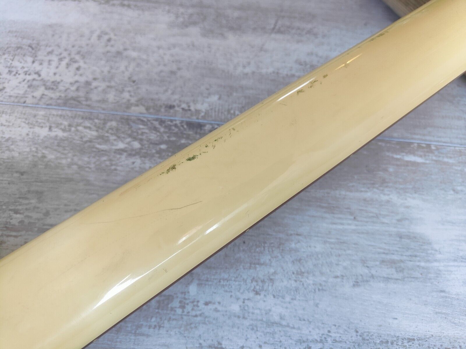 Made by the Fujigen factory in 1989 as part of their "Collection" series of primarily Gibson style builds, the EB-65 was their take on the EB-0 design. Mahogany double cutaway body with a set mahogany neck, 20 fret rosewood fingerboard (34" scale length, 12" radius), it weighs 3.5kg's. Vintage white urethane finish has faded to a nice cream colour, it seems to be all original with the exception of some straplocks and new knobs.