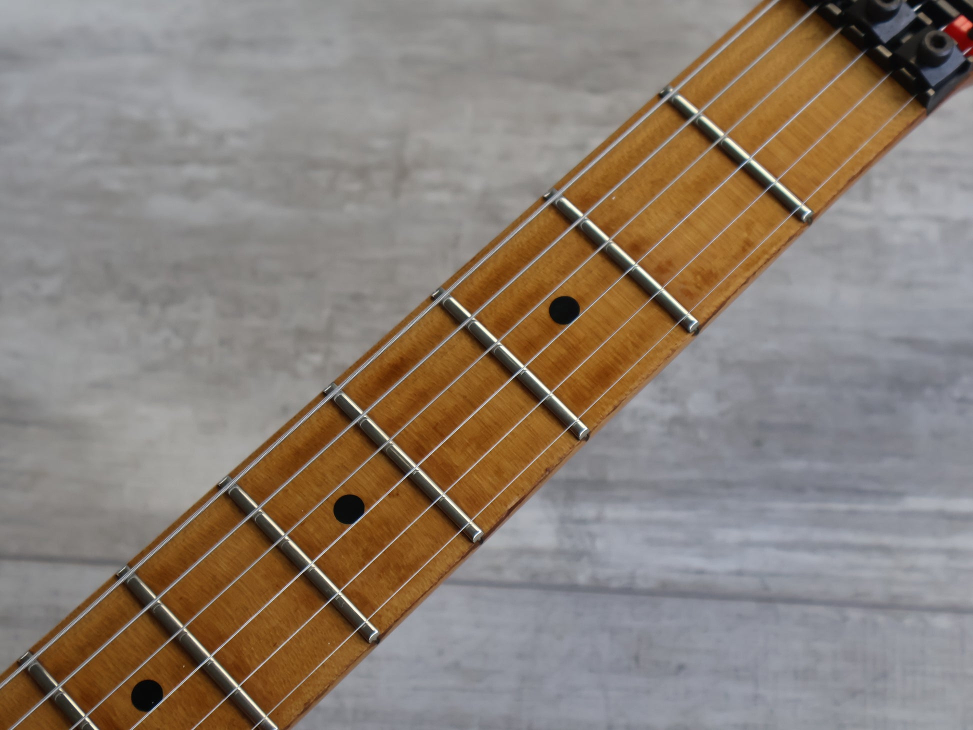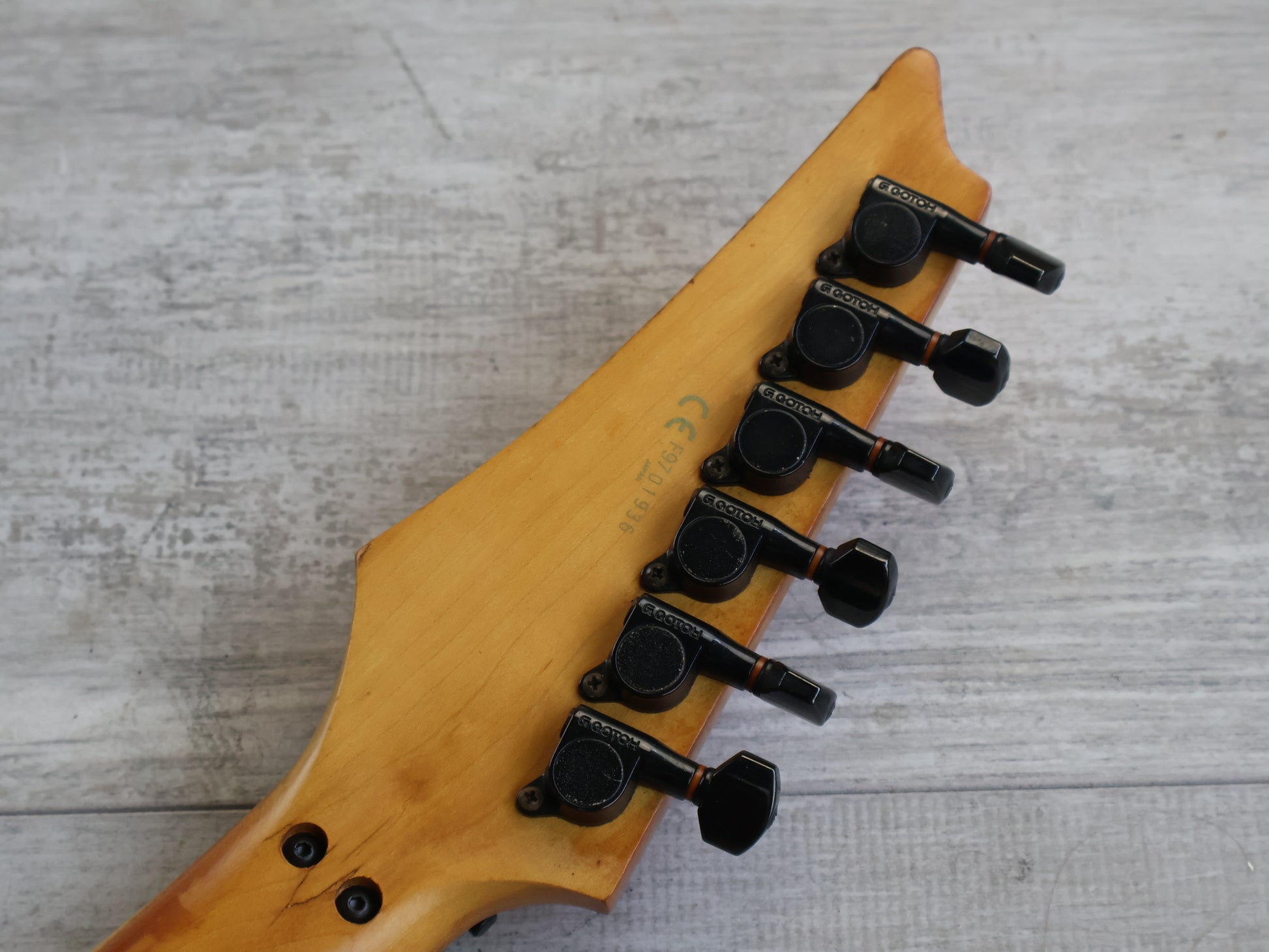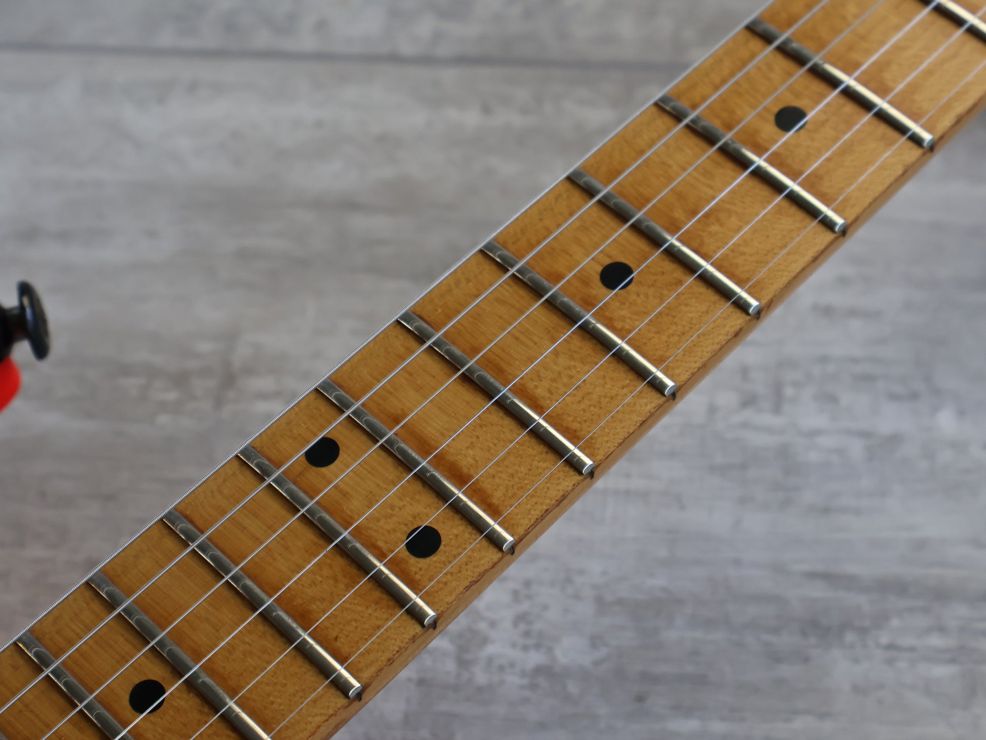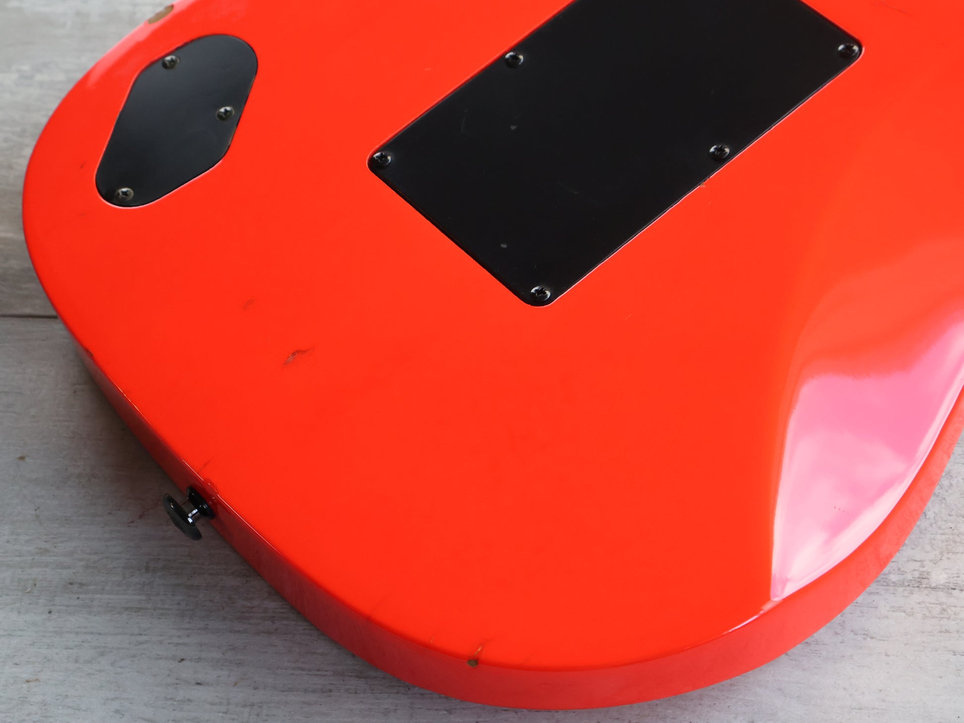 Japanese made in 1989, this is one of the early model RG-550's from Ibanez. Very desirable Road Flare Red finish on the basswood body with a Wizard maple neck and a 24 fret maple fingerboard with dot inlays, weighs 3.3kg's. This one has a Dimarzio Air Norton/Tone Zone Humbucker combo along with the original S1 in the middle position, this one is still loaded with the original Floyd Rose Edge system and Gotoh tuners.