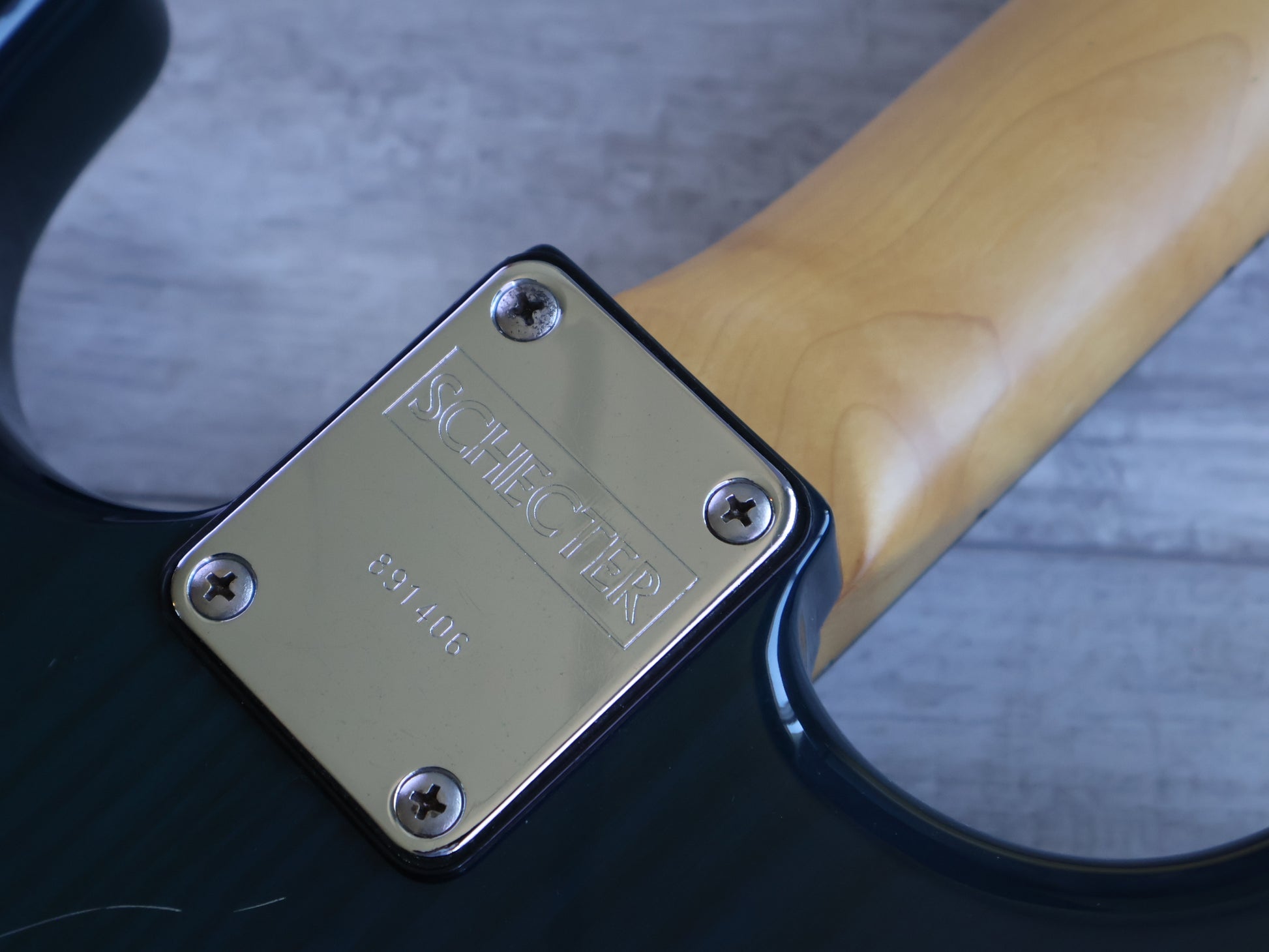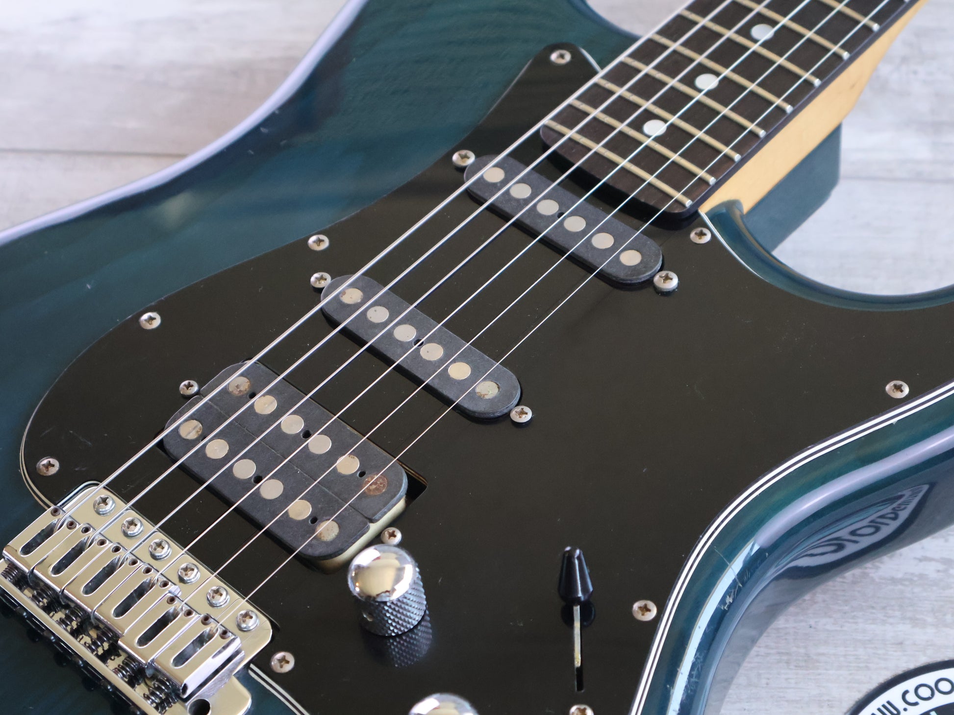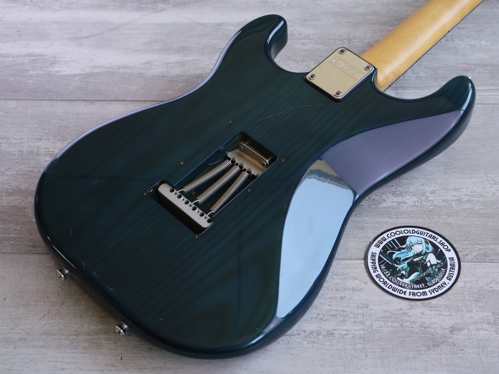 Made in Japan in the late 1980's as part of the Schecter "East Series", these were high quality Stratocaster style guitars made for professional musicians. Solid ash body with a transparent blue/green finish bolted to a maple neck with a 22 fret ebony fingerboard, weighs a hefty 4.6kg's. Loaded with three USA made Schecter pickups (coil split push pull for the humbucker), Schecter branded tuners and a high quality tremolo system, this one appears to be all original.