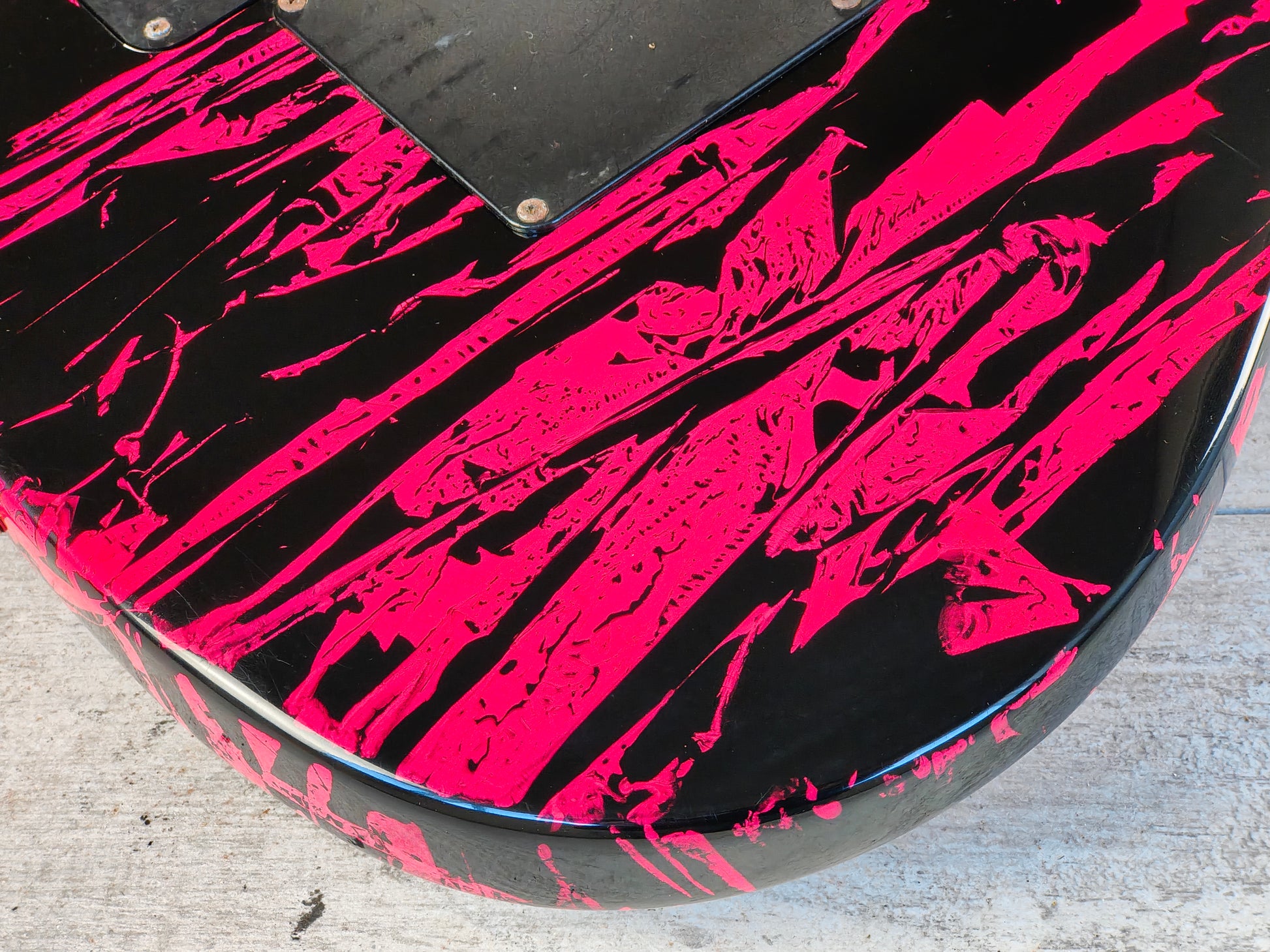 A rare Japanese made Magna series superstrat from Aria Pro II, this is an artist model for the guitarist of the band Aura and wears a fluro pink graffiti style finish from the factory.