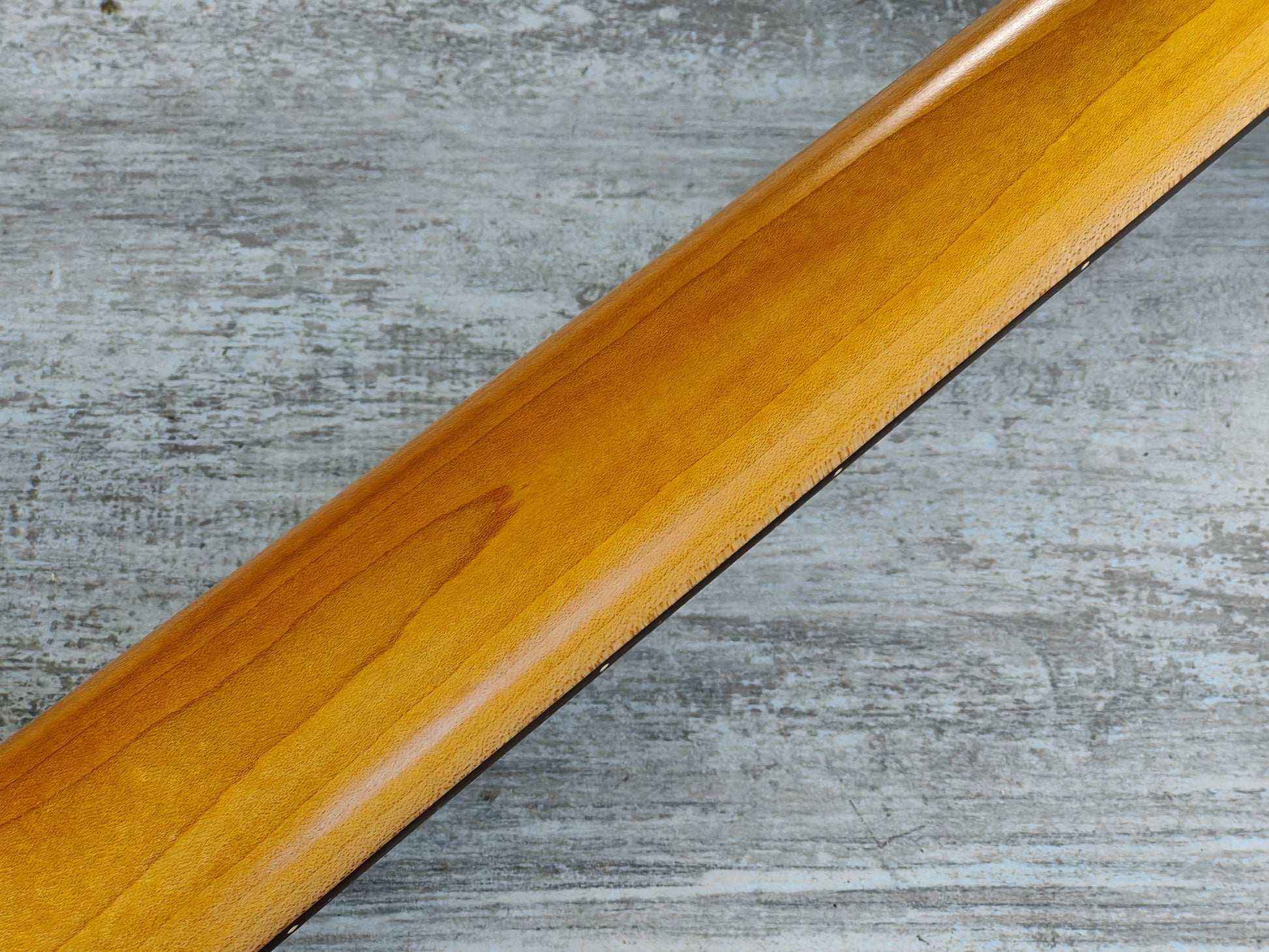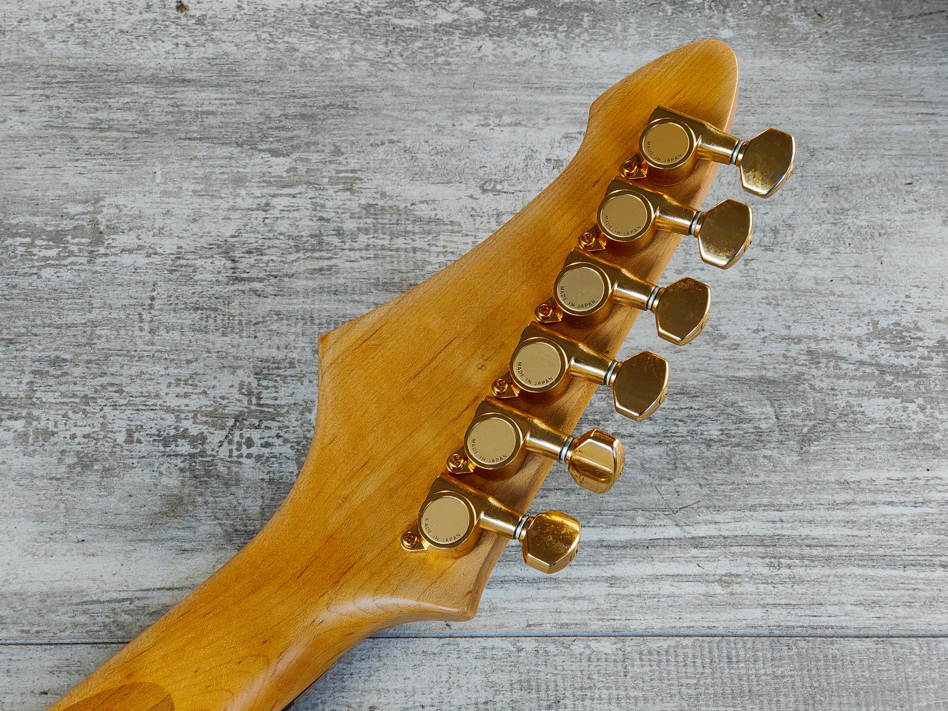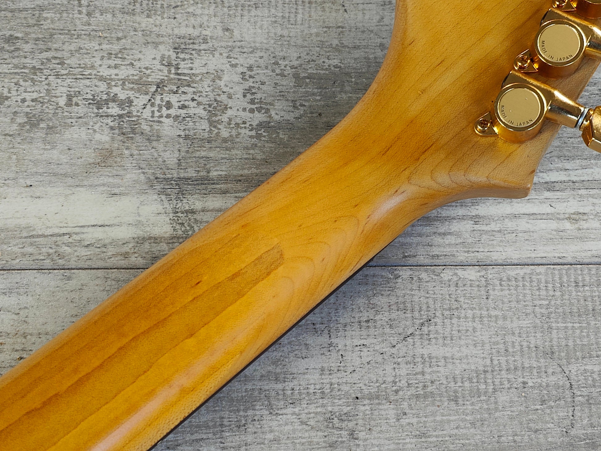 This signature model is based off the MA-480 with a carved alder body bolted to a slim maple neck with a 24 fret rosewood fingerboard (13.75" radius, 648mm scale length), weighs 3.2kg's. Factory loaded with TS-1 "Twin Bar" pickups in the neck and middle position and a OH-2AL humbucker in the bridge (coil splittable with a push/pull on the tone control) along with an Aria Pro II branded double locking tremolo system and Gotoh tuners.