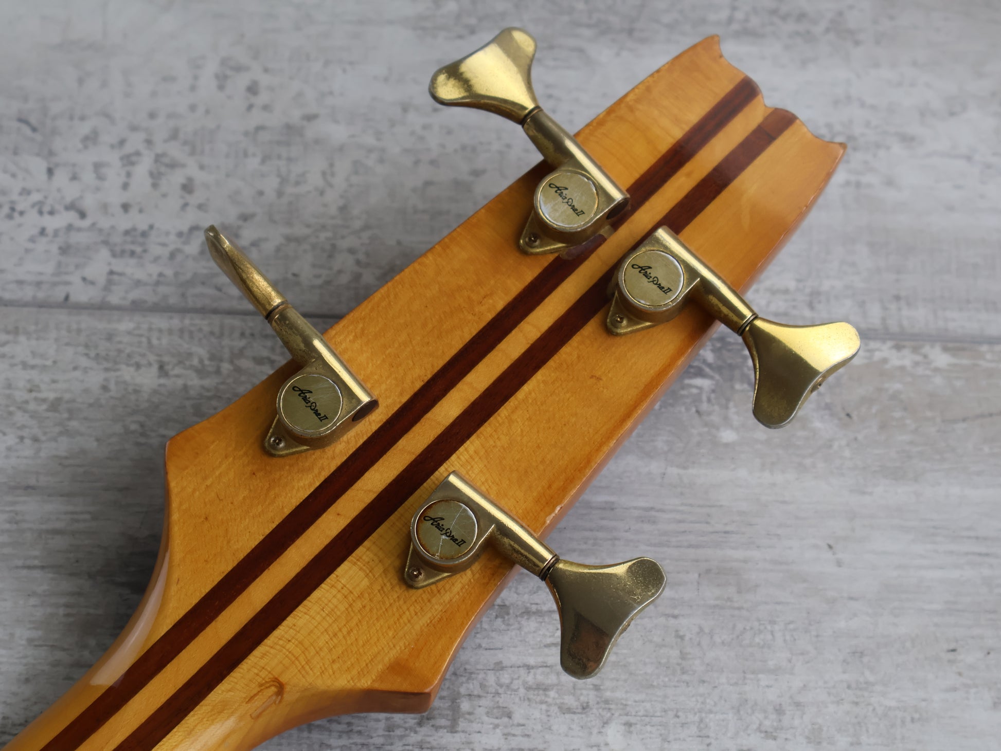 The Aria Pro II SB-800 was a Japanese made bass that was one of the few SB models continuing the neckthrough legacy after the closure of the Matsumoku factory. Favoured by bass legends including Cliff Burton, Jack Bruce and John Taylor, the SB-800 features a Sen ash body, a smooth maple/walnut transmit neck (and heel-less cutaway) and a rosewood 24 fret fingerboard (42mm brass nut with a reasonably slim neck profile, 34" scale length). Weighs just over 3.8kg's.