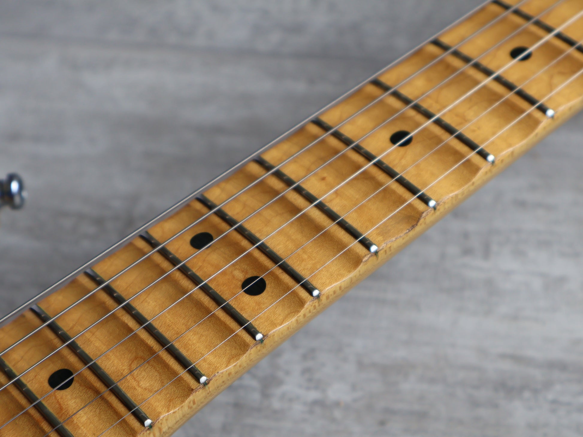 Beautifully relic'd condition with plenty of signs of wear and tear, a previous owner also gave it a swimming pool routing so you can load it with whatever pickups you need. The frets have plenty of life left playing shiny and smooth, the truss and neck-tilt adjustor work as they should and the neck is straight.