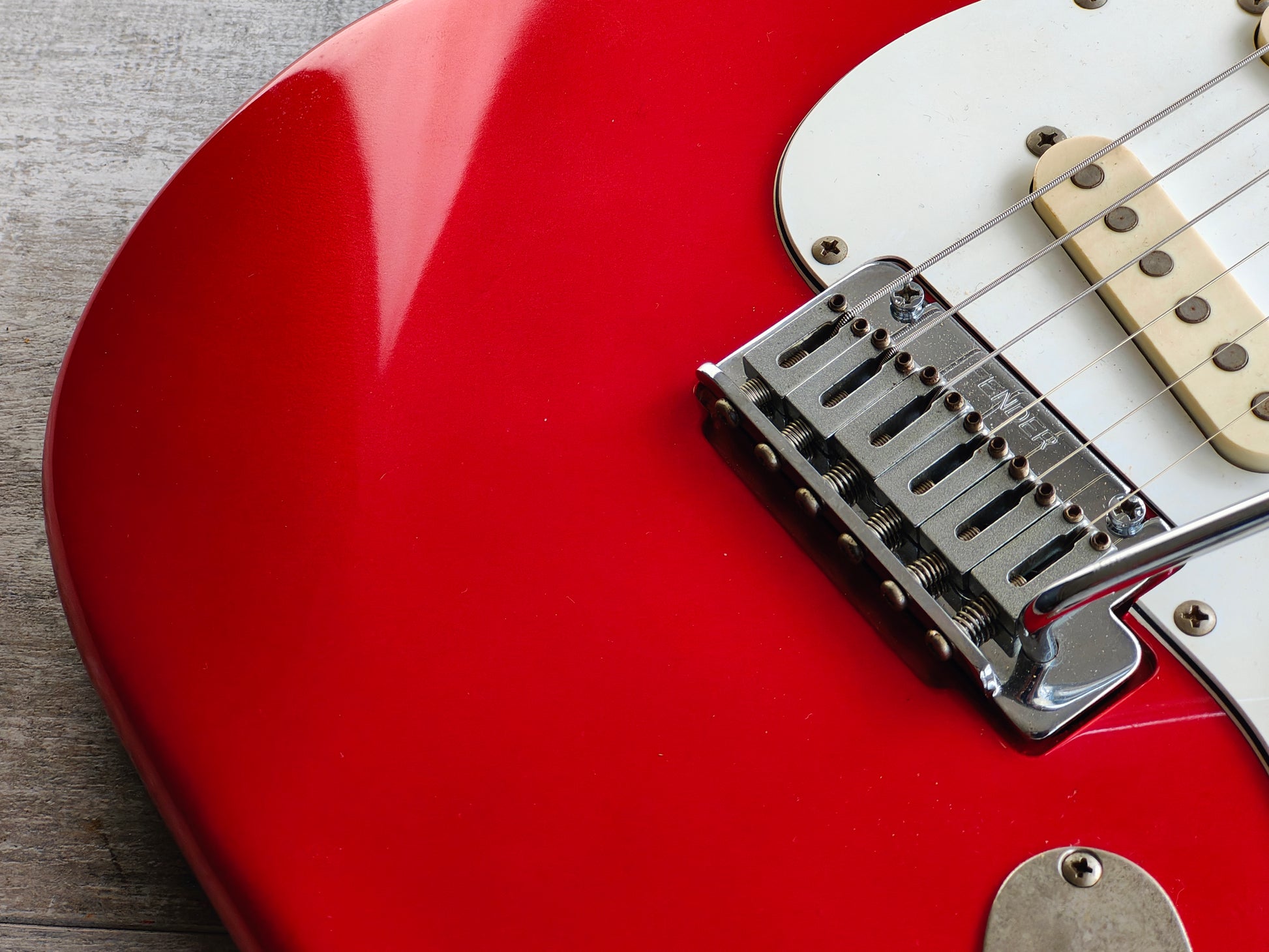 The STS-550 is essentially a Strat that's masquerading as a Mustang. Compact poplar body wearing a glossy "Cosmo Red" finish bolted to a maple neck with a 22 fret rosewood fingerboard (610mm scale length, 39mm nut width), it weighs 3.4kg's. Loaded with three single coils controlled by a 5-way selector and master volume/tone controls and an ENDROX tremolo system, appears to be all original.