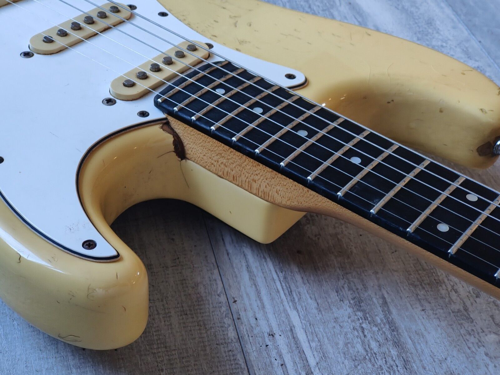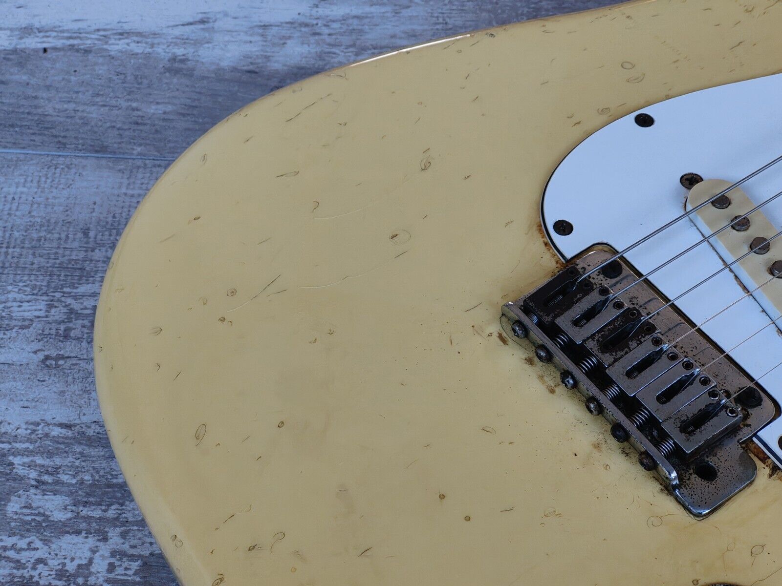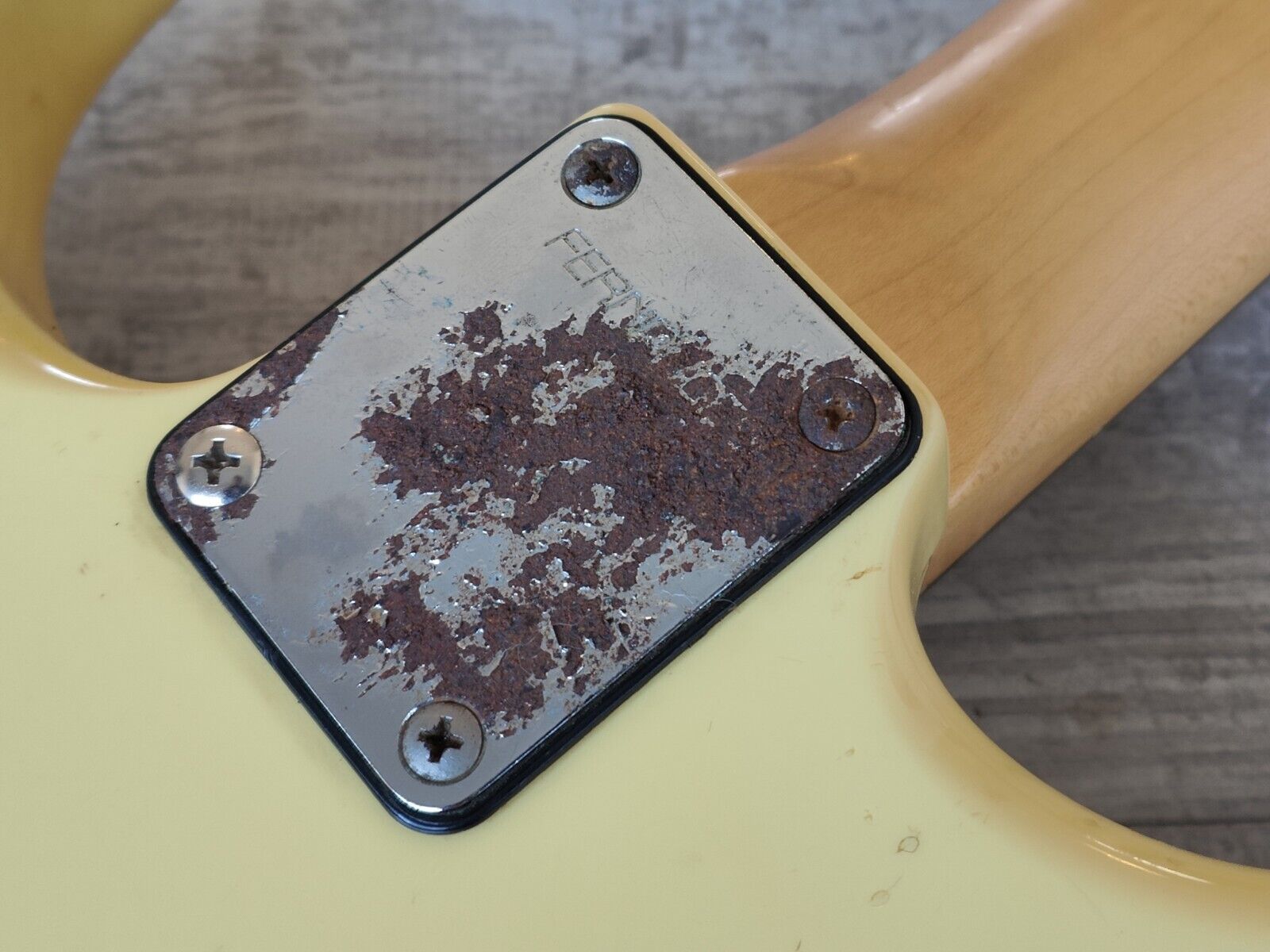 A high end Japanese made Stratocaster model from Fernandes that's seen one hell of a life. This FST-100 was made in 1990 and features a yellowed Vintage White finish with a maple neck and a 22 fret ebony fingerboard, weighing 3.4kg's. Loaded with a set of generic single coil pickups and an aftermarket pickguard.