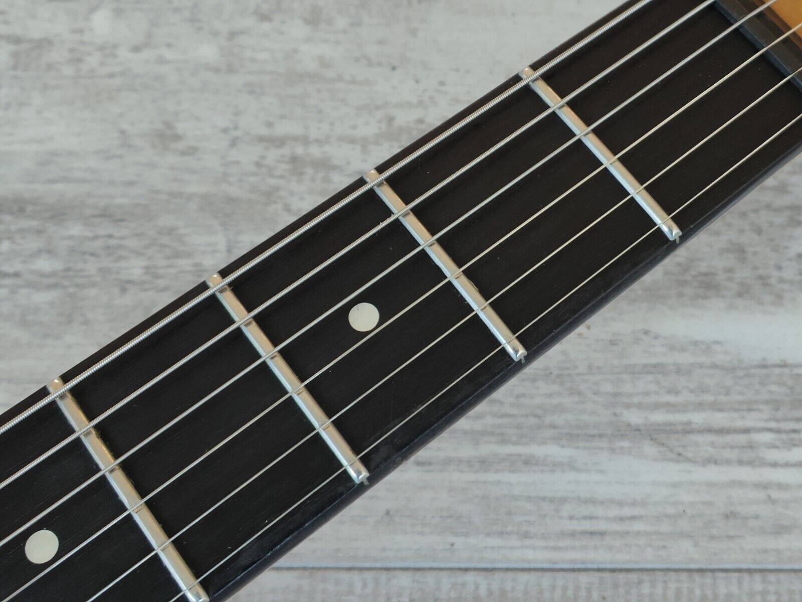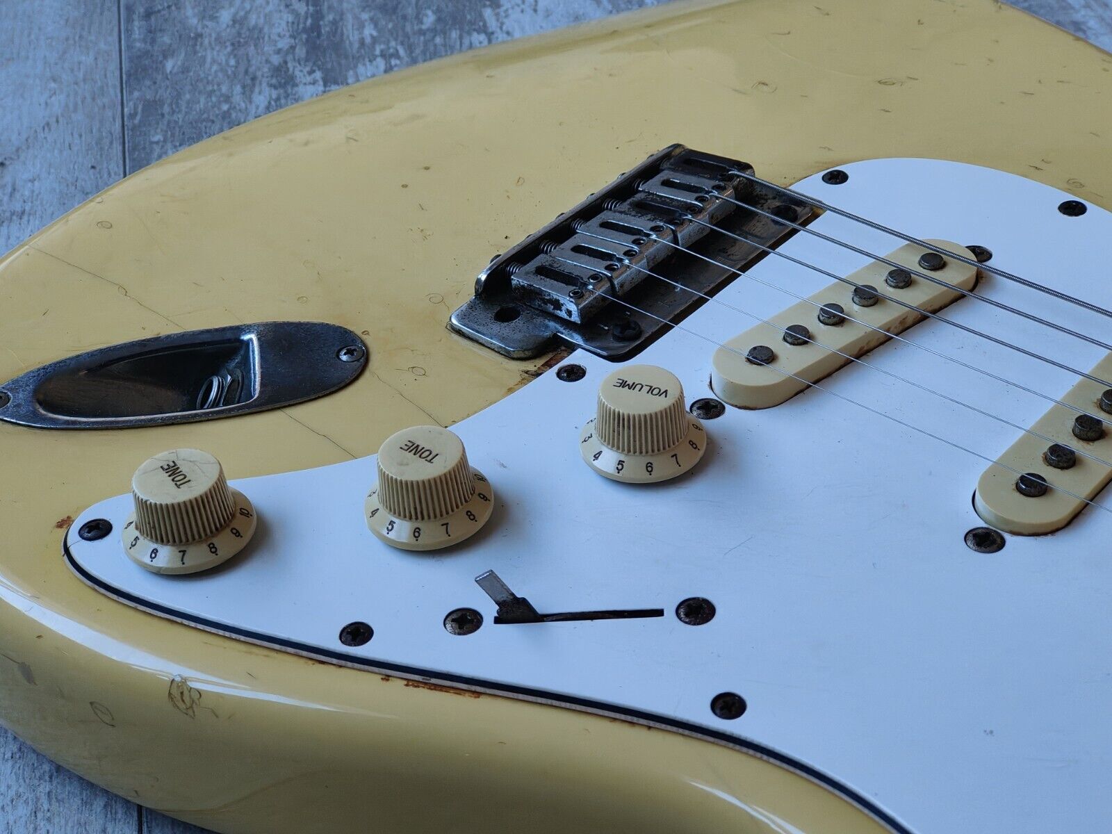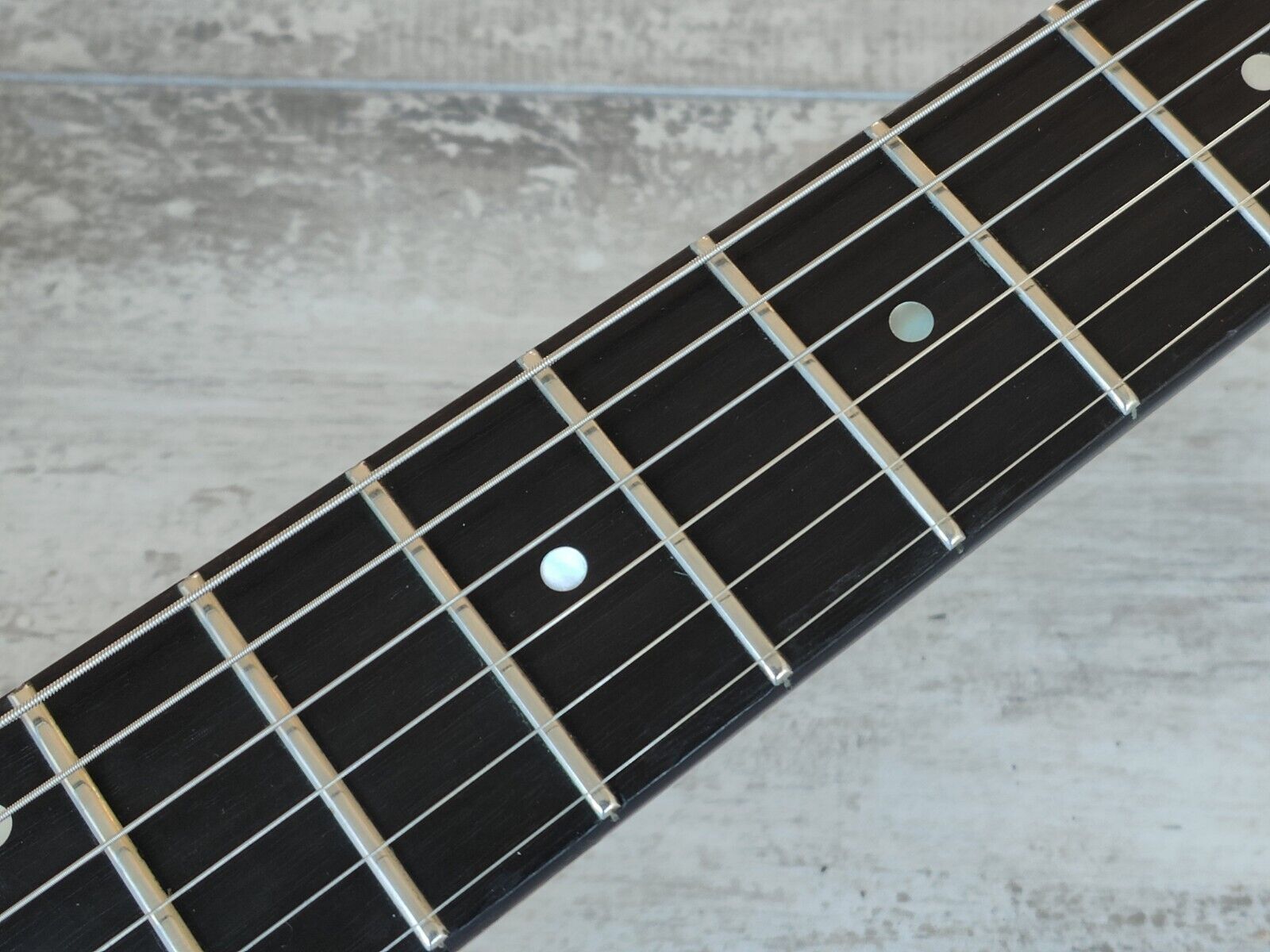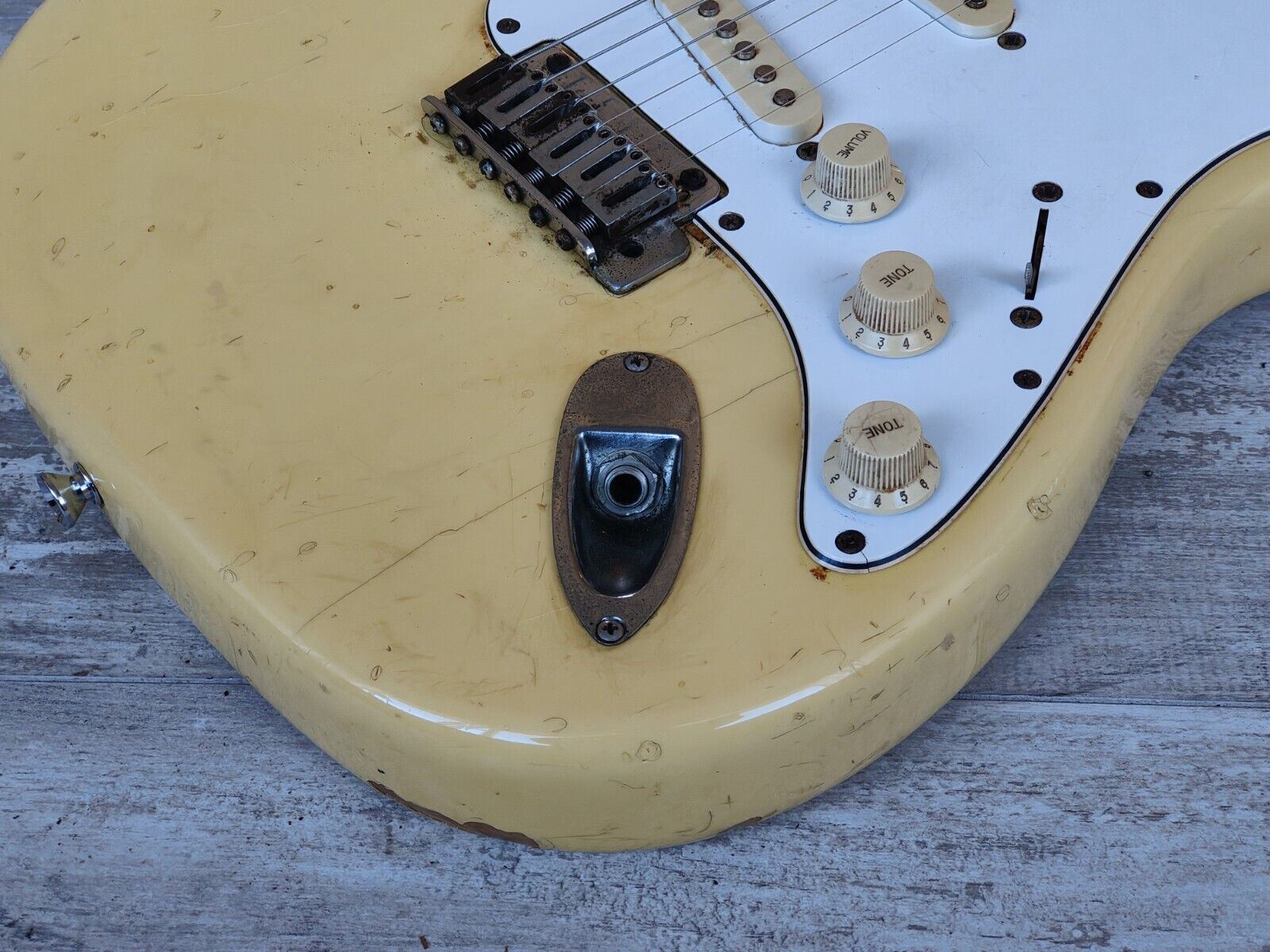 A high end Japanese made Stratocaster model from Fernandes that's seen one hell of a life. This FST-100 was made in 1990 and features a yellowed Vintage White finish with a maple neck and a 22 fret ebony fingerboard, weighing 3.4kg's. Loaded with a set of generic single coil pickups and an aftermarket pickguard.