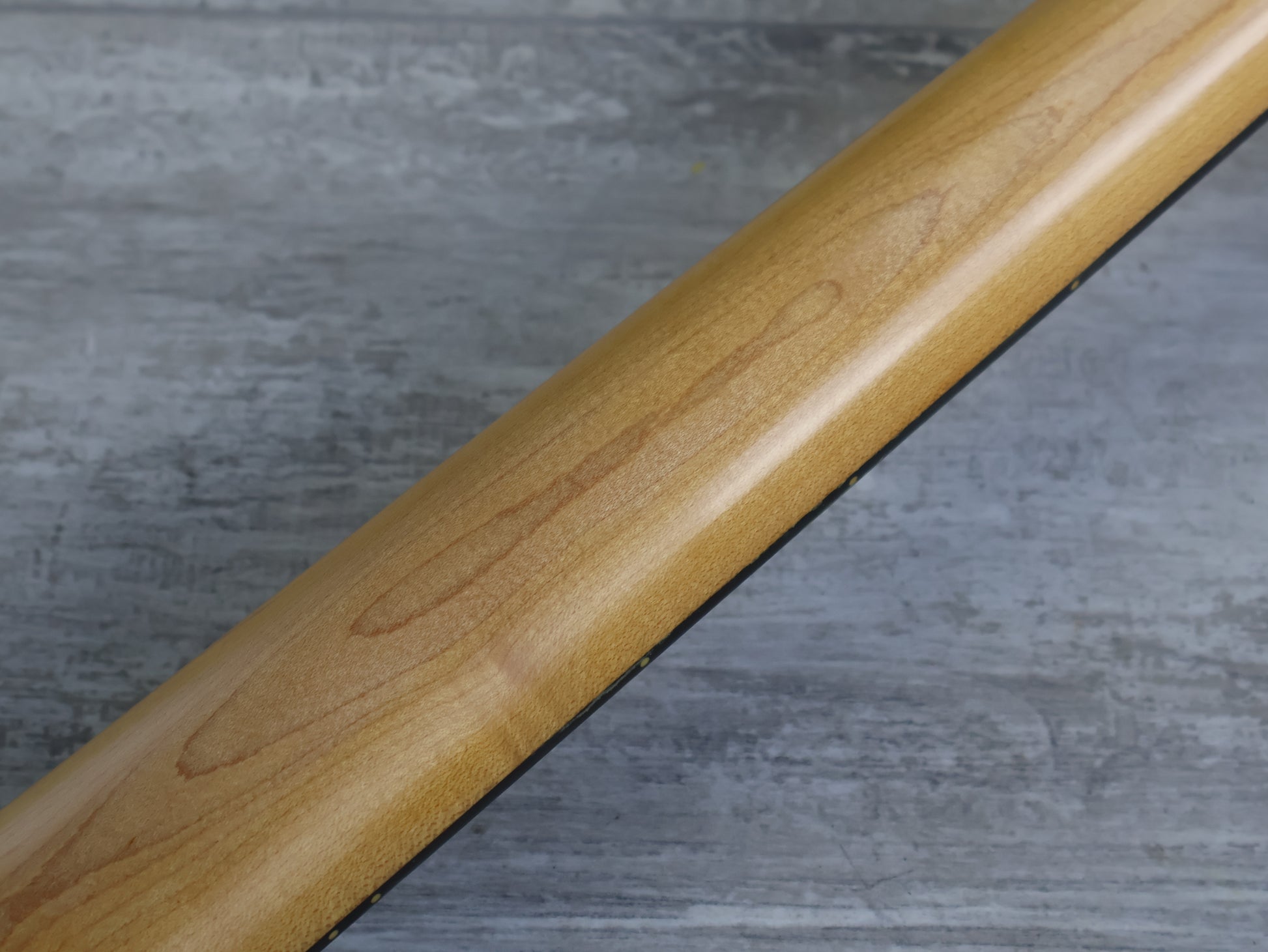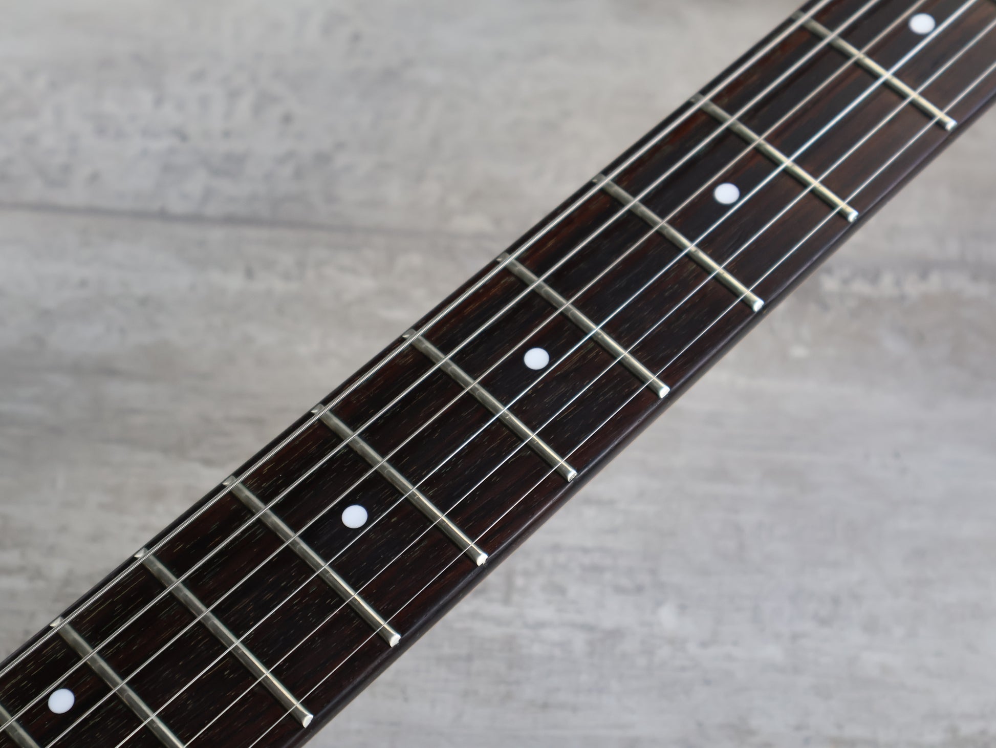 Made in Japan by Fernandes in 1990, the TEJ is an ultra-modern variation on the Fender Telecaster design. Basswood body bolted to a painted maple neck with a 22 fret rosewood fingerboard (13.75" radius, 648mm scale length, 43mm nut width), it weighs 3.5kg's.