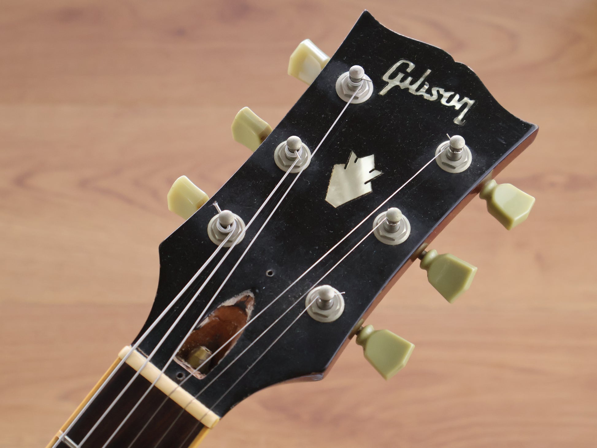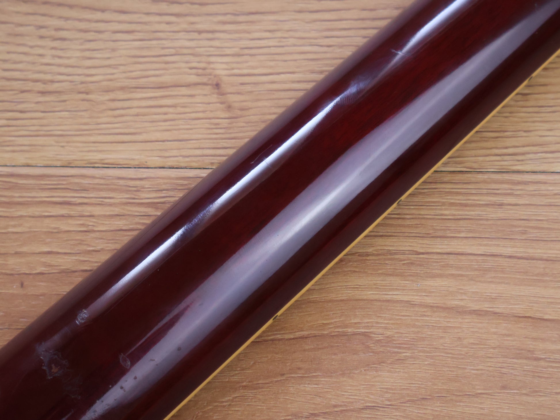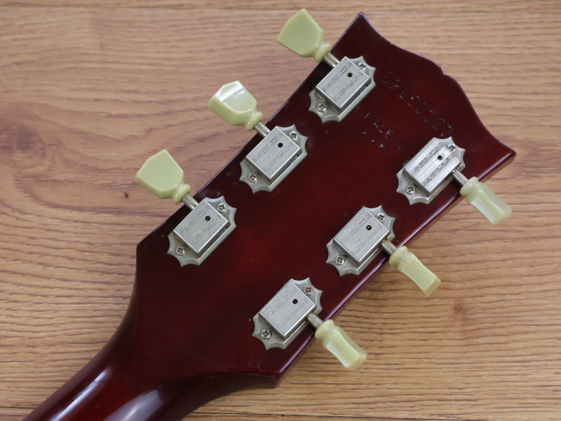One authentic replacement tuner and seemingly an aftermarket bridge as pictured, this one's in good used condition for it's age with some signs of wear but no breaks or repairs. The frets are shiny and smooth and the neck is straight with a fully functional truss rod. Missing the truss rod cover.